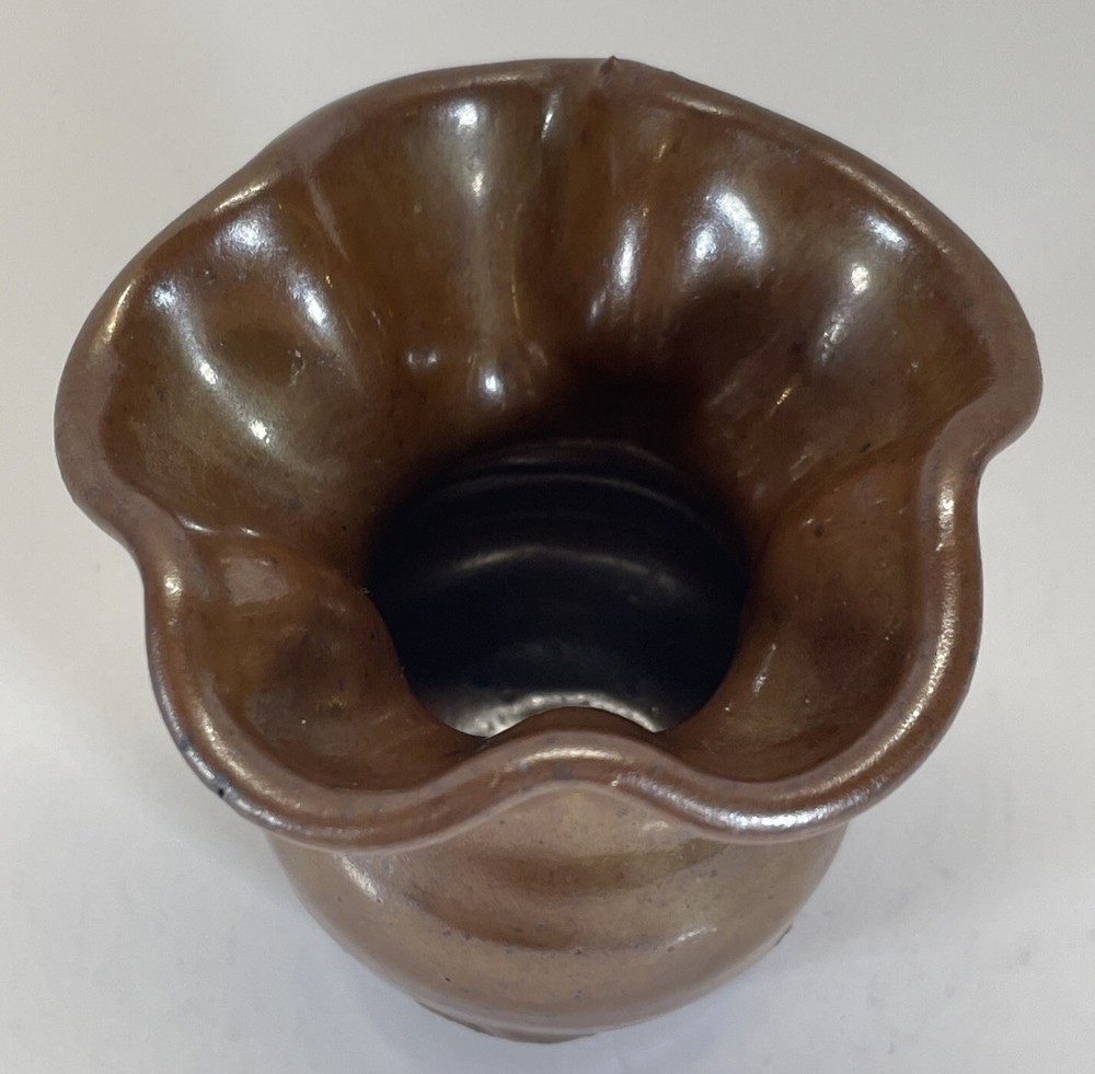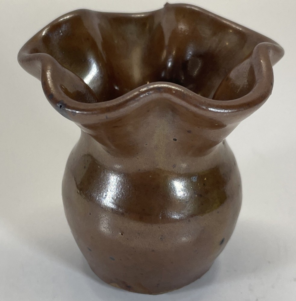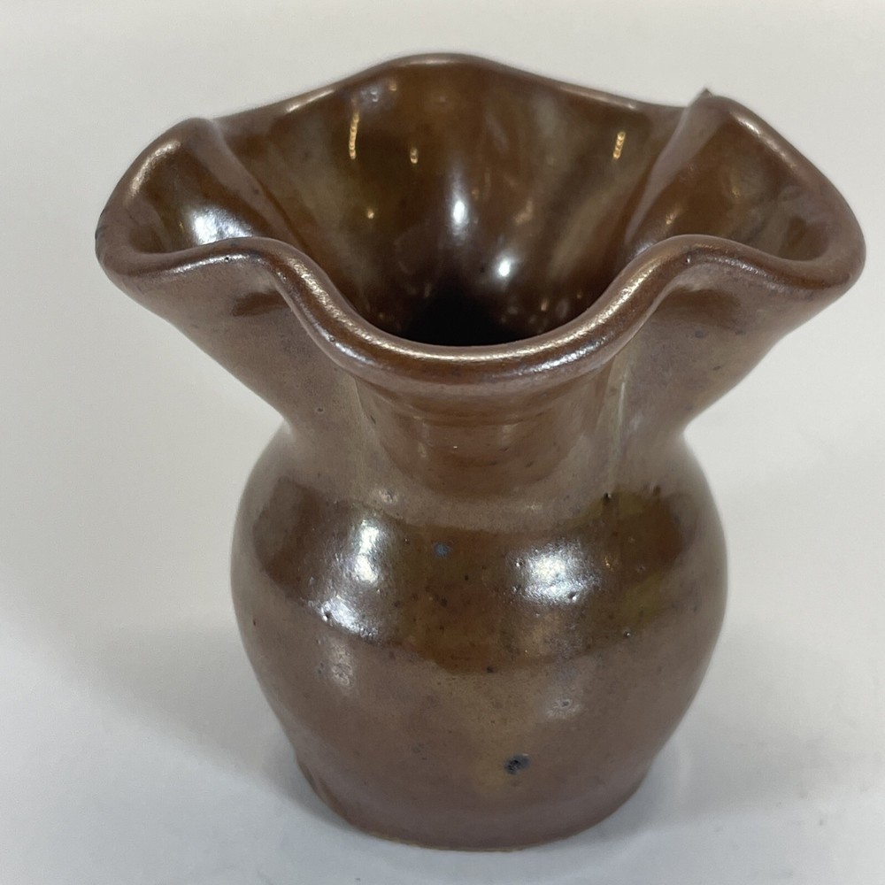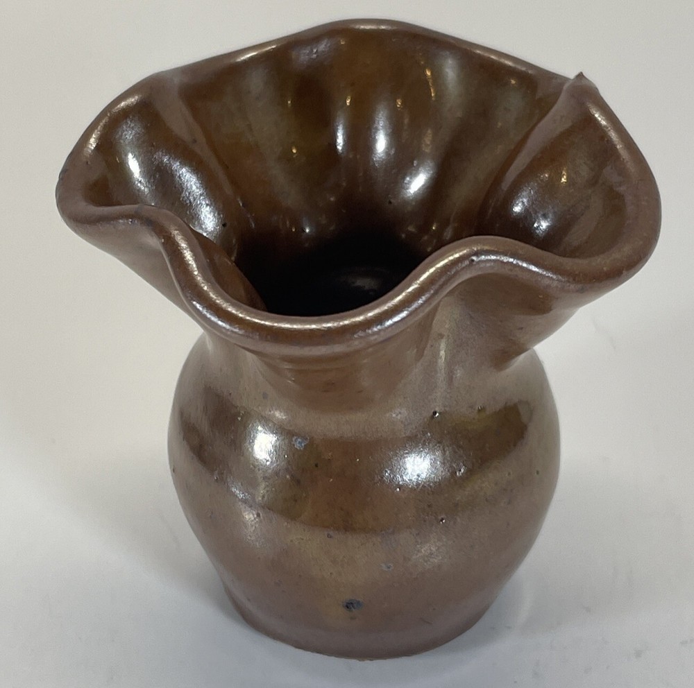 This vintage studio pottery vase is a unique addition to any collection. The brown color and flower-shaped top make it a charming piece for any home decor. It stands at 2.5 inches tall and is signed by the artist BH. The vase is an original piece and has an impressed backstamp. The material is clay and it was produced using the pottery technique. This small vase is perfect for displaying your favorite flowers or as a standalone decorative item. Good condition. No cracks or chips.