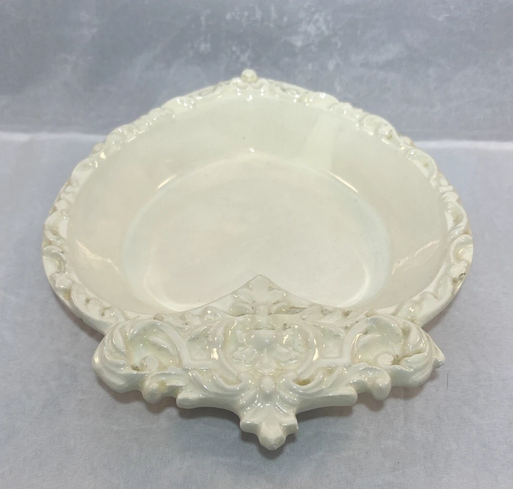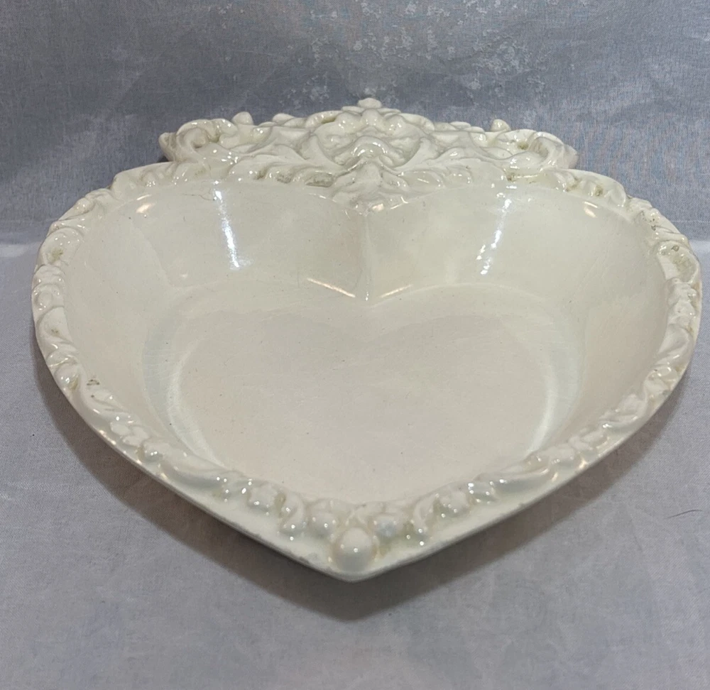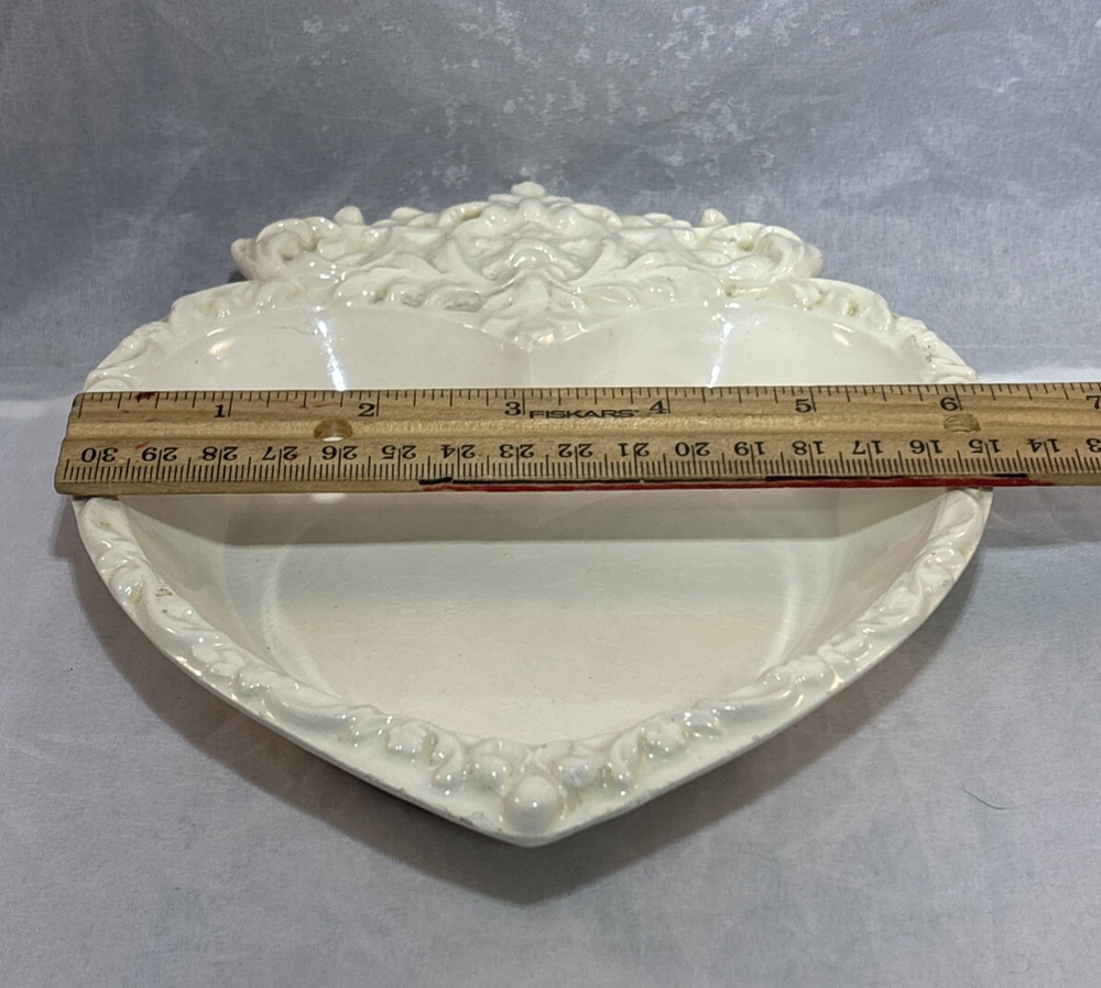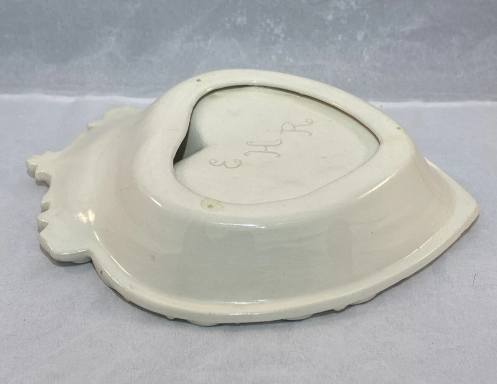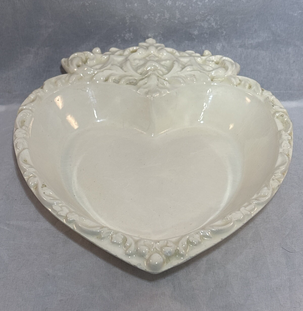 This is a gorgeous vintage trinket dish perfect to put in a Valentine's Day decor vignette, use as jewelry dish on your vanity or simply enjoy. There are a few minor chips that blend in pretty well. I have captured these with an orange pointer in several of the photos of the listing. Vintage Studio Pottery Heart Shaped Trinket Dish Ivory Ornate Scroll Trim Signed "EHR"