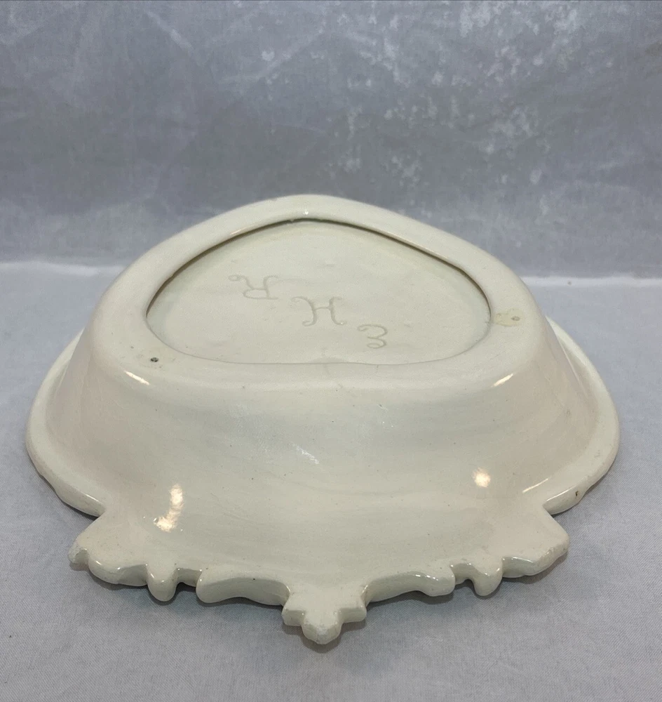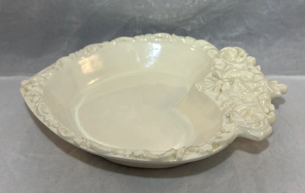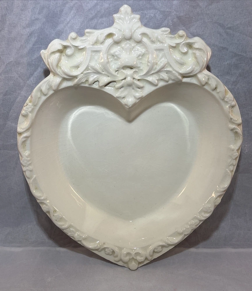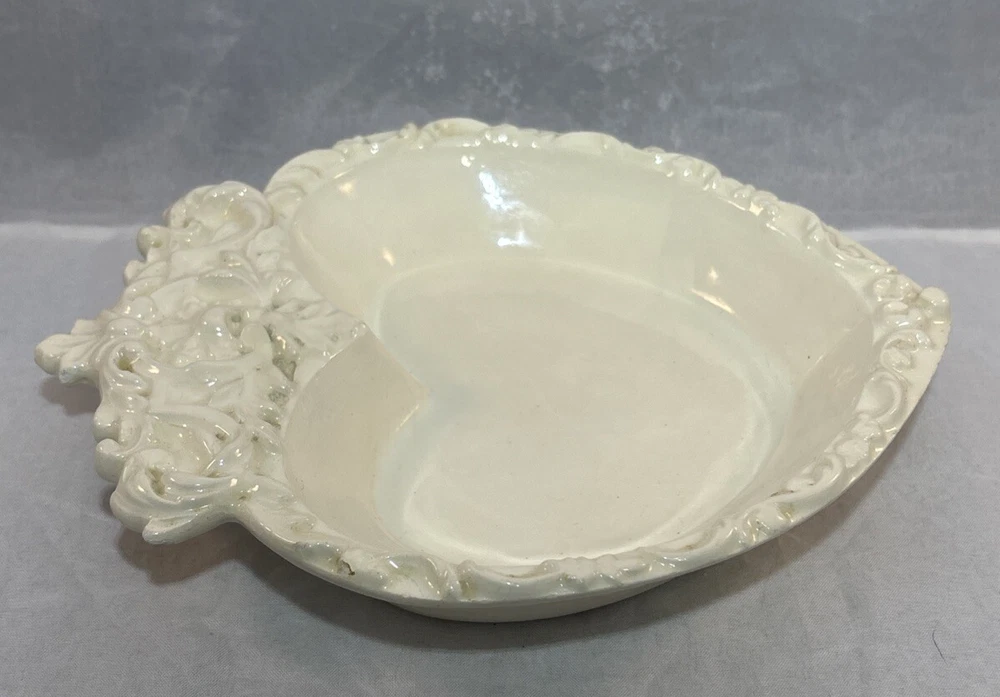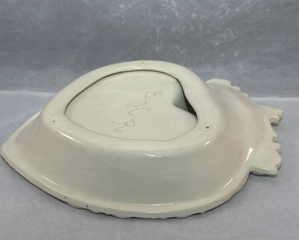 This is a gorgeous vintage trinket dish perfect to put in a Valentine's Day decor vignette, use as jewelry dish on your vanity or simply enjoy. There are a few minor chips that blend in pretty well. I have captured these with an orange pointer in several of the photos of the listing. Vintage Studio Pottery Heart Shaped Trinket Dish Ivory Ornate Scroll Trim Signed "EHR"