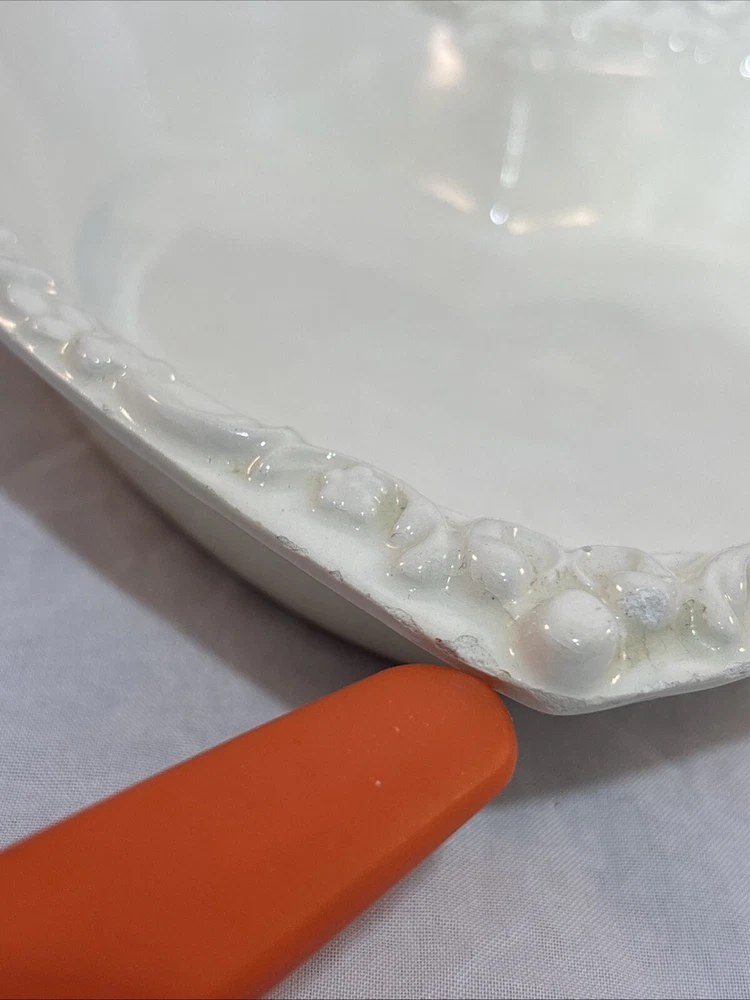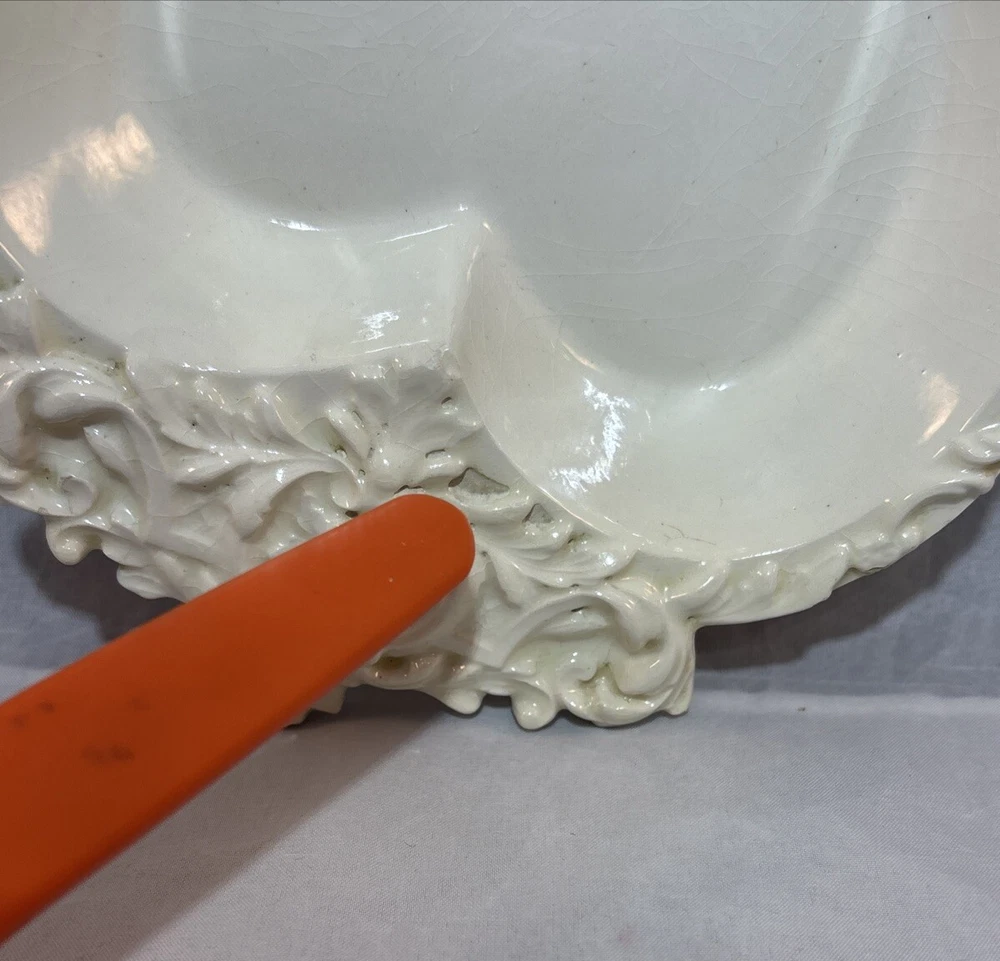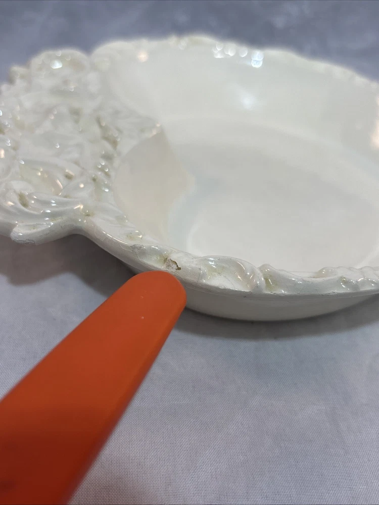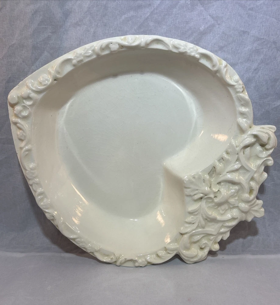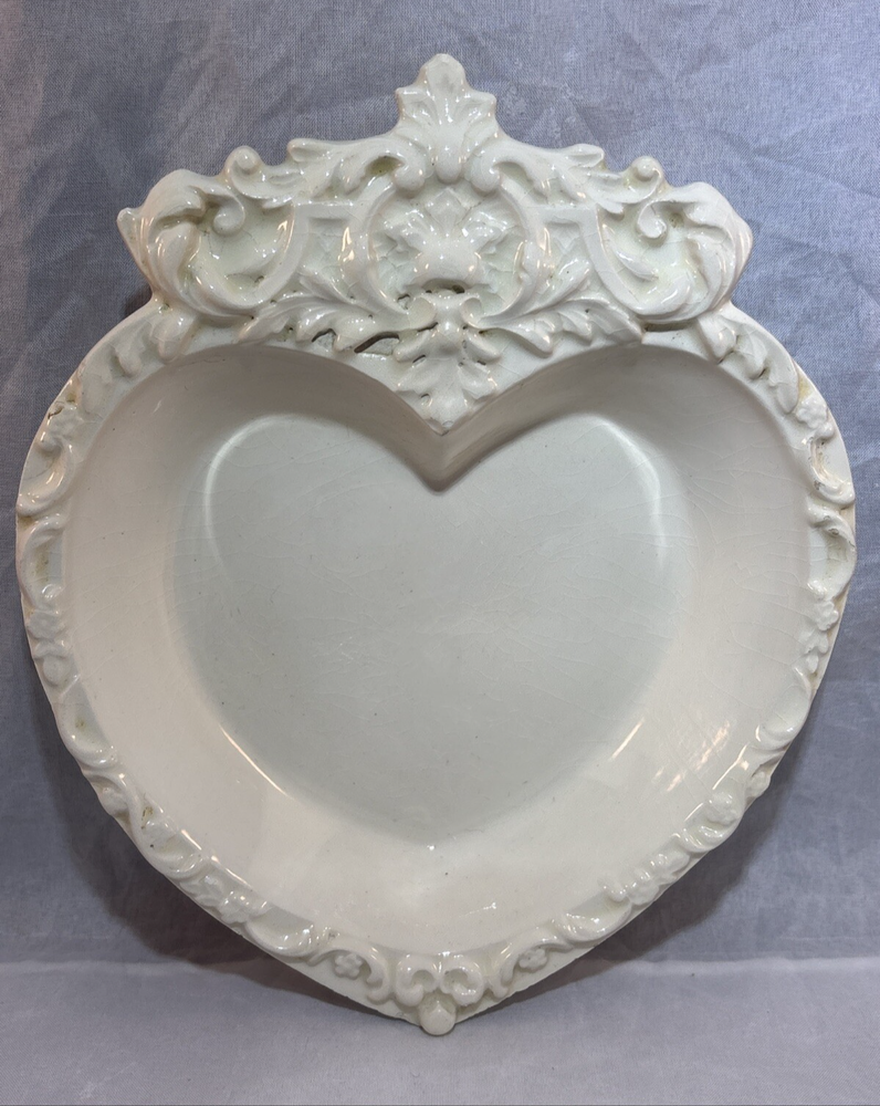 This is a gorgeous vintage trinket dish perfect to put in a Valentine's Day decor vignette, use as jewelry dish on your vanity or simply enjoy. There are a few minor chips that blend in pretty well. I have captured these with an orange pointer in several of the photos of the listing. Vintage Studio Pottery Heart Shaped Trinket Dish Ivory Ornate Scroll Trim Signed "EHR"