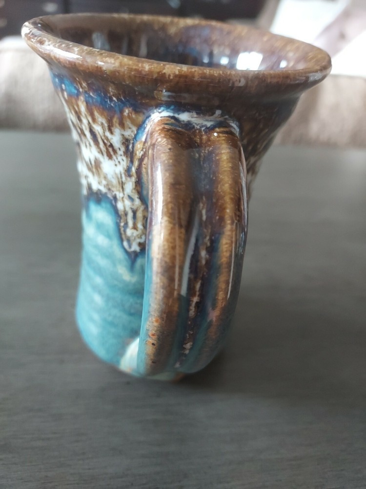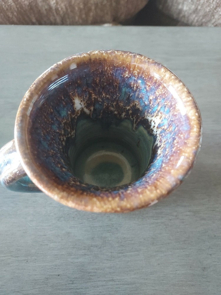 5." x 3.5" Handle No chips or cracks No Marked on bottom Glaze is done in brown, blue and milky white Vase shaped mug in Great condition