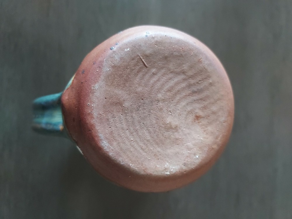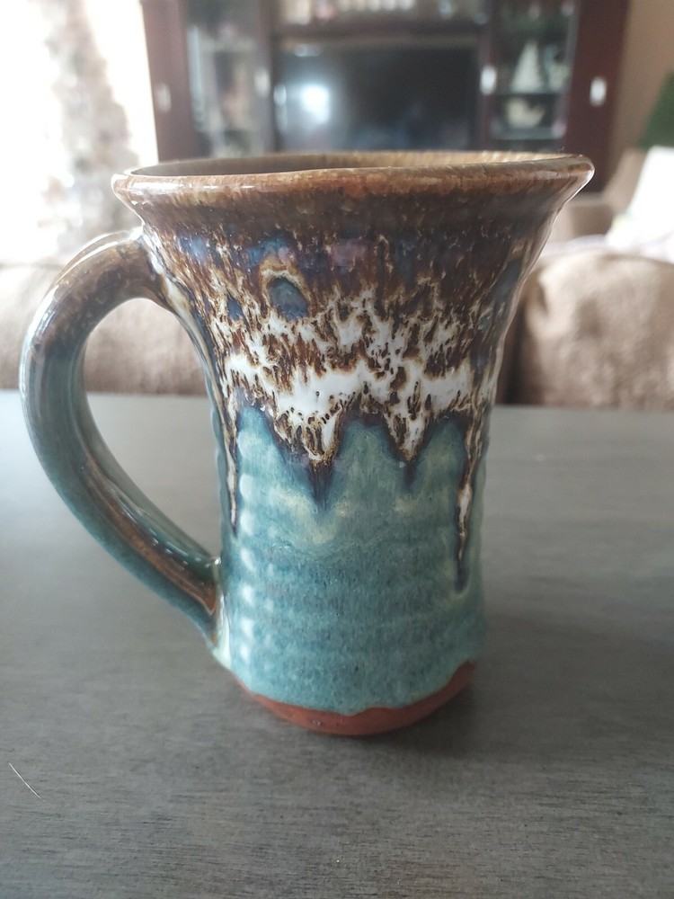 5." x 3.5" Handle No chips or cracks No Marked on bottom Glaze is done in brown, blue and milky white Vase shaped mug in Great condition...