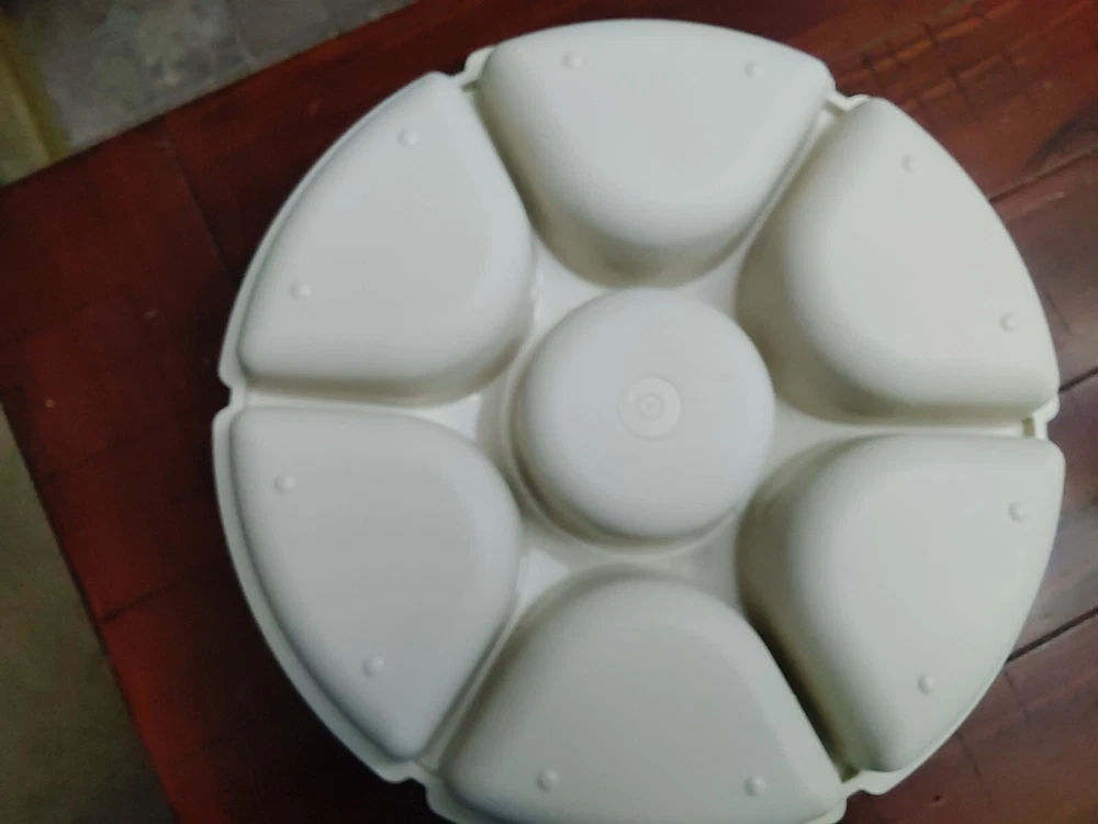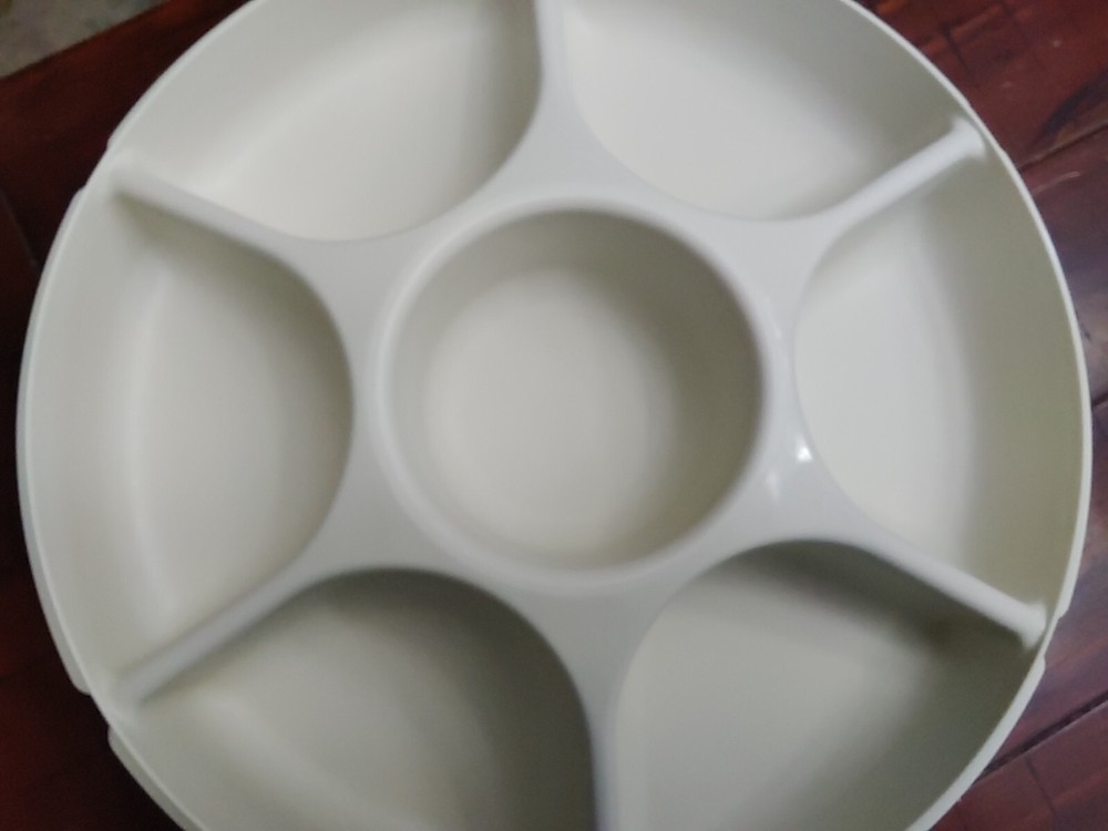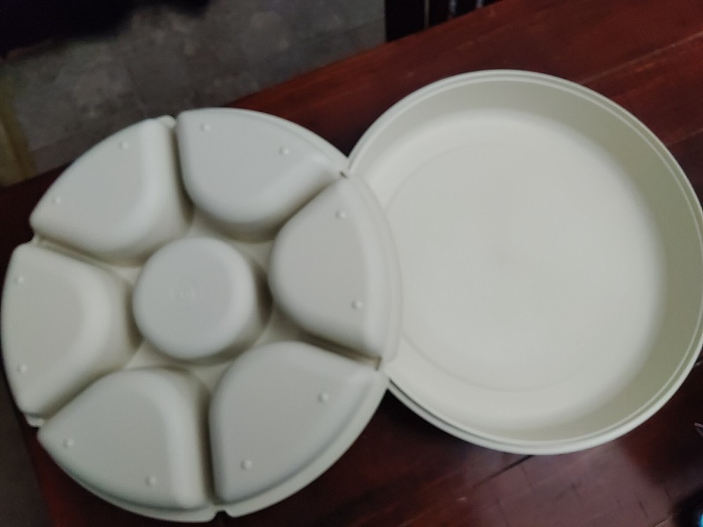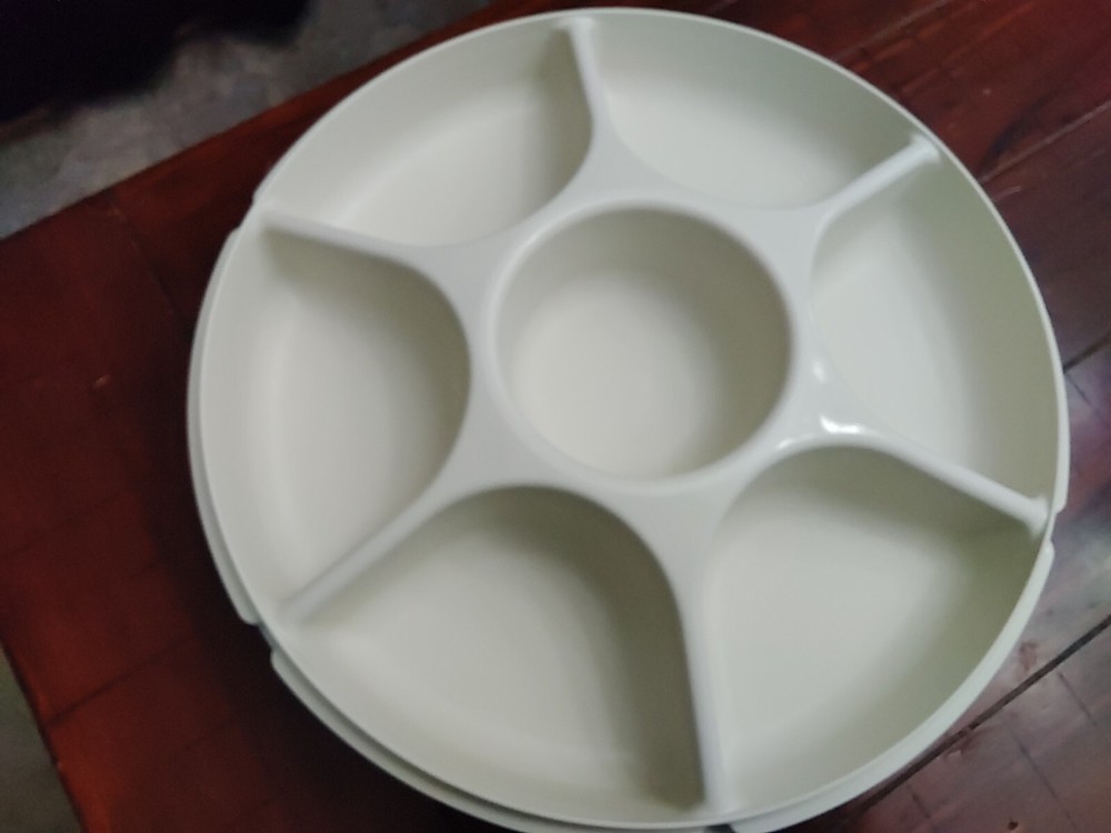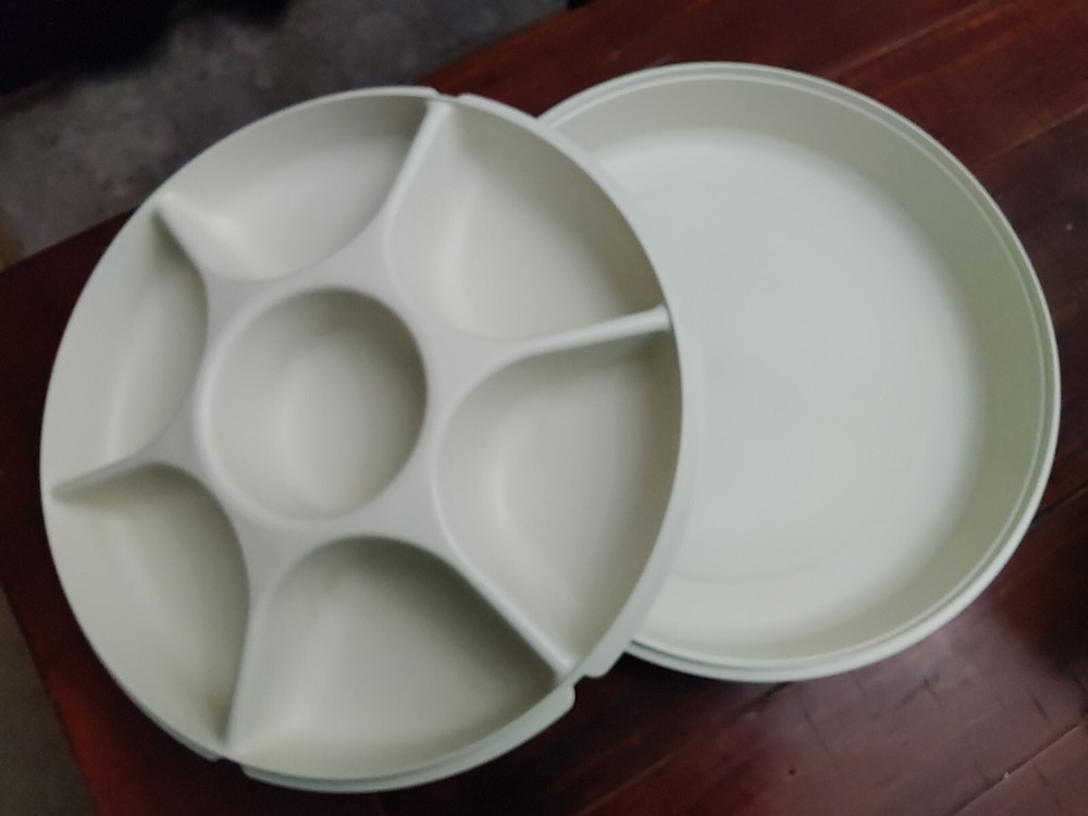 Elevate your party hosting with this vintage TUPPERWARE divided vegetable chip dip tray, complete with a convenient lid. Beige in color and shaped to accommodate a variety of snacks, this large round tray features more than five compartments, ensuring your appetizers are neatly organized and easily accessible. Crafted from durable plastic, this tray is a classic piece from the 1980s, showcasing the iconic Tupperware brand's retro style. Measuring 14 inches in length and width, with a height of 4 inches, it's perfect for those family game night or weekend get-togethers. The press-on lid ensures your snacks stay fresh and clean between uses, making this set a practical and stylish addition to your serveware collection.