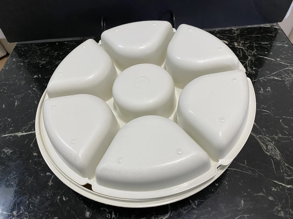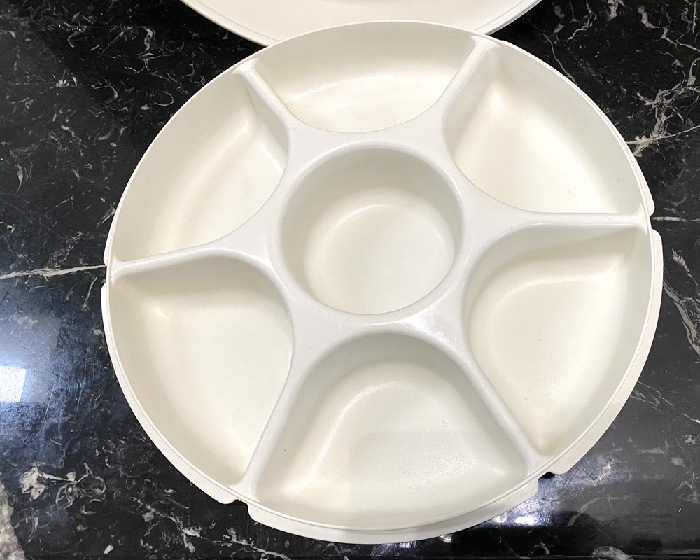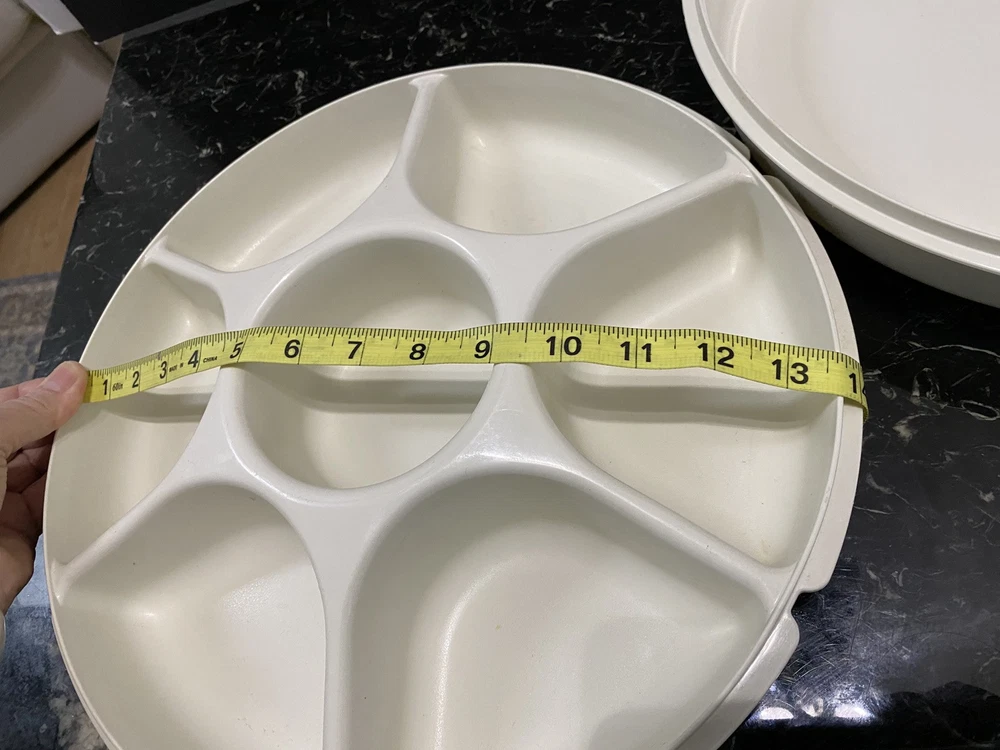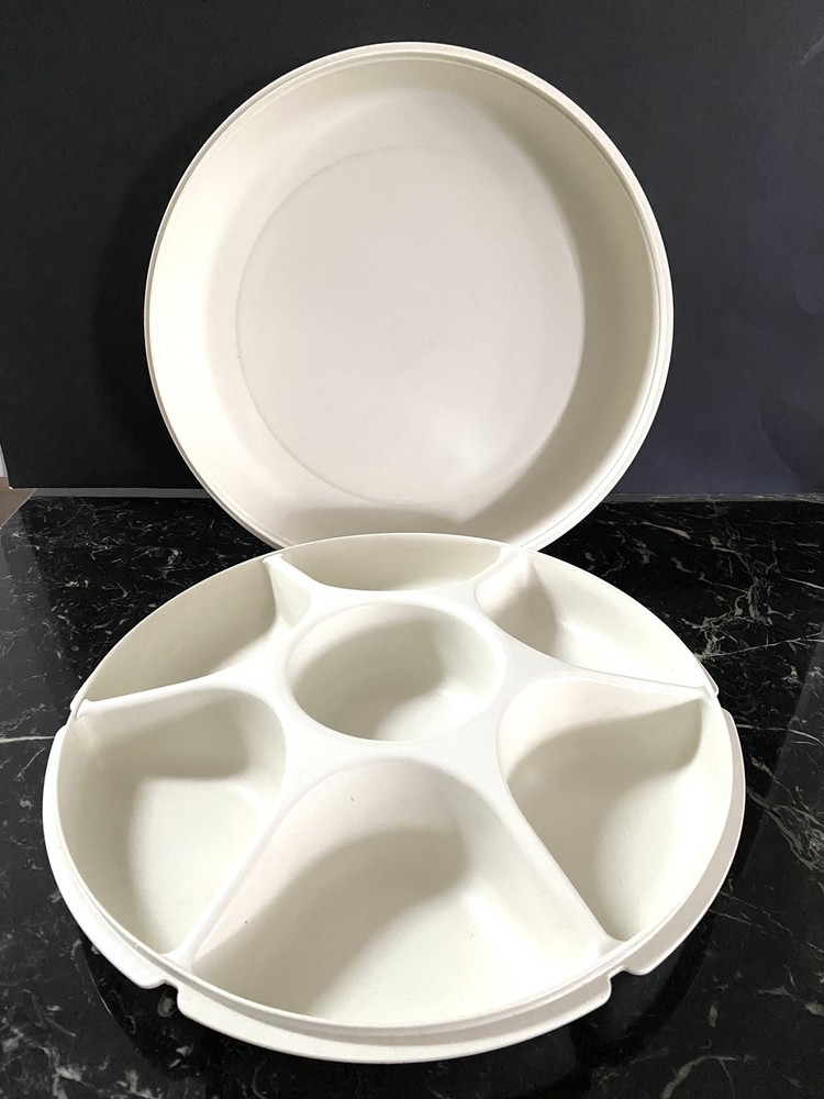В181. Vintage TUPPERWARE Divided Vegetable Chip Dip PARTY TRAY w/ Lid # 166-4 USA. In mint condition. All measurements and condition in my pictures. I tried to take photos so you can see all the details and sizes. Please think before paying as I do not accept returns. Feel free to ask questions. Pets and smoke free environment. Thank you.