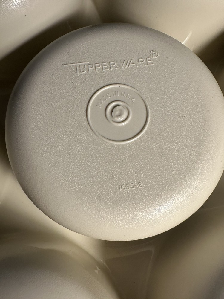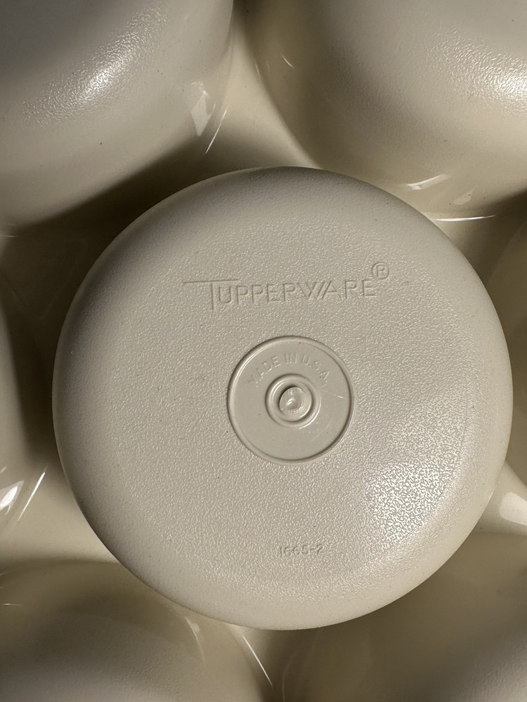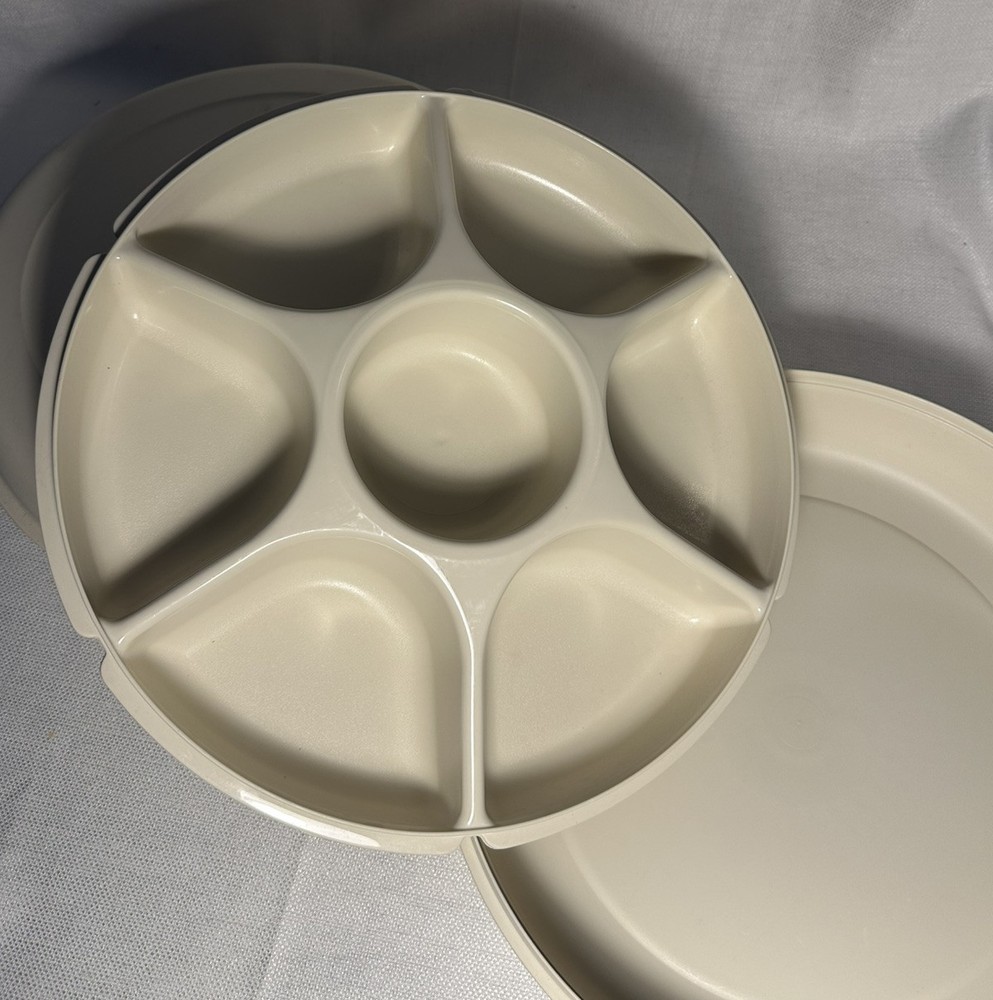 The Vintage Tupperware Large Serving Divided Dip Tray Set includes two round trays with lids, perfect for serving and storing snacks. The trays are cream in color with a solid pattern and feature a divided design for easy organization of different dips or snacks. The set is made by Tupperware, a well-known brand for durable and high-quality kitchen storage containers. Ideal for entertaining or everyday use, this set is a versatile addition to any kitchen.