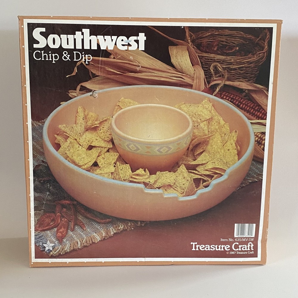 Vintage Treasure Craft USA Large Southwestern 2 Piece Chip And Dip Set. There are no chips or cracks. There is minor signs of wear. See all photos.