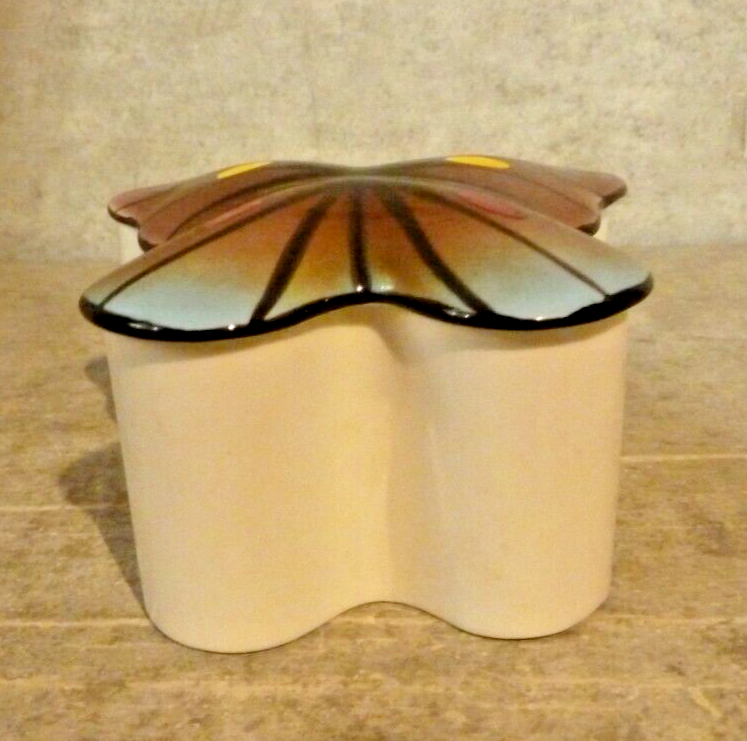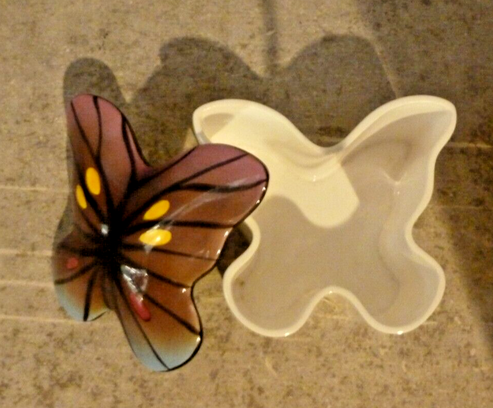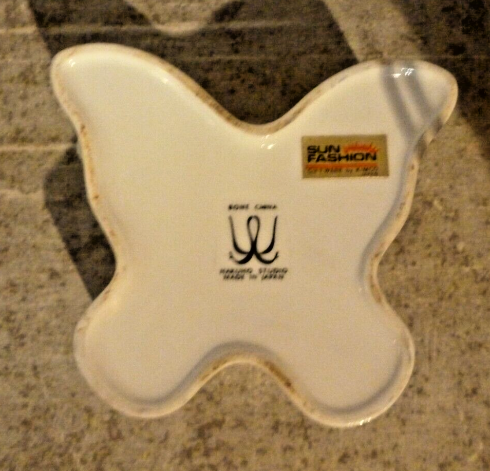 Vintage Trinket Box Butterfly Shaped Bone China Sun Fashion Hakuho Studio ### I do combine shipping, please contact me at the end of first item if you intend on bidding on other item's. Payment expected within 4 working day's or ebay will automatically open an unpaid item case. I do my best to make sure descriptions are accurate and that items are free of defects, stain free and odor free or indicate otherwise so please observe pictures well & ask any questions you may have . Please contact me prior to leaving a negative or neutral feedback if you have any issues so we can resolve any problem's because I am far from a professional. ***Check out my other listings for great deals on similar items*** This vintage trinket box is in the shape of a butterfly and made of bone china by Sun Fashion Hakuho Studio in Japan. The intricate design features delicate details and craftsmanship, making it a collectible piece perfect for storing small treasures. While not handmade, the box exudes a sense of elegance and charm with its unique butterfly shape. Perfect for adding a touch of vintage flair to any vanity or display area.