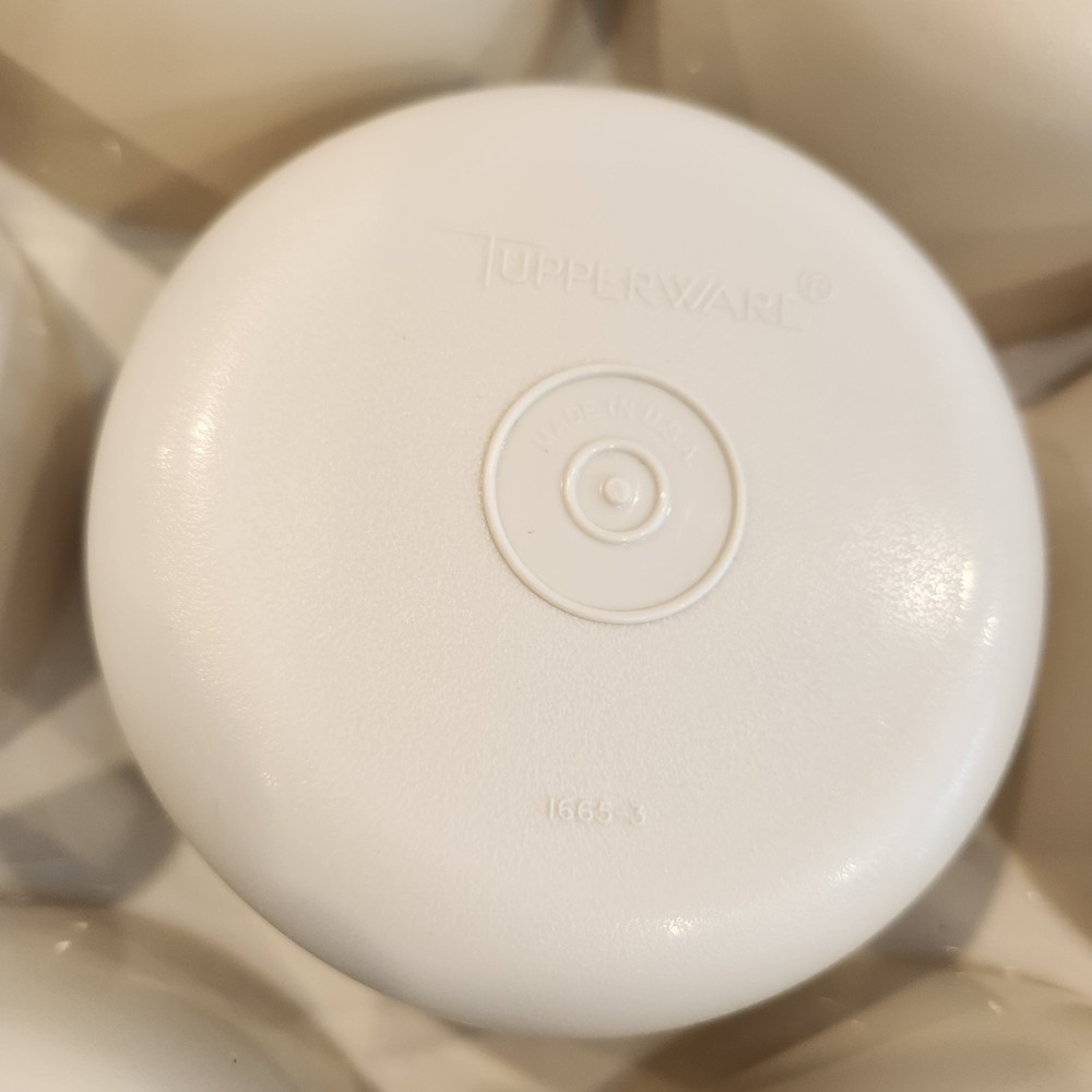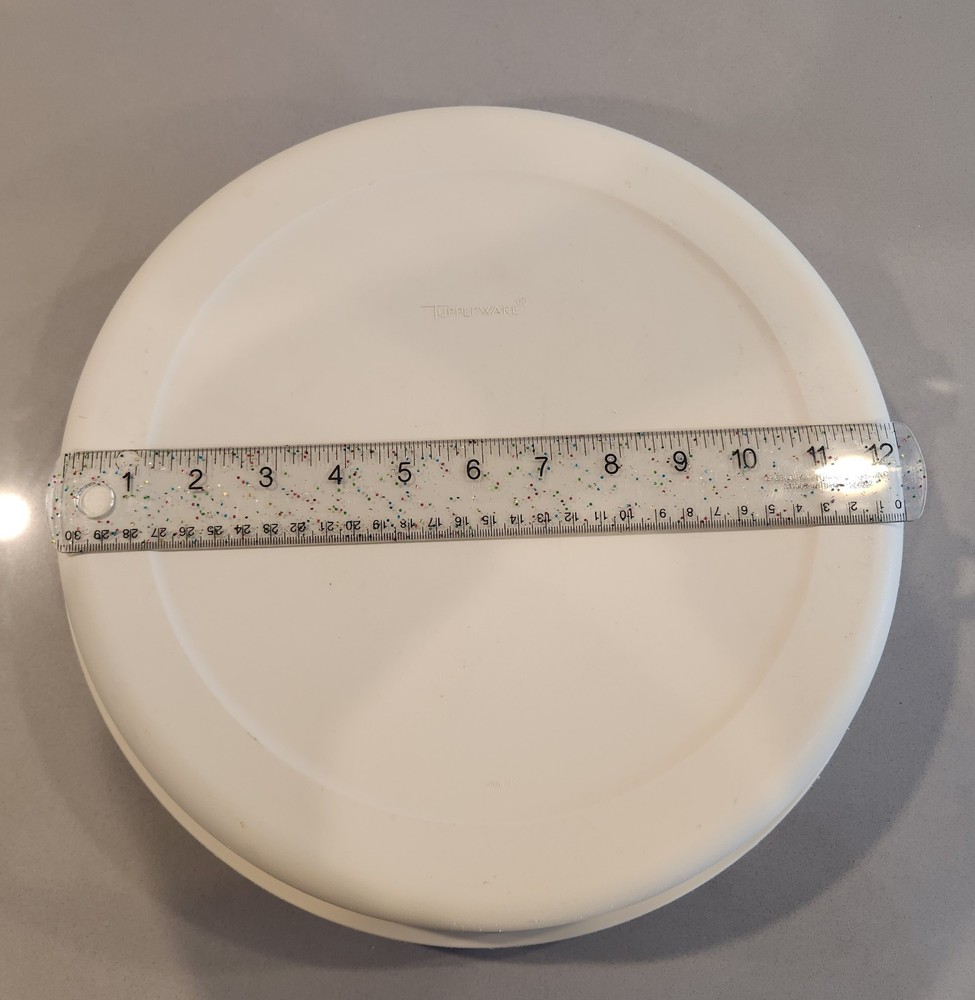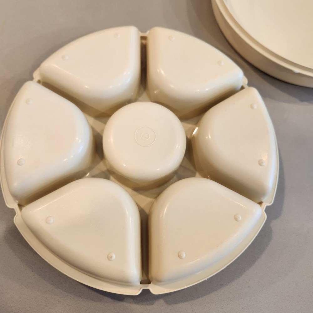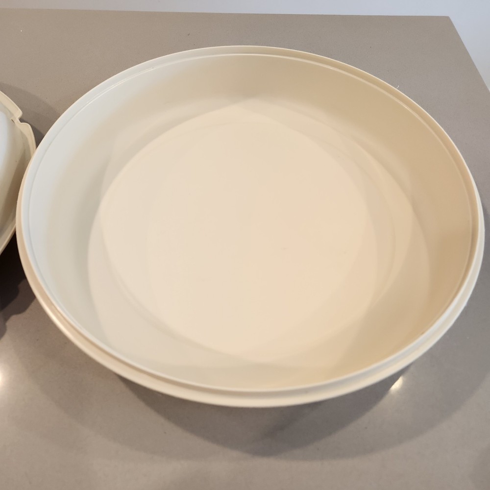Add a vintage touch to your party with this Tupperware 1665 1666 Almond 2-Piece Serving Tray. The tray is made of durable plastic and can be used for serving chips and dips. The tray is round and measures 14 inches in length and width, with a height of 4 inches. Used nice condition. No funky smell.