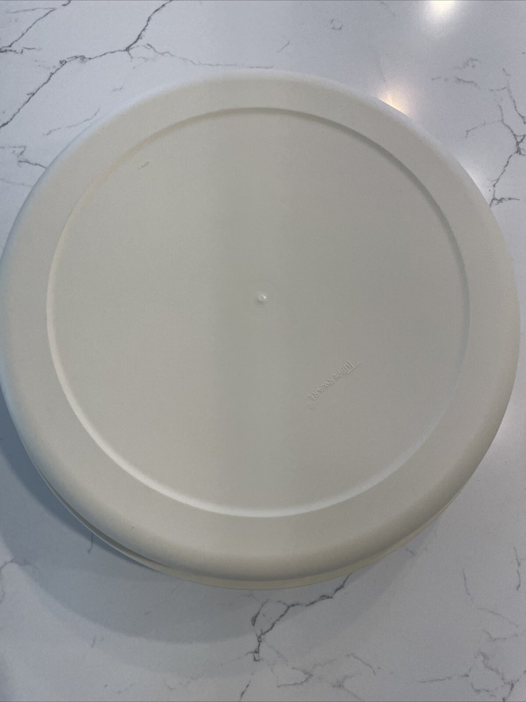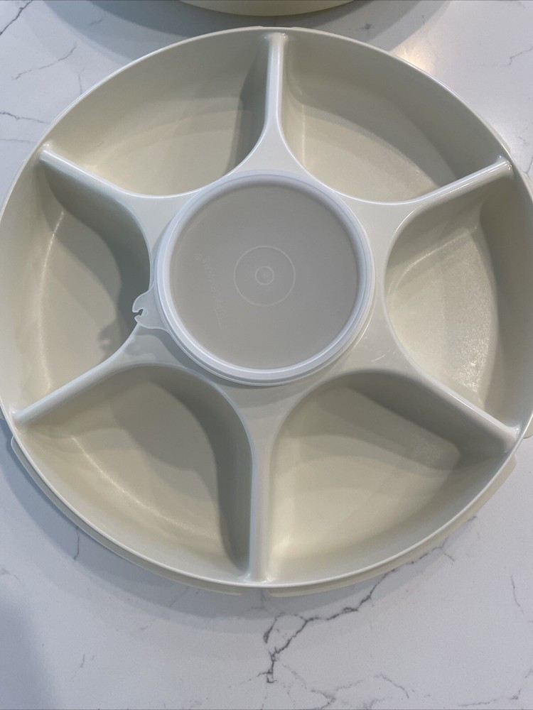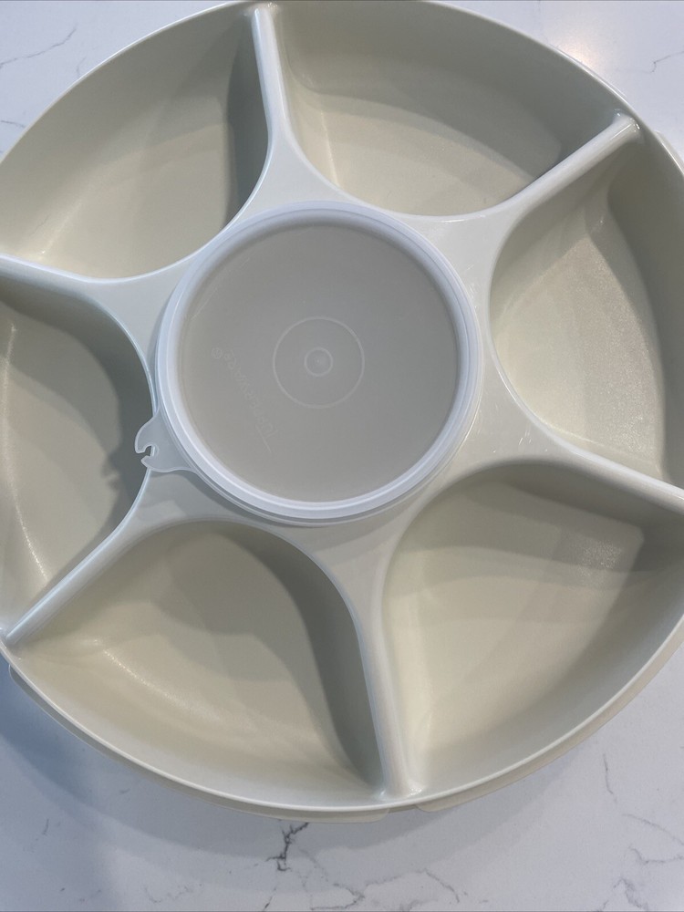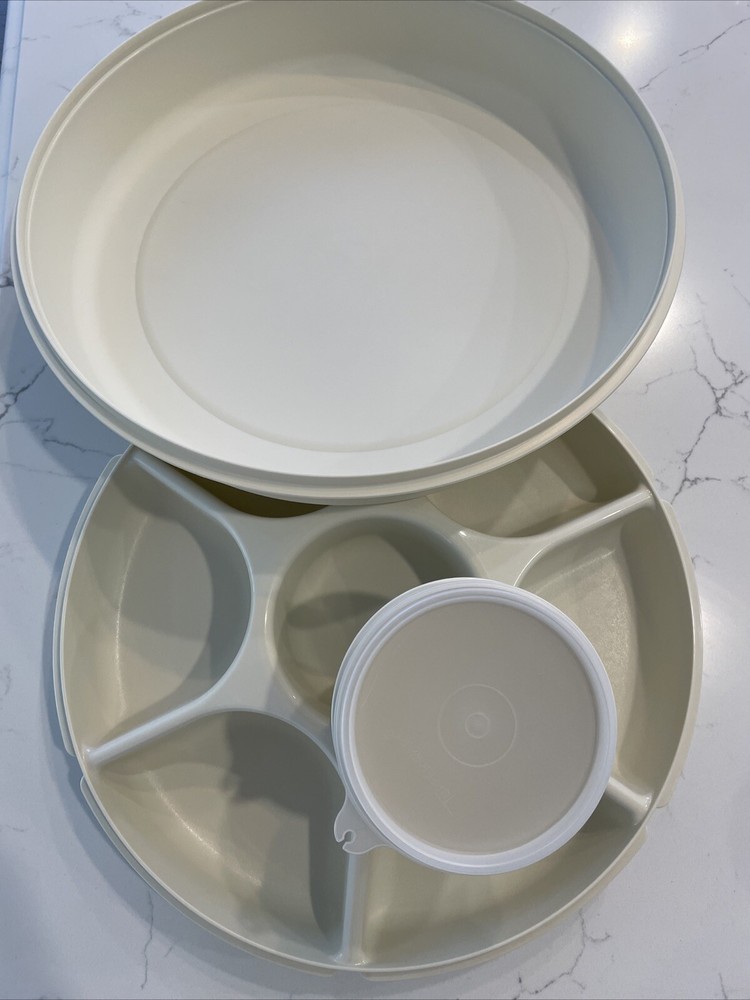 This vintage Tupperware serving tray is a must-have for any kitchen. With a large round shape and multiple slots for serving vegetables and dips, this tray is perfect for any occasion. The tray comes with a snap-on lid and a dip container and lid, making it easy to keep your food fresh and organized. Made of durable plastic, this Tupperware serving tray is break and chip resistant, shatterproof, and odor-resistant. The tray is also easy to clean and multipurpose, making it a great addition to any kitchen. Whether you're serving food at a party or just need a reliable tray for your everyday meals, this vintage Tupperware serving tray is the perfect choice.