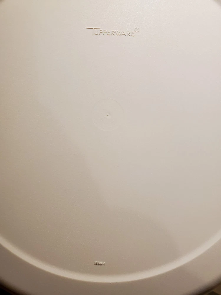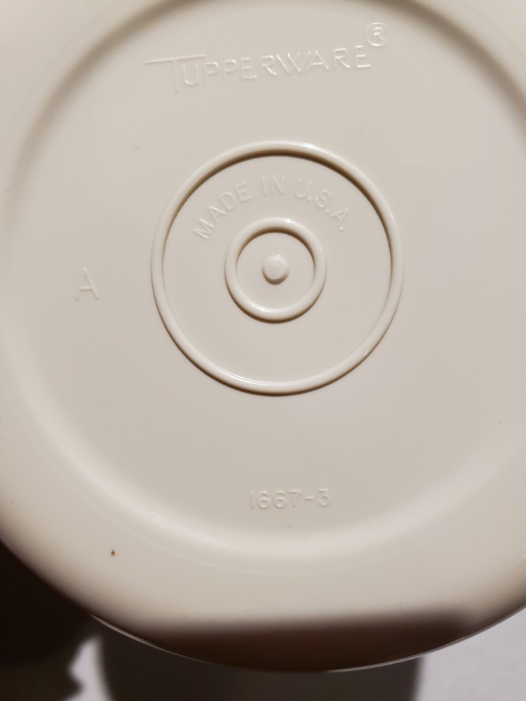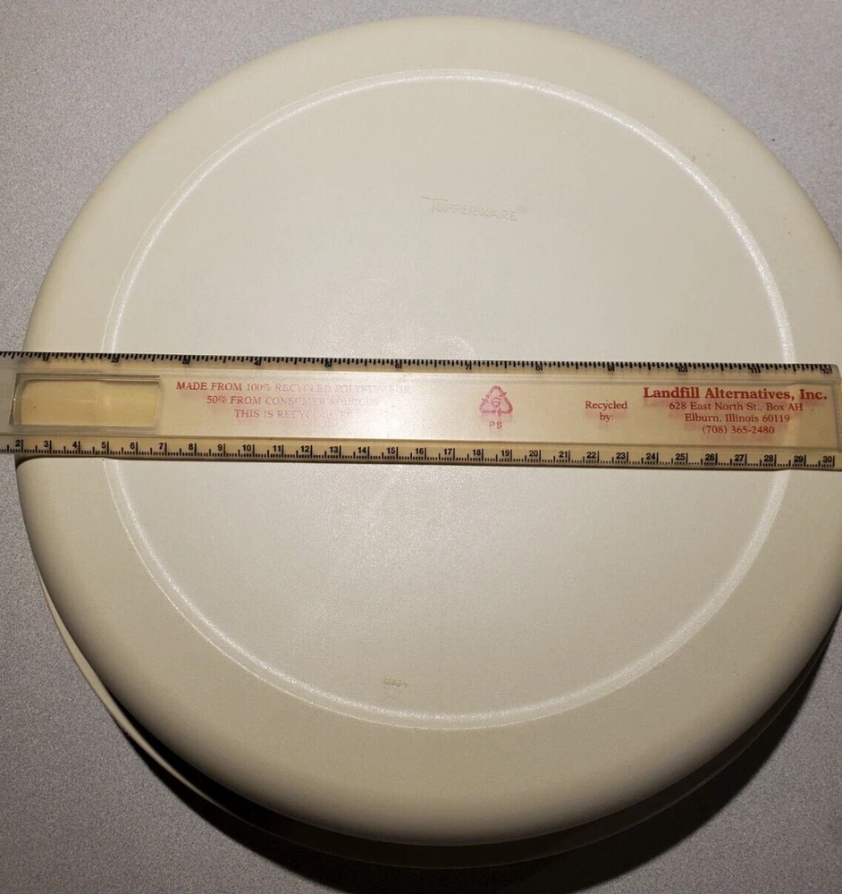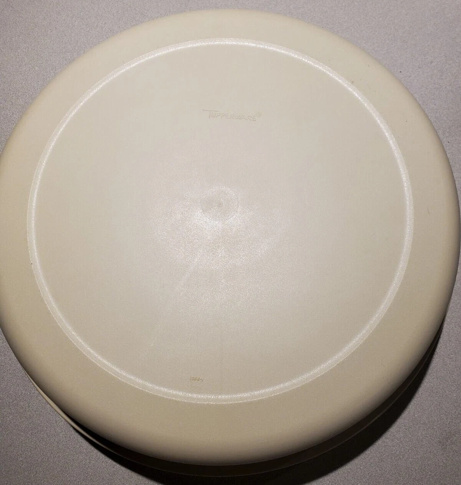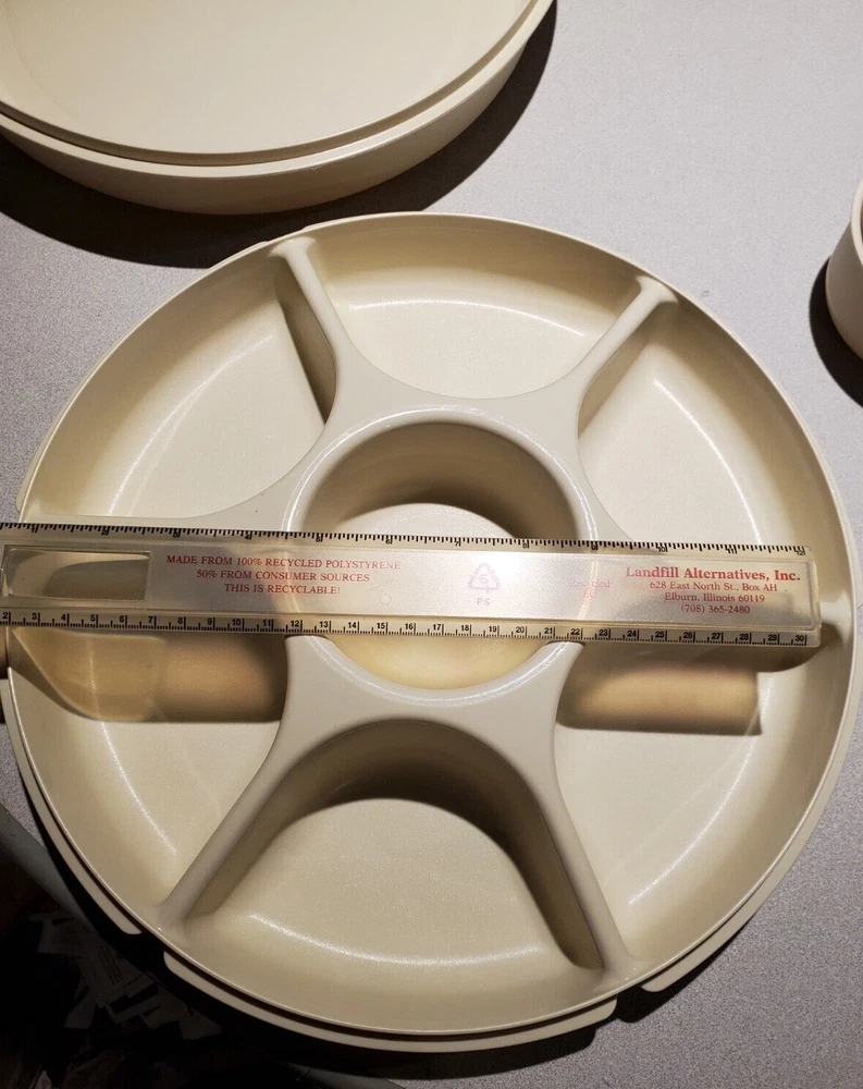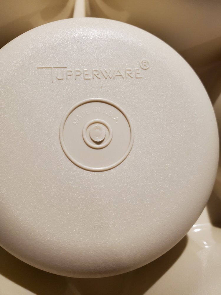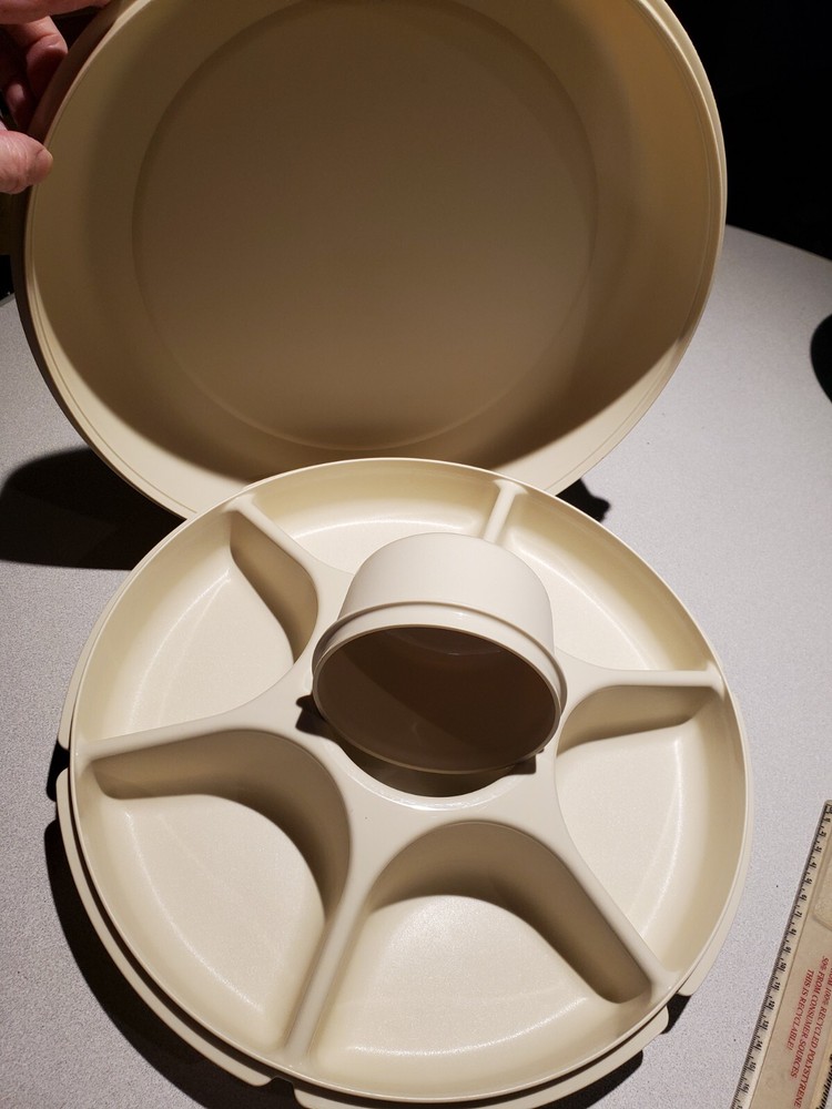 I do not offer shipping outside of the 50 US states. I accept ebay pay only. Buyer must pay within 4 days of purchase. No Returns The sturdy Tupperware Veggie, Fruit, Chip, Dip Tray is so useful for parties and gatherings! This one is beige, the base is # 1665-1, it measures about 14 inches across. The dip bowl # 1667-3 is about 4.25 inches across. The lid in # 1666-1 and measures about 14.25 inches across. The set is in excellent condition- no chips or cracks- I can find no flaws. See Pictures. I have other Tupperware items for sale so check out my other listings!
