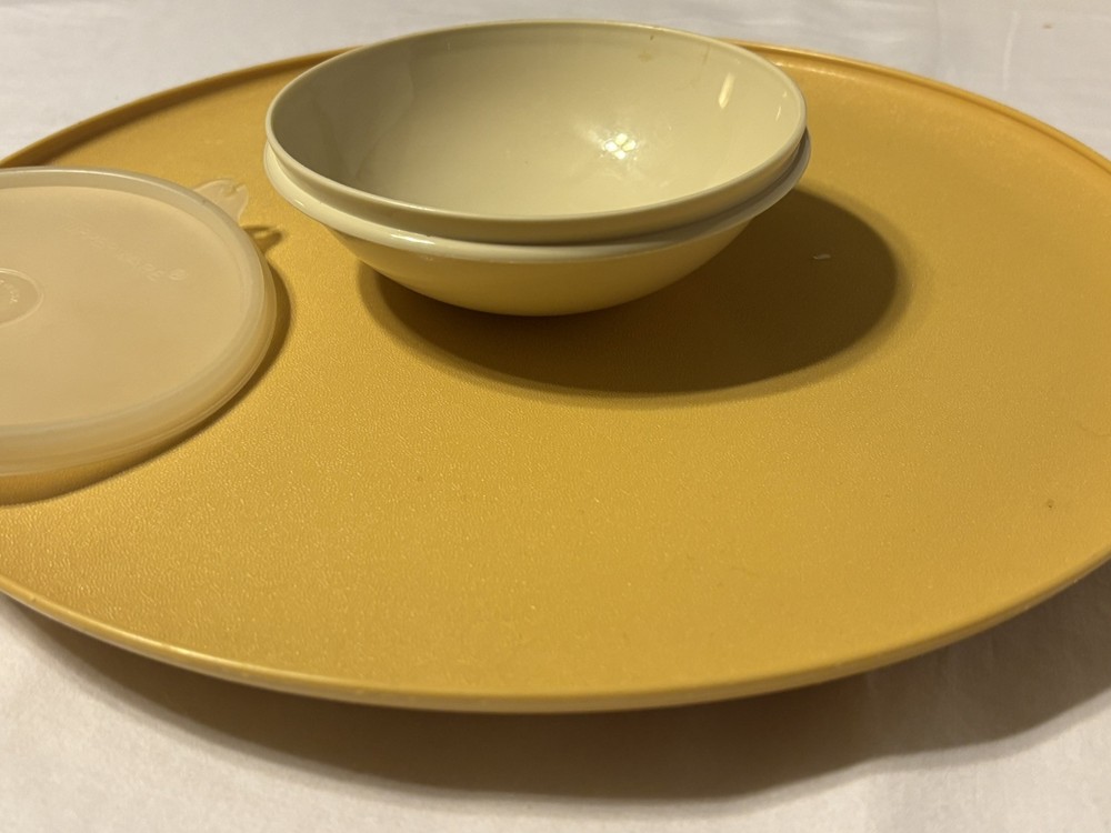 Vintage Tupperware 492-3 Dip-n-Serve Chip and Dip/Veggie Server Tray Bowl & Lid. This large round tray set includes a snap-on lid, ideal for serving chips, dips, and veggies. Made of yellow plastic, it features a solid pattern and measures approximately 13.5 inches in diameter. The Tupperware tray is reusable, easy to clean, and a retro original design from the United States.