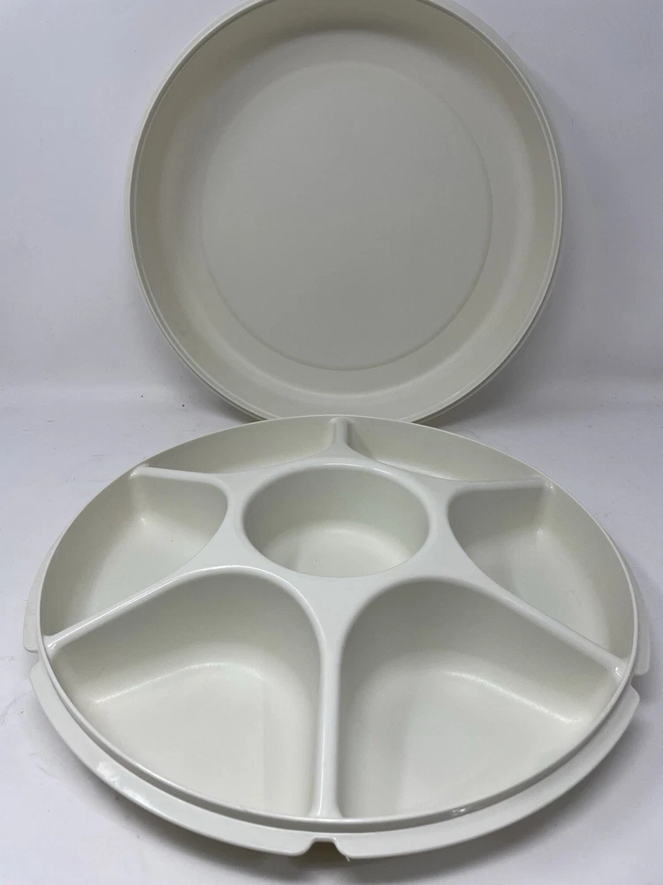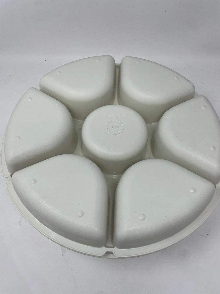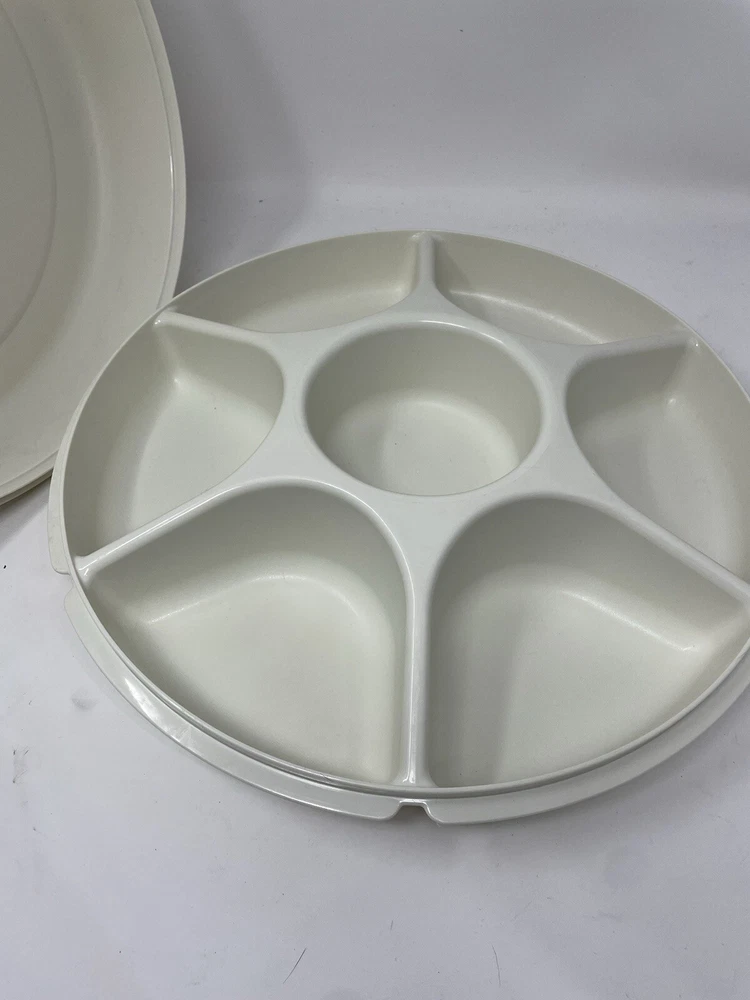 This vintage Tupperware serving tray is a must-have for any kitchen. The round tray features six compartments, each with a matching lid, making it perfect for serving chips, dips, veggies, and fruits. The large beige tray is an original piece and is dishwasher safe for easy cleaning. With its airtight and reusable design, this Tupperware tray is a great addition to any collection. The set includes a dip bowl/lid and six individual lids, all of which are vintage and have a retro style. Whether you are looking to serve snacks or store leftovers, this tray is perfect for you. ⭐️FREE SHIPPING⭐️ (F)