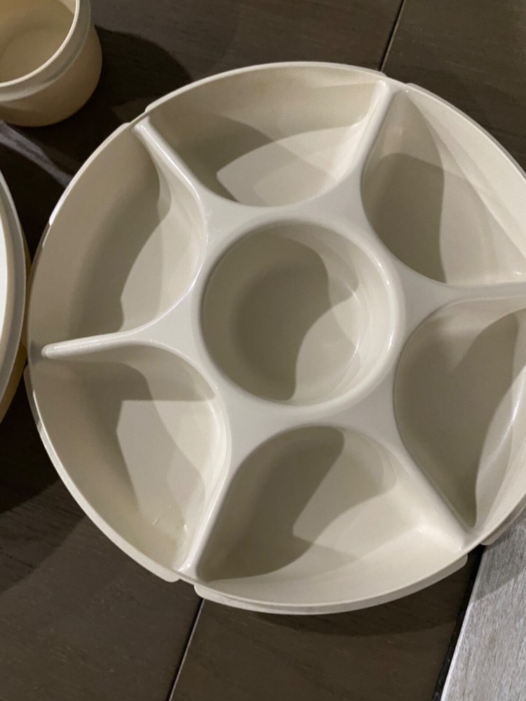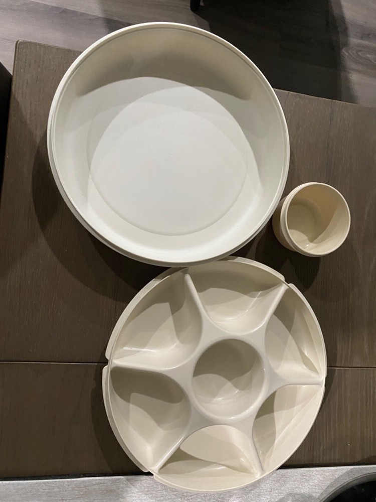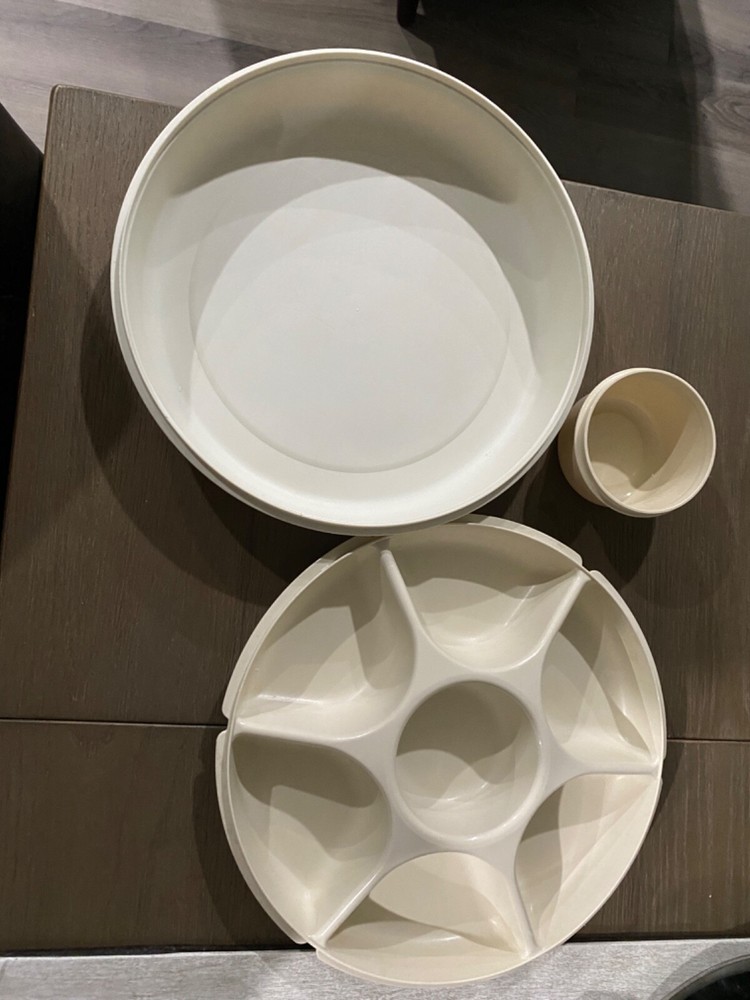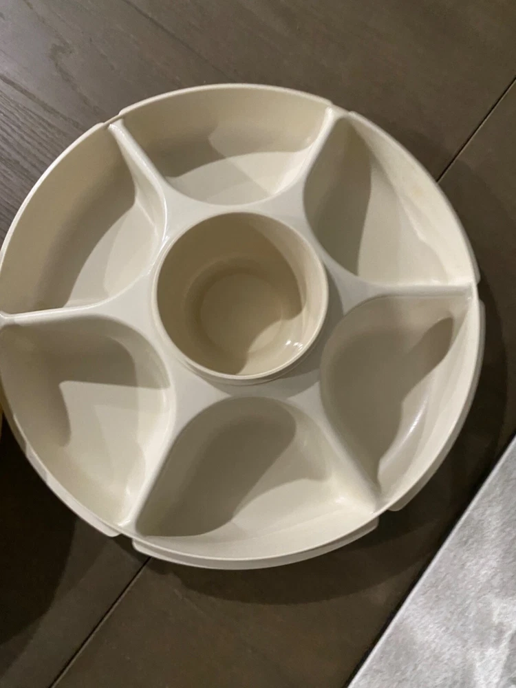 Vintage Tupperware 7 Total Divided Sections, Great for Vegetables, Fruit, Taco Toppings, Chip And Dip, etc. Serving Tray With Lid. Includes Separate Bowl for Dips or Sauces. 3 Piece Set. Some wear See...