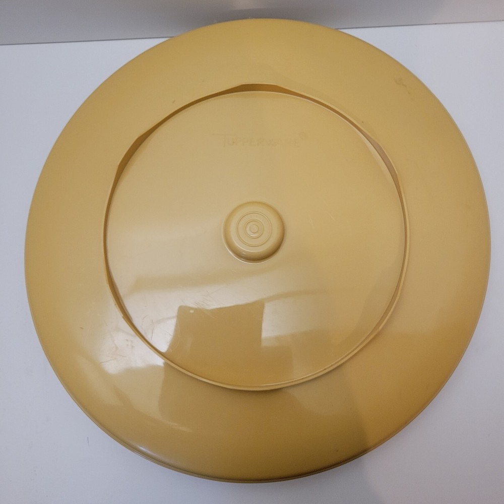This vintage Tupperware chip and dip serving tray is a must-have for any collector or lover of retro kitchenware. The round tray features a snap-on lid and is made of durable plastic in a beautiful harvest gold color. Measuring approximately 14 inches in length and width, with a height of 3 inches, this large tray is perfect for serving dips, chips, and other snacks. The tray also comes with a separate bowl and seal, making it easy to store and serve your favorite dips without having to worry about them going stale. The airtight lid ensures that your food stays fresh for longer, and the reusable tray is easy to clean and maintain. This original, licensed reproduction from Tupperware is a great addition to any kitchen or collection.