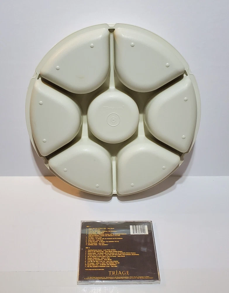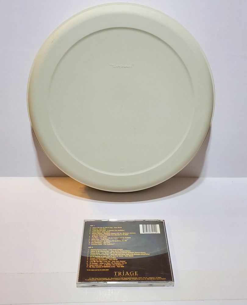Vintage Tupperware 7 Dip Bowl Vegetable Platter With Cover No lid on Inner Small removable Center Bowl 13 1/2" Diameter Main Bowl 4 1/4" Smaller Bowl- No Lid Assembled Height 3 3/4" CD for size comparison only. We only ship within the continental USA. We do not ship to Alaska, Hawaii, Puerto Rico, APO addresses or any other USA territory. All items 3ozs. or more with packaging will have a shipping tracking number. All items come from a smoke free home. No payment within 24hrs. of an item constitutes non-interest of that item and will be immediately relisted. Measurements listed are +/- .25 inches. All used item's are sold "as is." When multiple items are purchased at the same time, I will combine shipping to save you, the buyer some money. A refund, if applicable, will be sent to buyer after shipping. I pride myself in excellent customer service. My pricing of each item sold is very competitive with similar items and for this reason, I do not offer free shipping. Please feel free to contact me if any questions arise. Thank you very much for shopping with barkeep911.