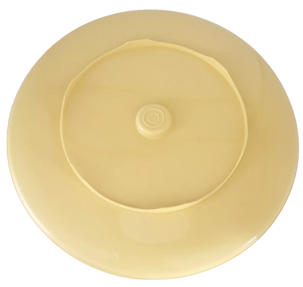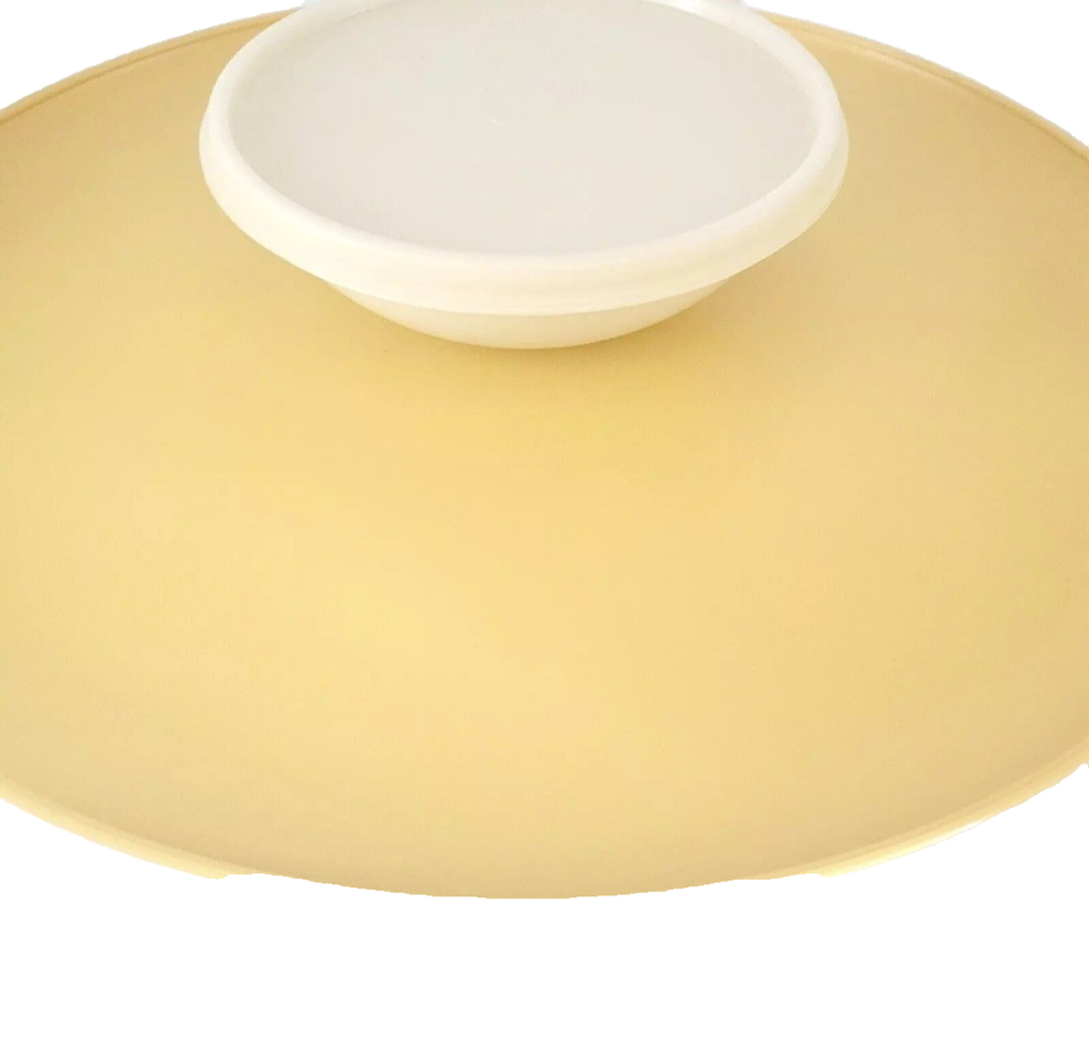 Tupperware Vintage Dip N Serve Tray Harvest Gold 492-3. Tray set is in good vintage condition. Tray has no scratches, stains, or cracks. Bowl with airtight snap on lid has some scratches but no stains or cracks. Lid snaps tightly. Bowl comes off for easy cleaning and storage. Set is perfect for fruits, vegetables or chips with dips. Can also be used as a cupcake, cookie platter if you remove the bowl. Very versatile. Tray is 14" in diameter. Bowl is 5 1/2" in diameter.