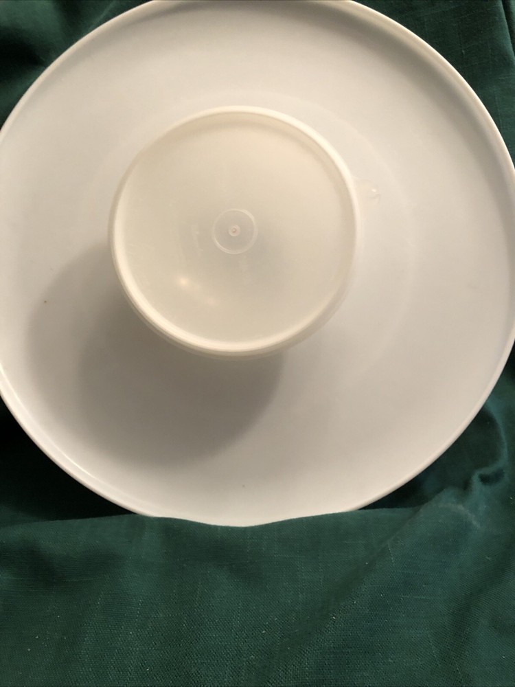 This Tupperware Dip-N-Serve vintage tray is 14” round (491-1). A round dip bowl with lid 5.5” snaps into center. This is the white tray and will be sent quickly.