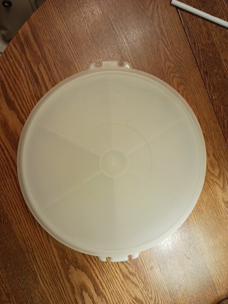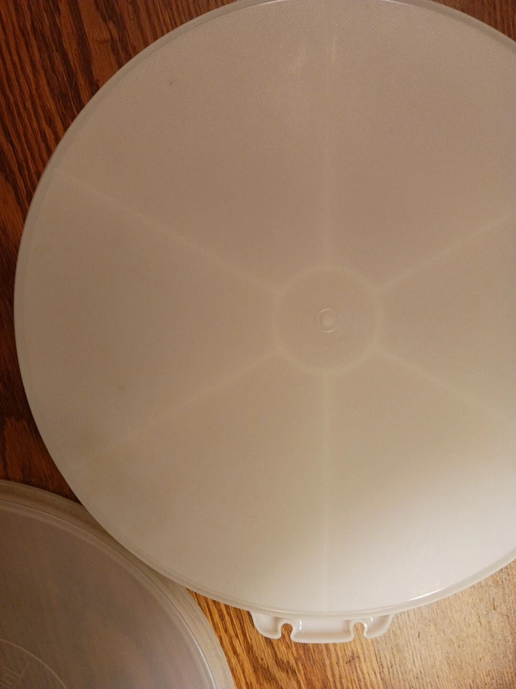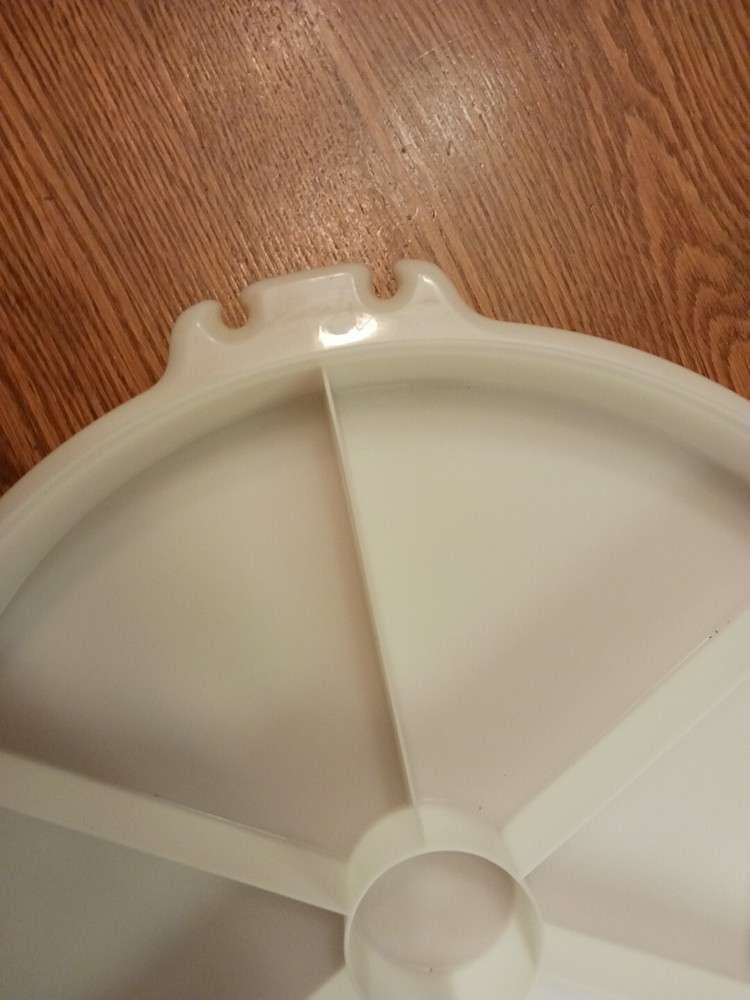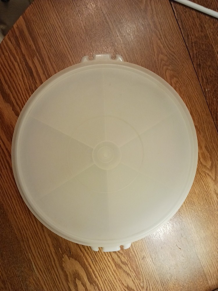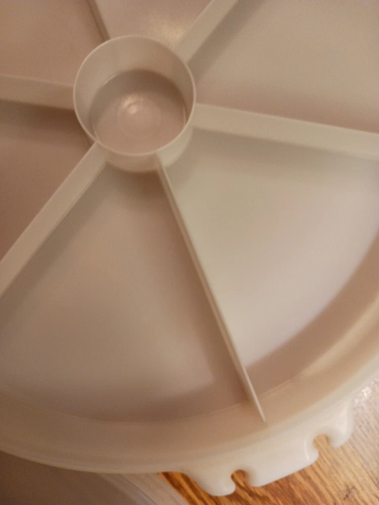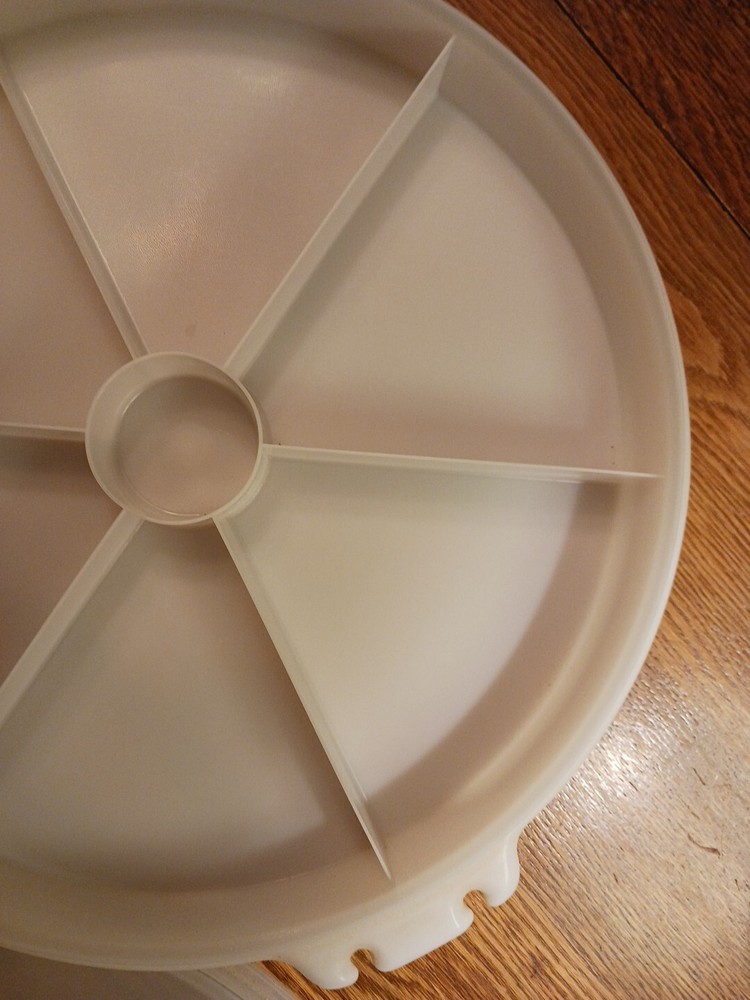 This is a Vintage Tupperware Divided Dish Condiment Dip Tray #224-9. Abit over 12" w/ Tupper Seal Lid. Estimating that this is from the early 1970s. Please note that the top and the bottom are white. The wood table might have cast a tan color but dish is white! I am aware that this was hardly if ever used, but because of storage and age, there are a few minor scuffs on lid, a few on bottom. Upon inspecting the inside of the tray, I see virtually no signs of use. Please see photos, I've tried to be as clear as possible ....and also see item details. Feel free to contact me with further questions. Thank you for looking!.