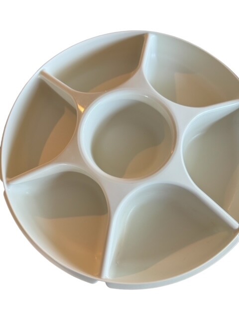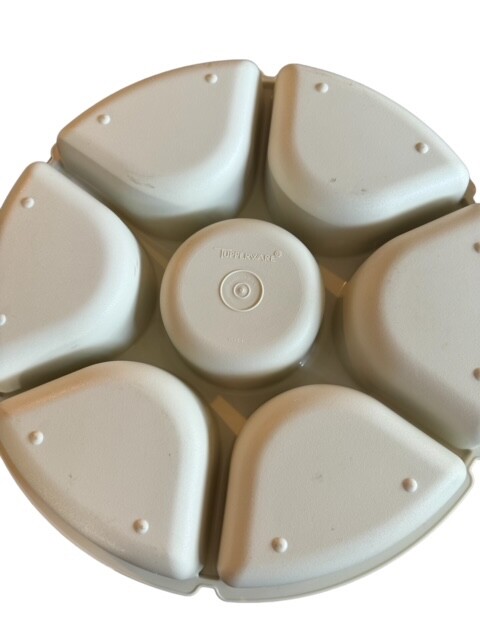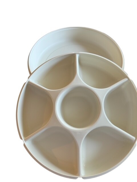 Alecia’s A Bit of Everything Vintage Tupperware Divided Snack/ Dip Dish With Lid Almond Color 14" Diameter Please check out my store for other fun, useful, and collectible items.