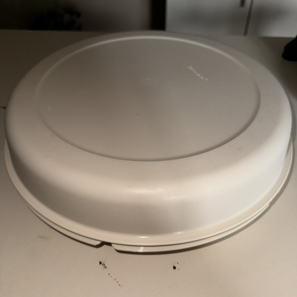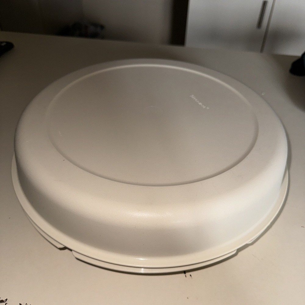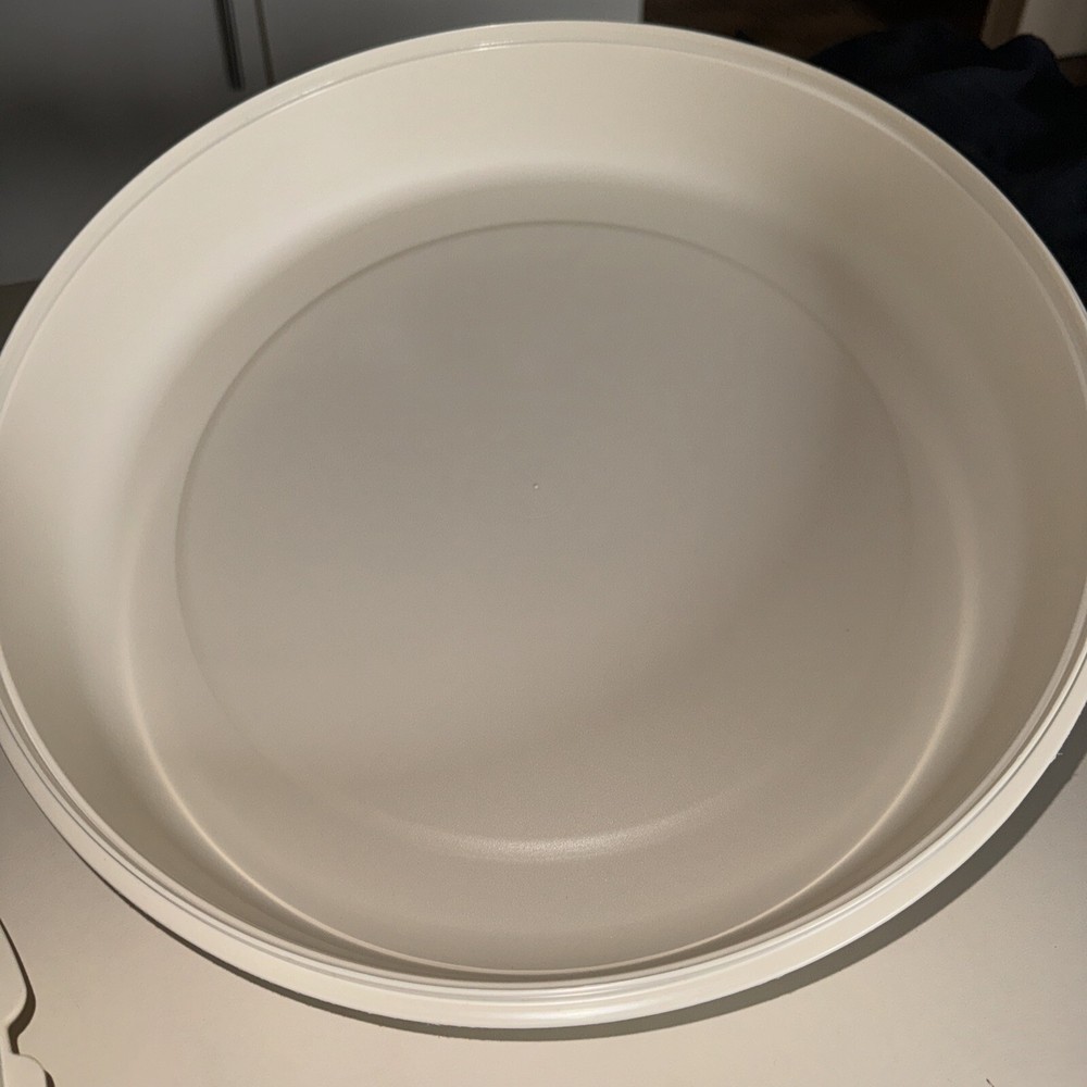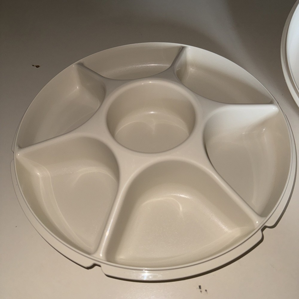 This vintage Tupperware tray is a must-have for any collector or lover of retro kitchenware. The large, almond-colored tray features a divided design with seven slots for serving vegetables, fruits, or dips. The snap lid keeps food fresh and protected, while the antique design adds a touch of nostalgia to any kitchen. The tray is an original, licensed reproduction from the Tupperware brand and has one tier with no compartments. It's perfect for serving snacks or small dishes at a party or gathering. Don't miss out on the opportunity to add this unique piece to your collection.
