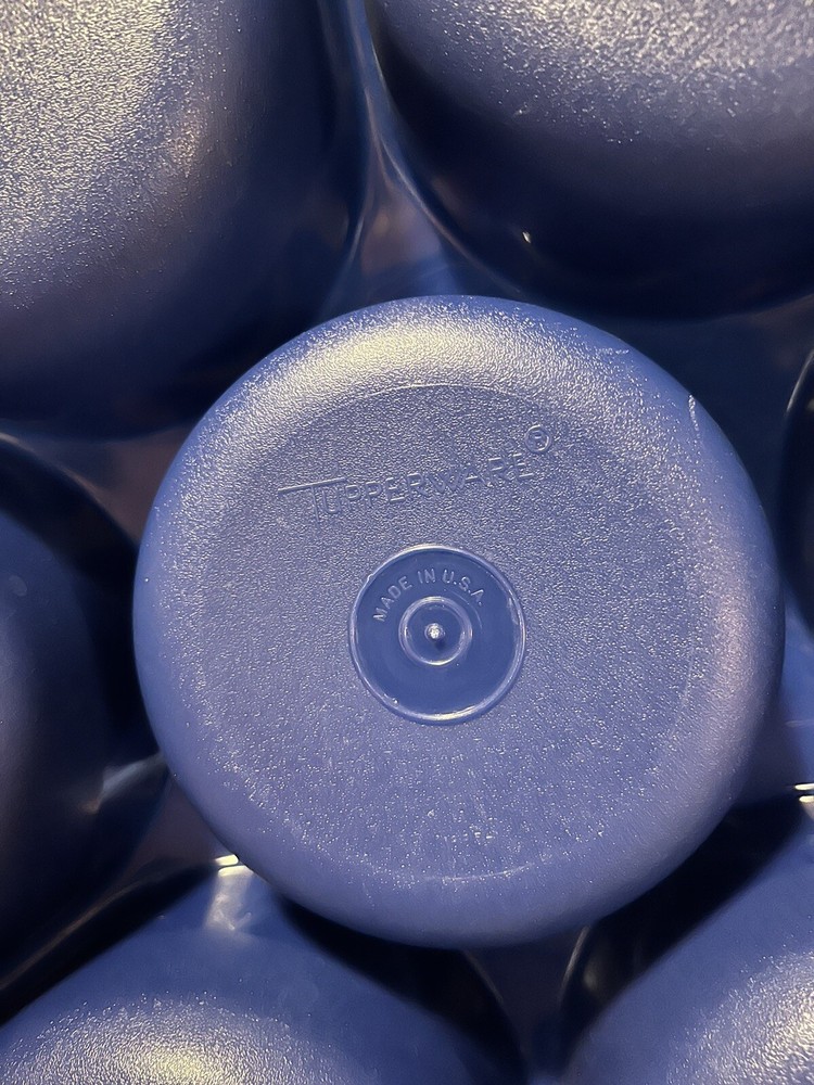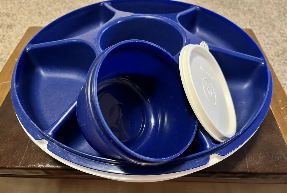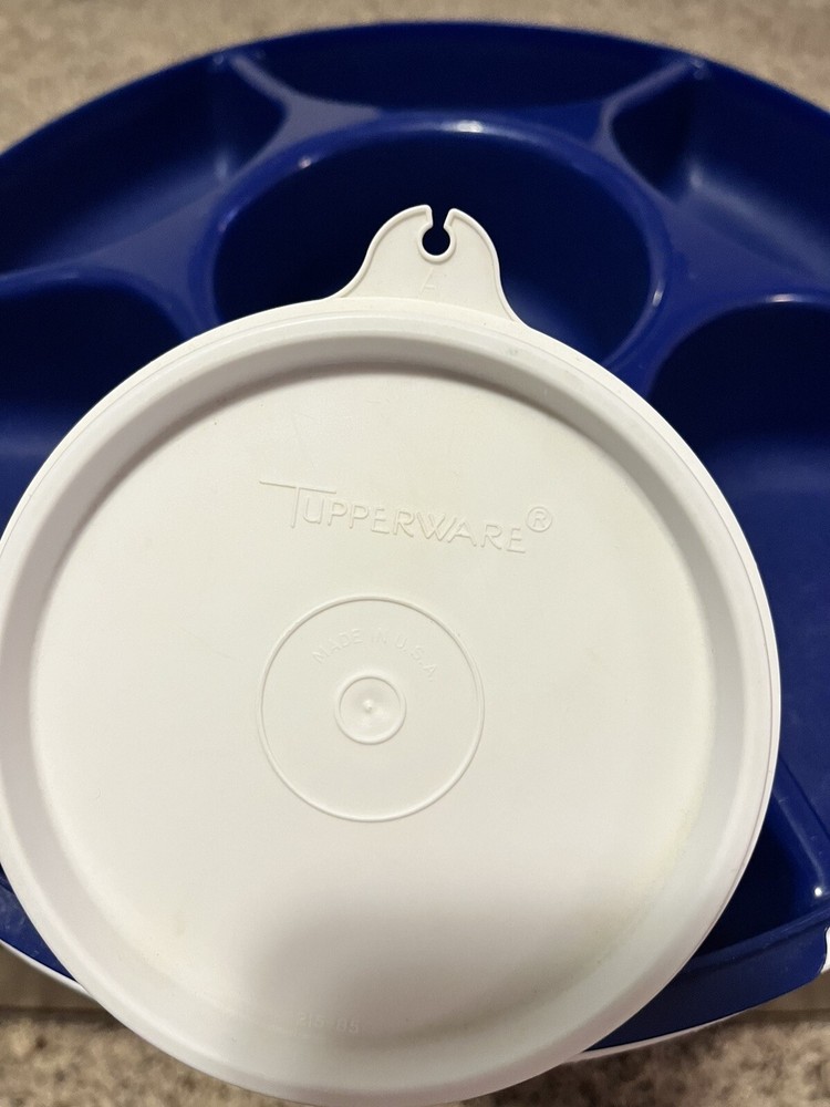 Great Tupperware veggie serving container. Large white lid fits in place under the divided portion and goes over the top for easy transport and to keep the veggies fresh. Dip bowl base is blue with a white lid. Great condition!