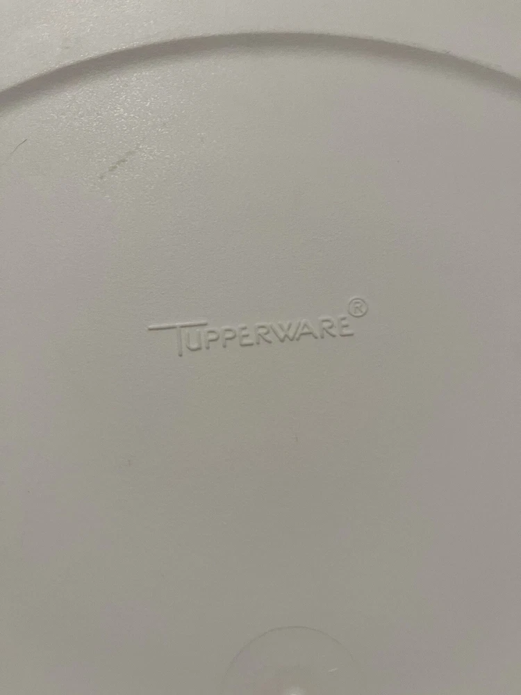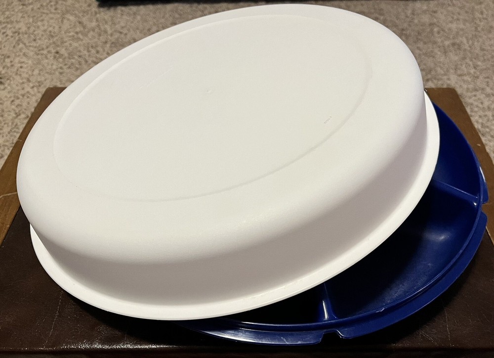 Great Tupperware veggie serving container. Large white lid fits in place under the divided portion and goes over the top for easy transport and to keep the veggies fresh. Dip bowl base is blue with a ...