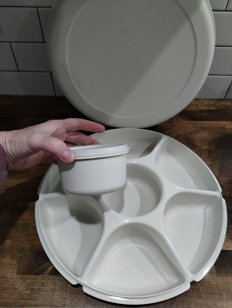This vintage Tupperware set includes a large round divided veggie serving tray with 6 compartments, a dip bowl, and lids. The set is in almond color, made of plastic, and measures 14'' in length, width, and 4'' in height. It is a retro Tupperware brand item from the United States, featuring easy clean materials.