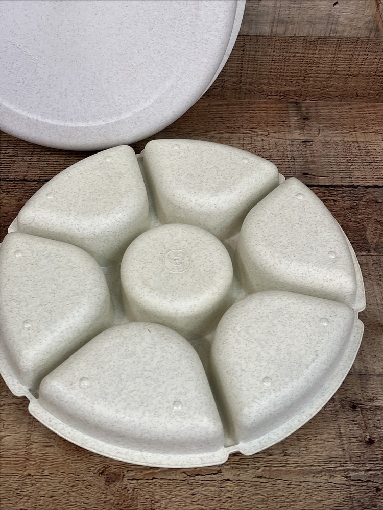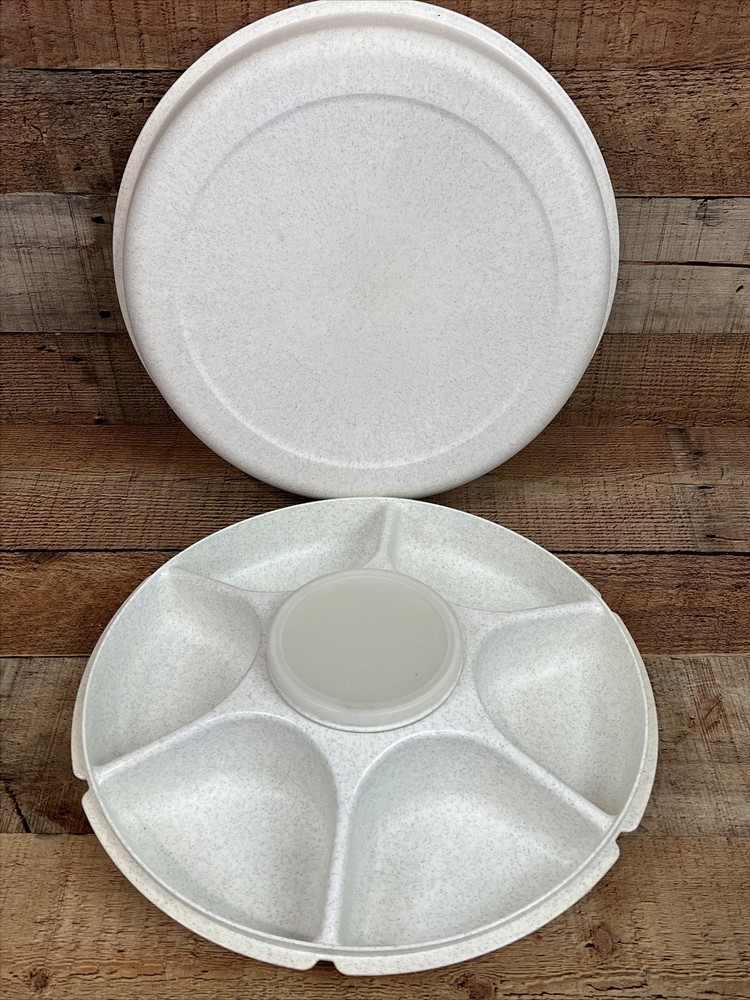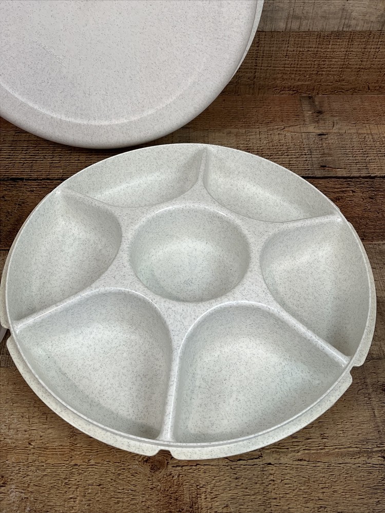 Vintage Tupperware Divided Veggie Serving Tray #1665, Lid & Dip Bowl Almond Please note that the lid to the dip bowl is not the original Tupperware lid. It does seal.