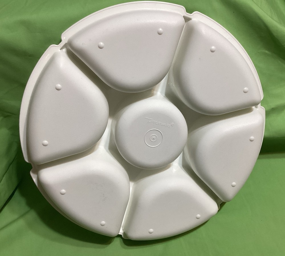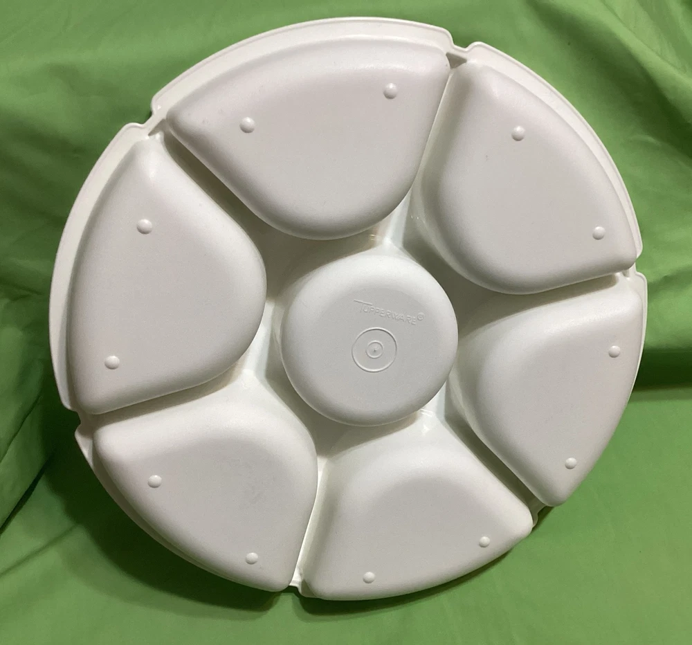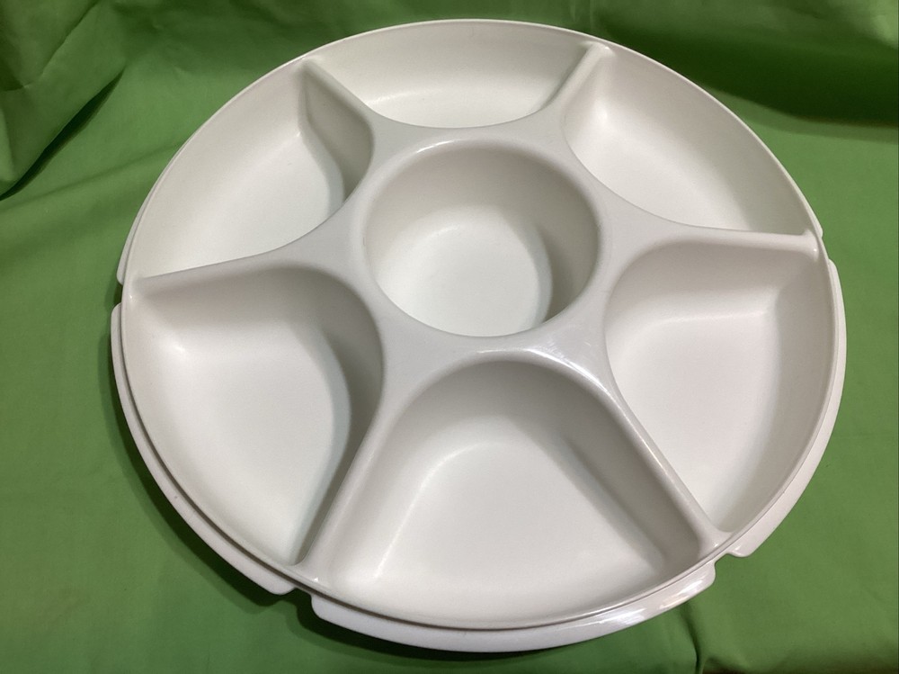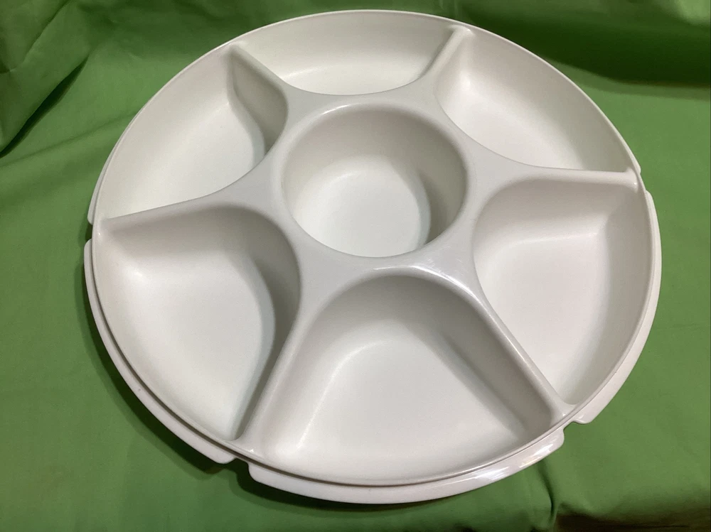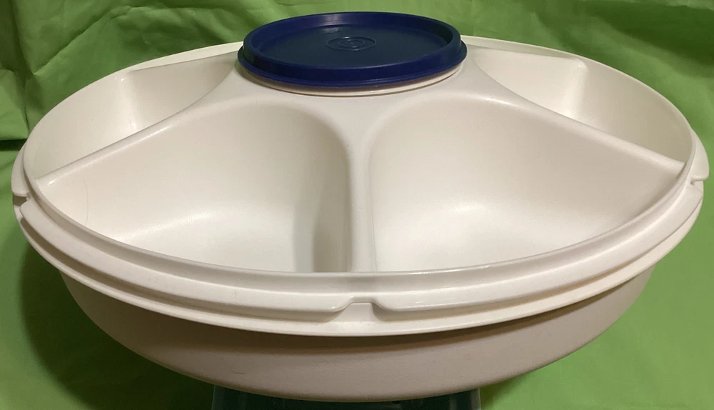 This vintage Tupperware divided serving tray is perfect for any party or gathering. The round shape and large size make it ideal for holding a variety of vegetables, snacks, and other foods. The tray features 6 compartments forming a circle with an additional compartment in the middle for dip or other condiments. Made of durable plastic, this tray is break and chip resistant, airtight, and waterproof. The functional lid can be filled with ice to keep food cold, making it a great addition to any party. The tray is easy to clean and dishwasher safe. With its traditional style and solid pattern, this Tupperware serving tray is a must-have for any kitchen. The removable dip bowl and lid have some signs of age. The blue lid was not the original lid which was clear/frosted. It just looks better with some color and not sure where the original might be. The serving tray and lid are tip top. Comes as is, as pictured. Visit our store for more great finds of all kinds. Enjoy your party!