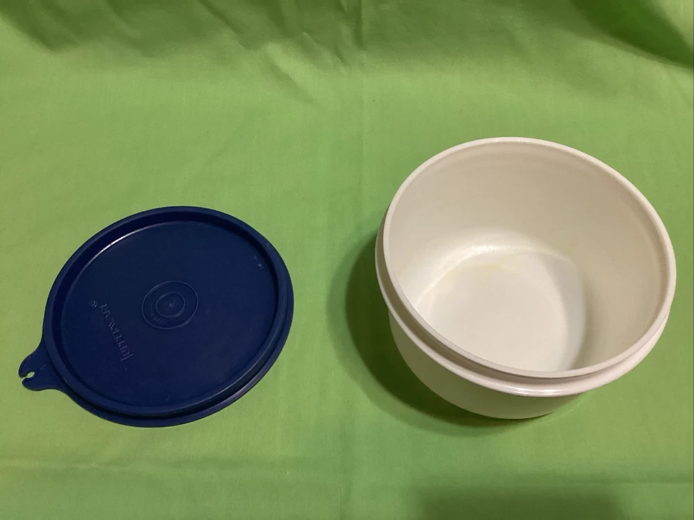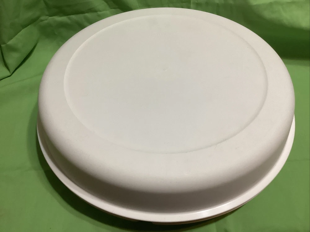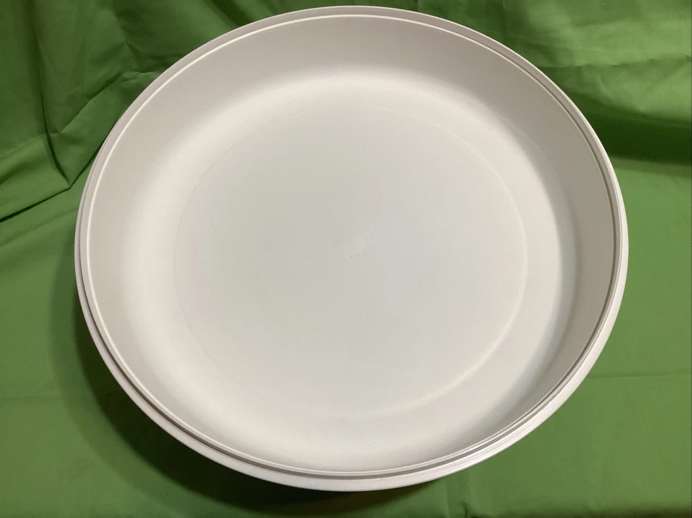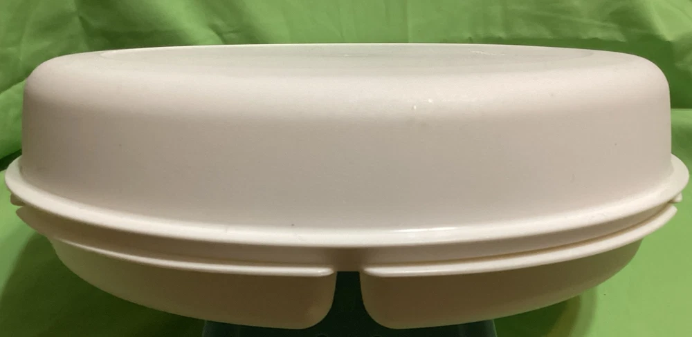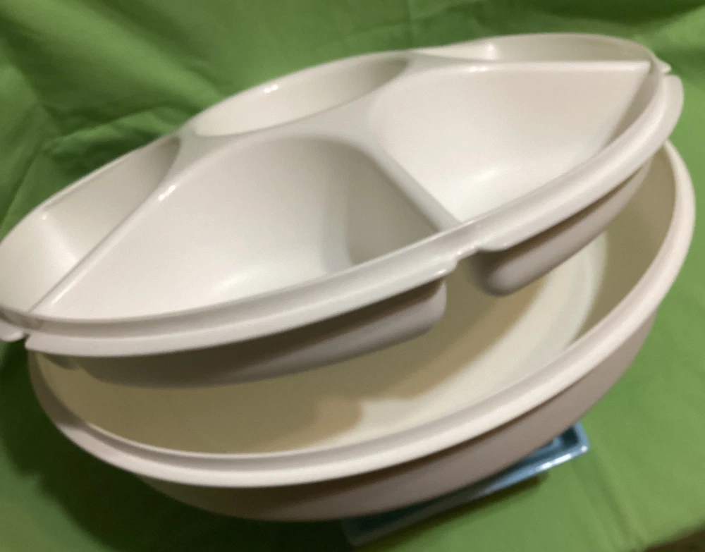 This vintage Tupperware divided serving tray is perfect for any party or gathering. The round shape and large size make it ideal for holding a variety of vegetables, snacks, and other foods. The tray features 6 compartments forming a circle with an additional compartment in the middle for dip or other condiments. Made of durable plastic, this tray is break and chip resistant, airtight, and waterproof. The functional lid can be filled with ice to keep food cold, making it a great addition to any party. The tray is easy to clean and dishwasher safe. With its traditional style and solid pattern, this Tupperware serving tray is a must-have for any kitchen. The removable dip bowl and lid have some signs of age. The blue lid was not the original lid which was clear/frosted. It just looks better with some color and not sure where the original might be. The serving tray and lid are tip top. Comes as is, as pictured. Visit our store for more great finds of all kinds. Enjoy your party!