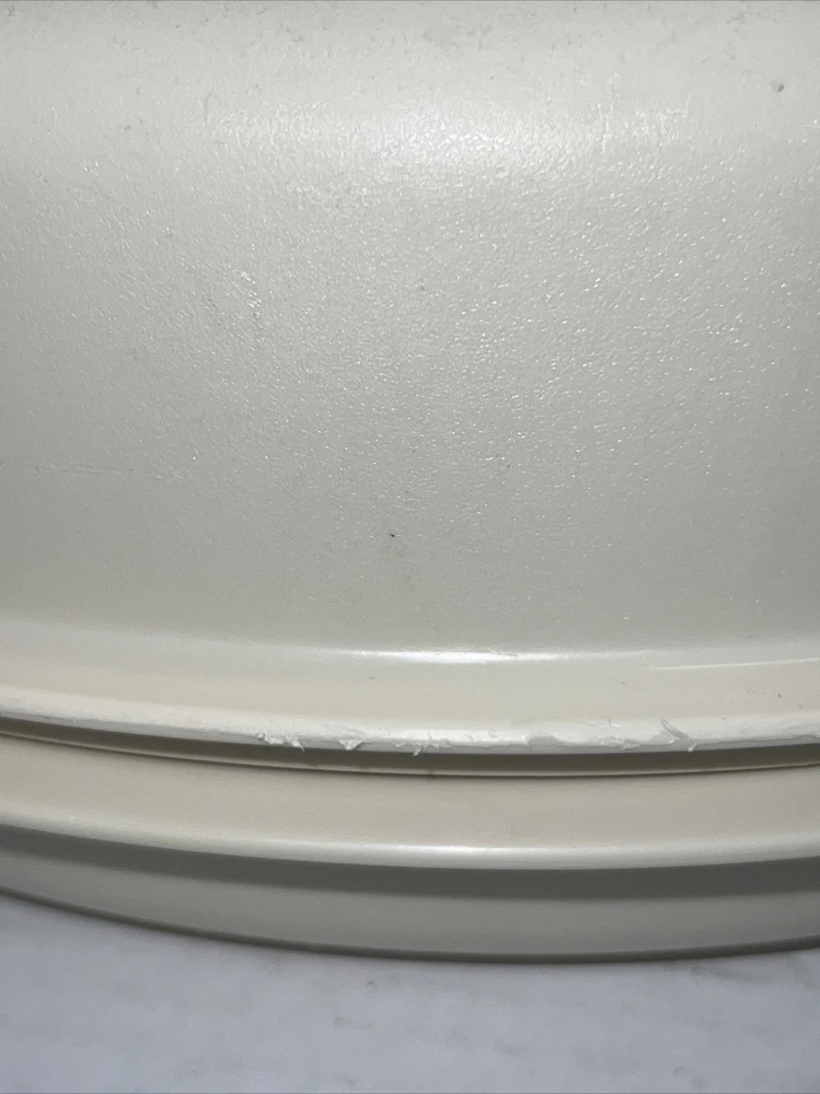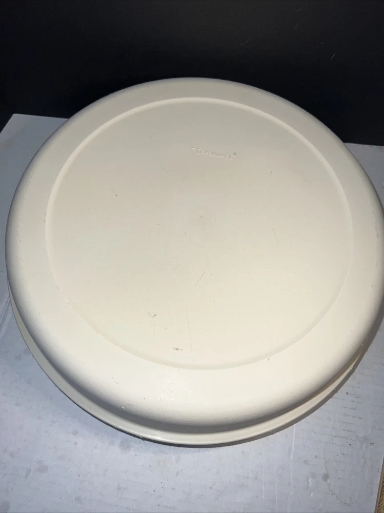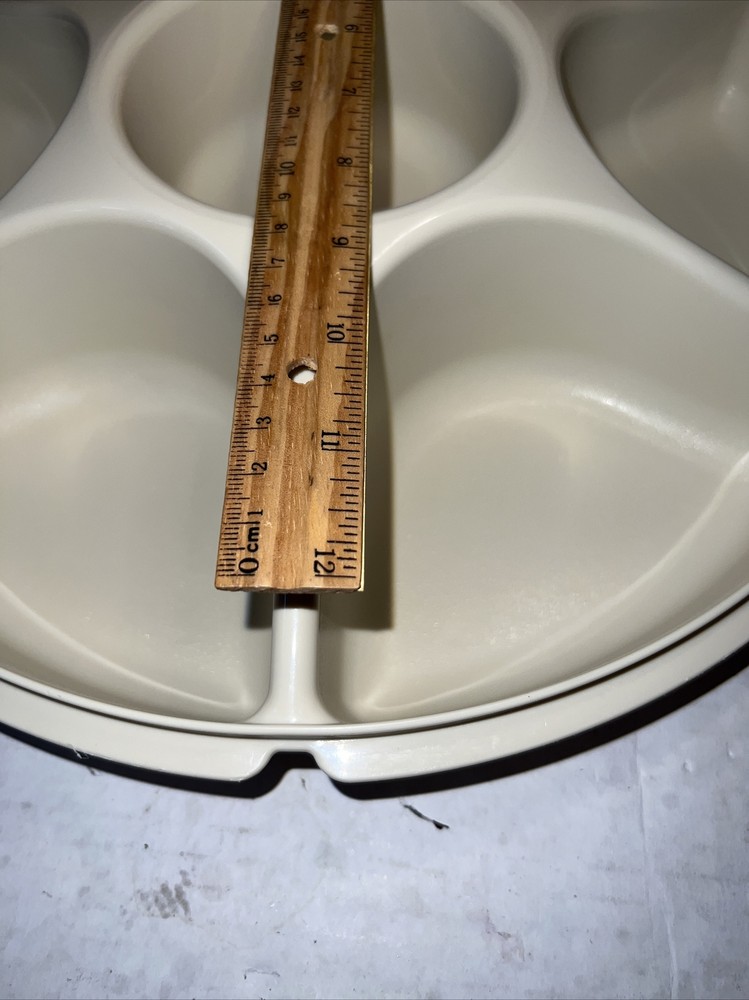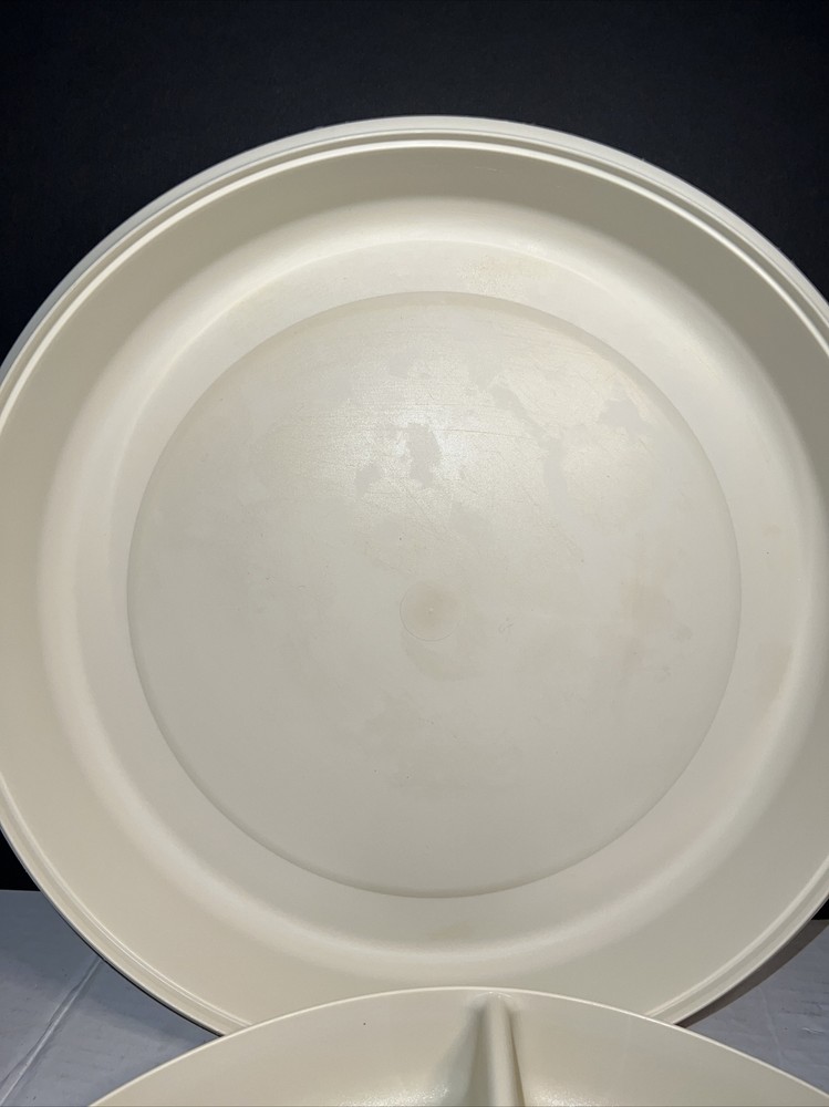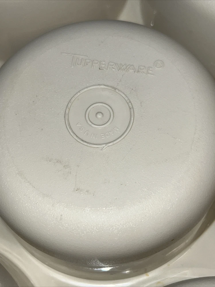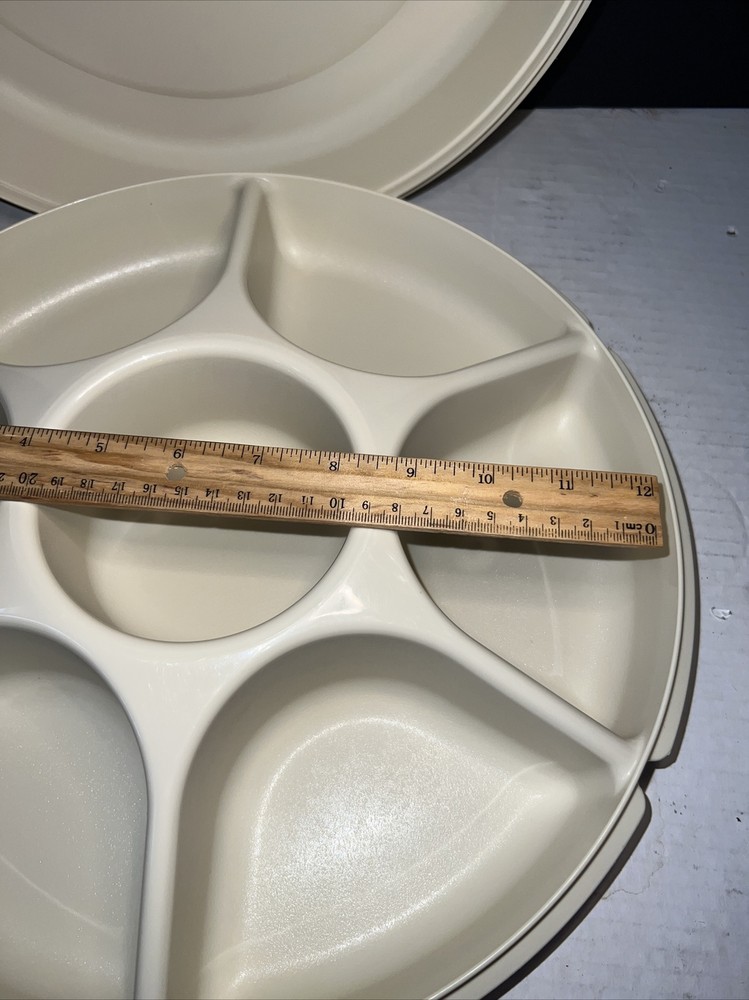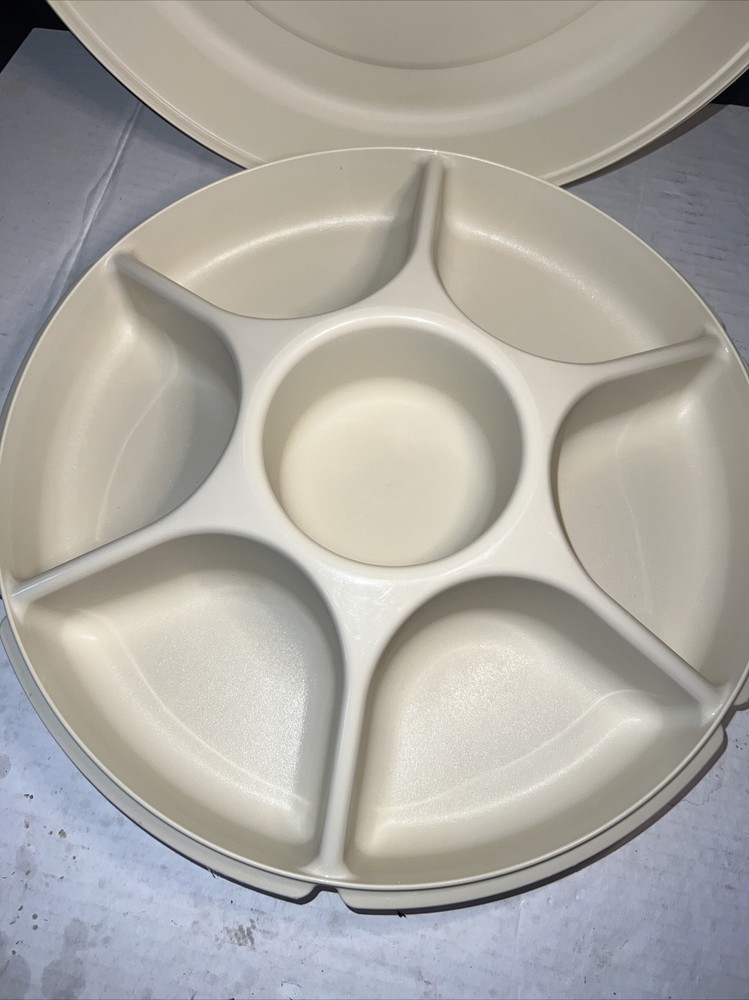 Vintage Tupperware Ivory 2 Piece Divided Party/Dip Tray #1665-1 & Lid #1666-1. Great piece for veggies and dip or taco toppings. Well work for parties, family, gatherings, tailgating, or camping outside has minor dings and scuffs due to its use inside is in pristine condition. The lid seals appropriately. Great find just in time for summer.
