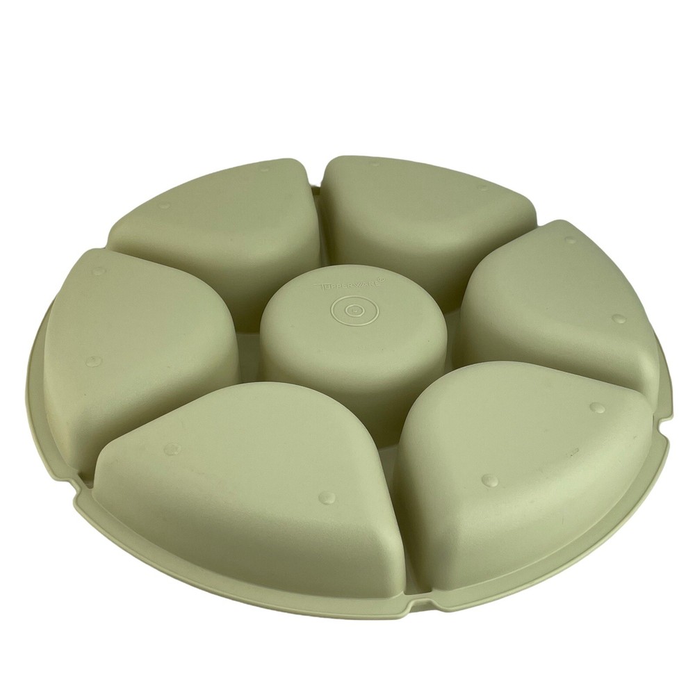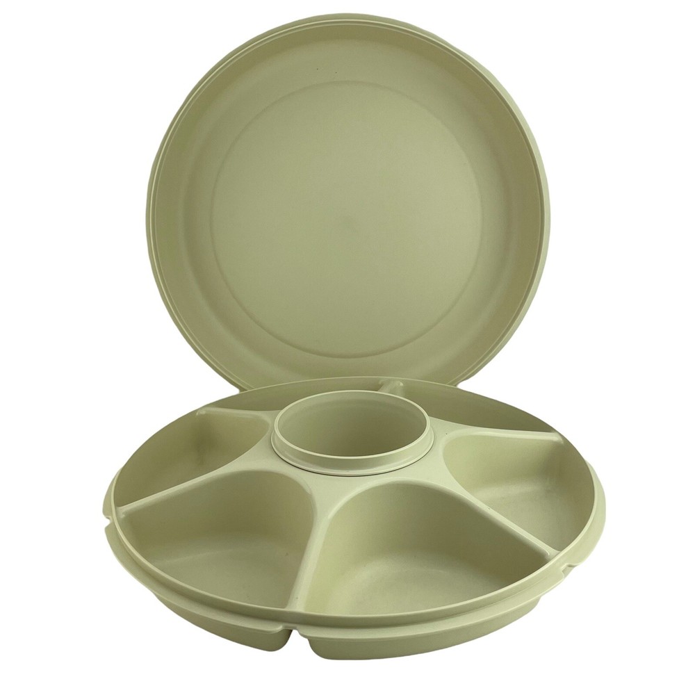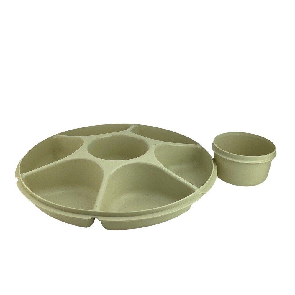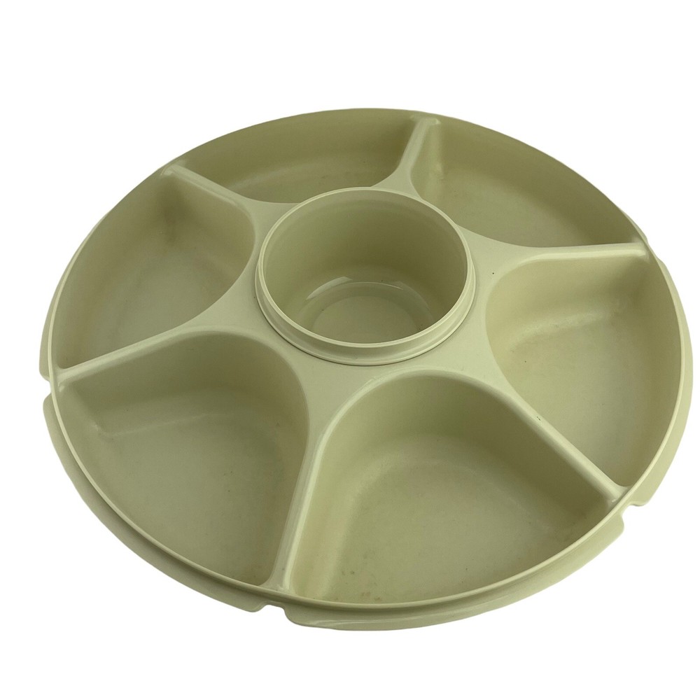 Vintage Tupperware Large Divided Vegetable Chip Dip Party Tray with Lid. Almond color, approx. 13 3/4" round and 4" deep. Missing lid to inner dip bowl. Combined shipping available. Smoke-free location. Items ship within one business day