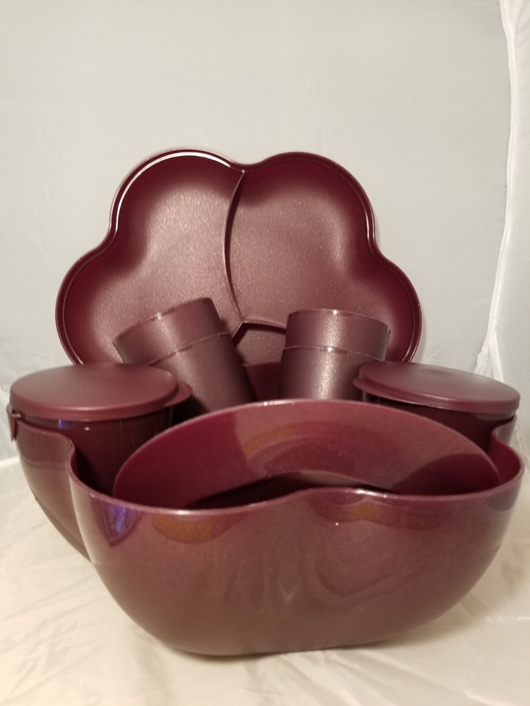 Vintage Tupperware Open House Collection Chip 'N Dip Purple Glitter 14 Piece Set. Plates have some wear and there are a few scuffs and scratches. Please review pictures closely for wear and measuremen...