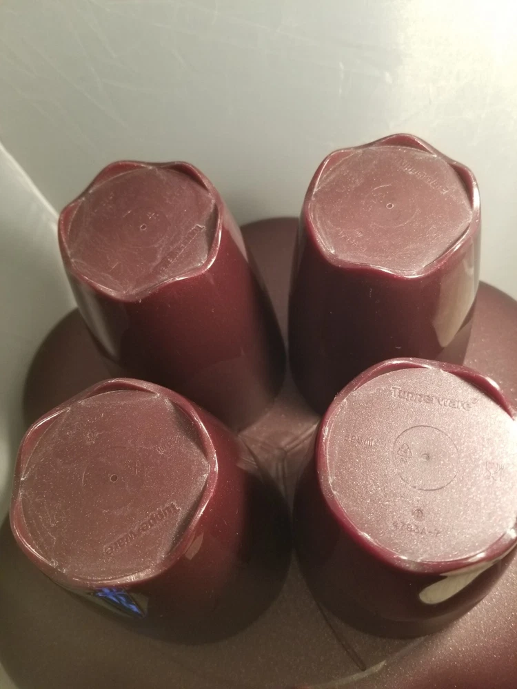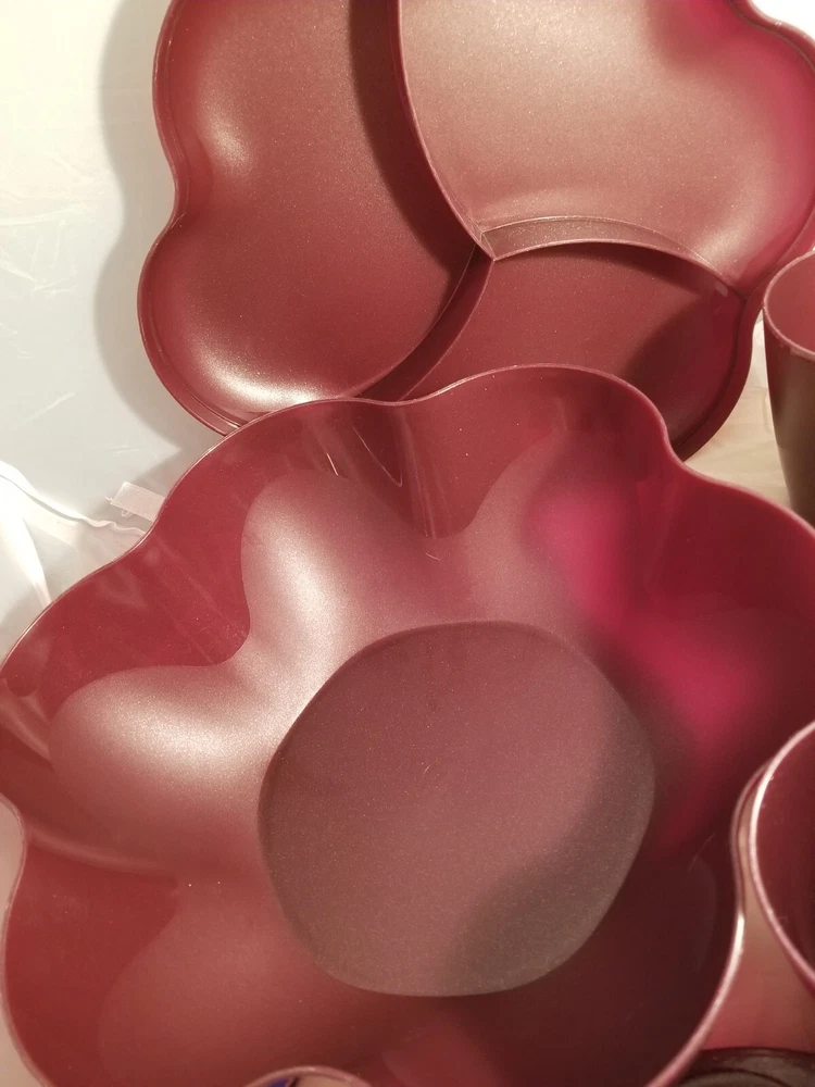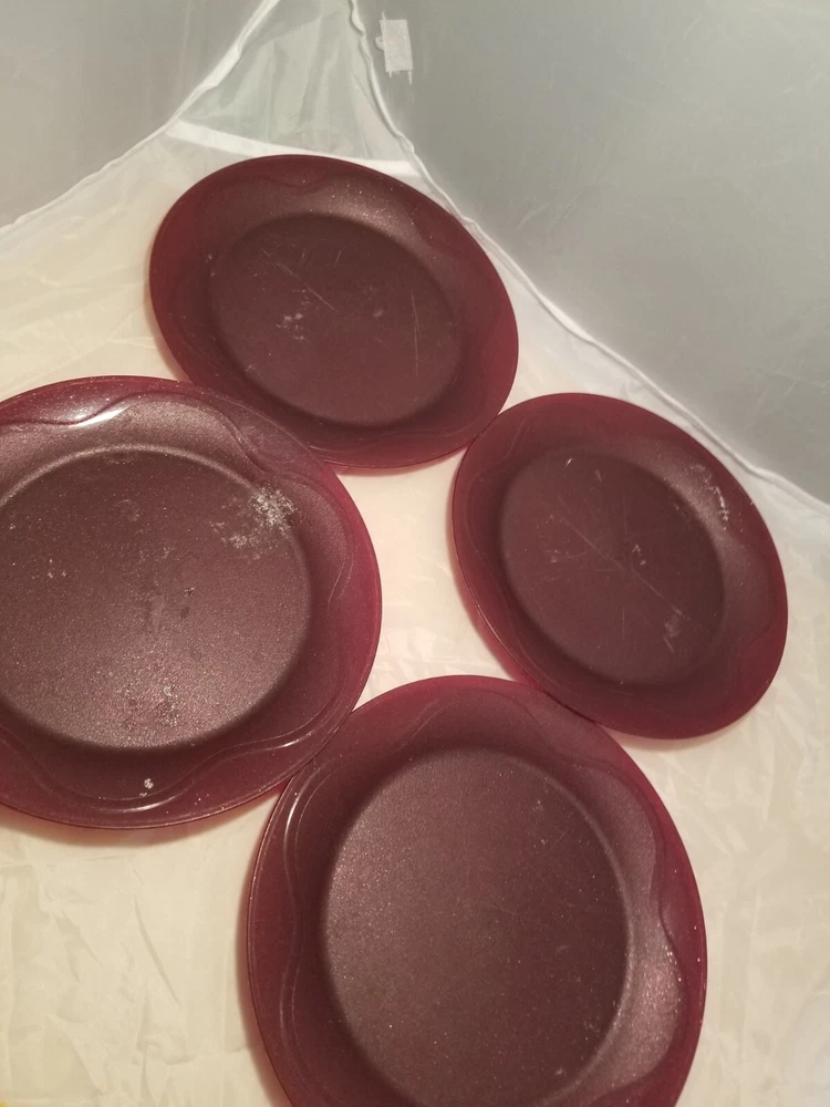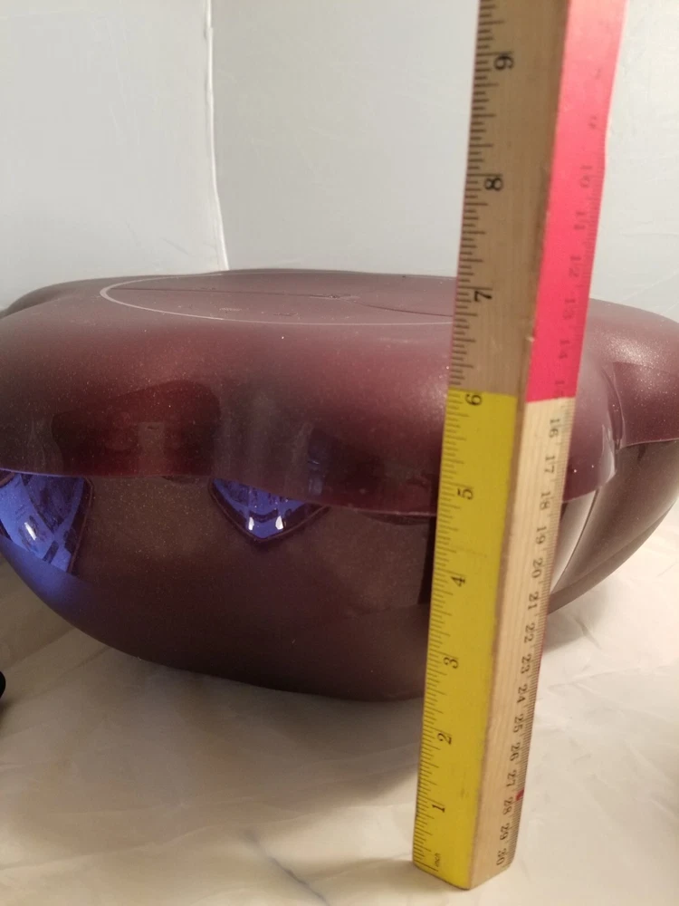 This vintage Tupperware set is a fun blast from the past! The purple glitter adds a playful retro vibe, perfect for parties or display. While it has some wear and scuffs, the set is still charming and functional. Great for collectors or anyone who loves nostalgic kitchenware—just check the pics for details!