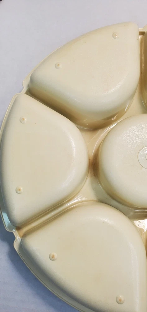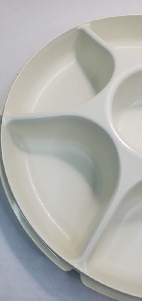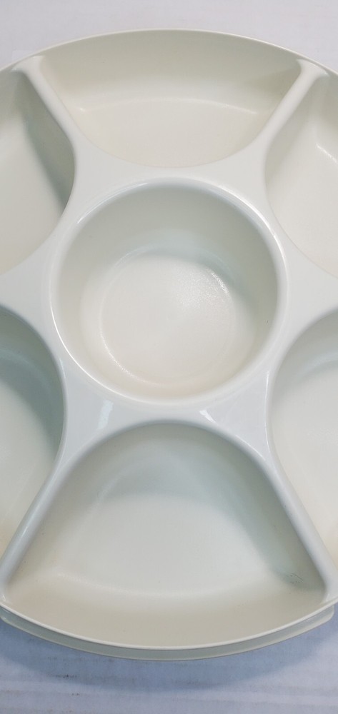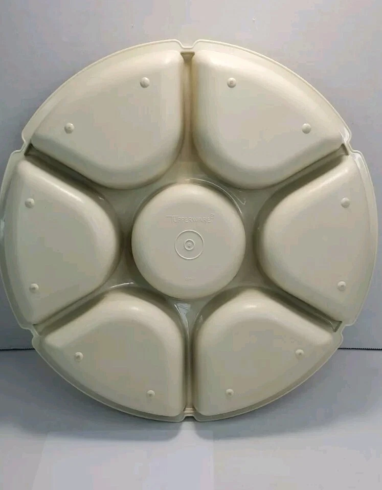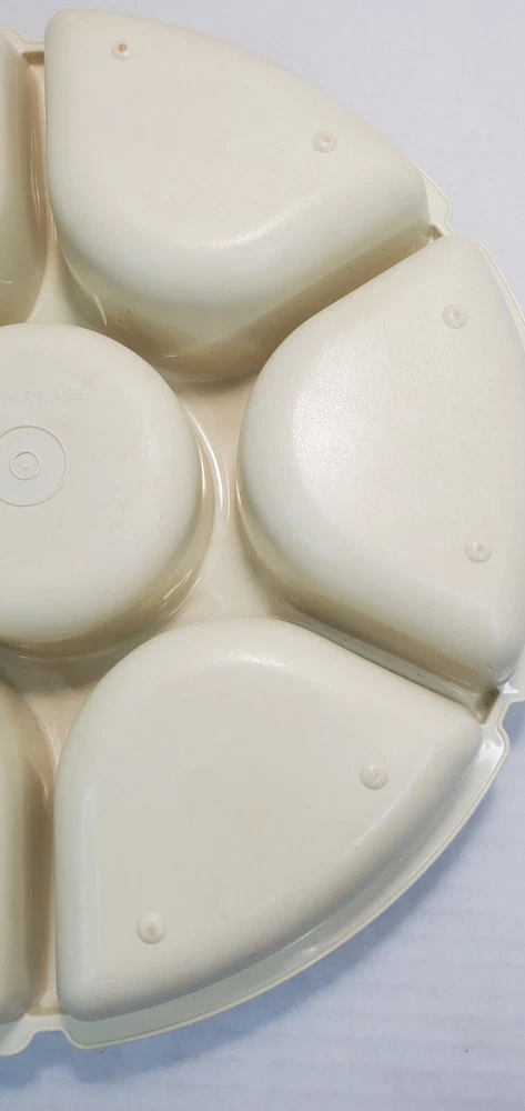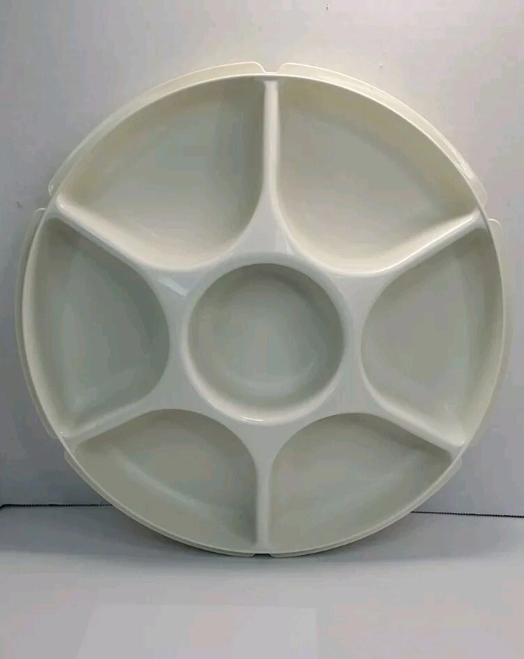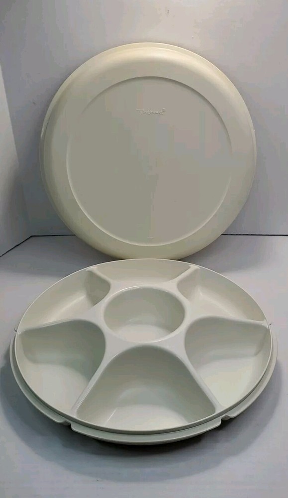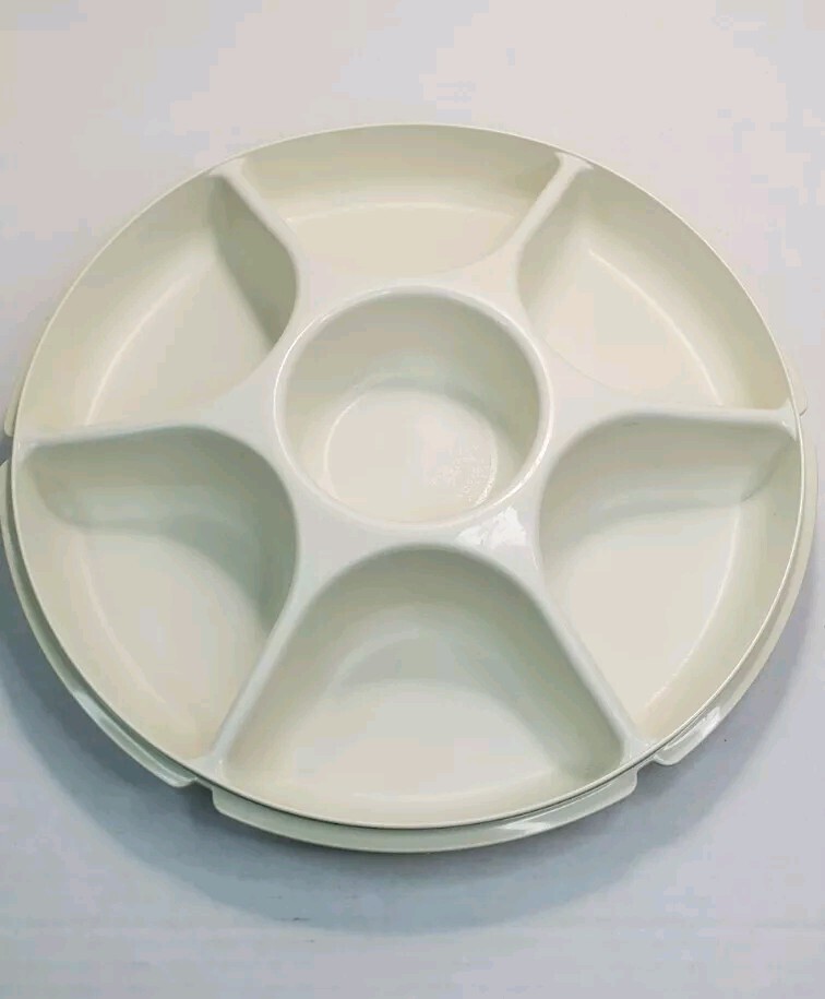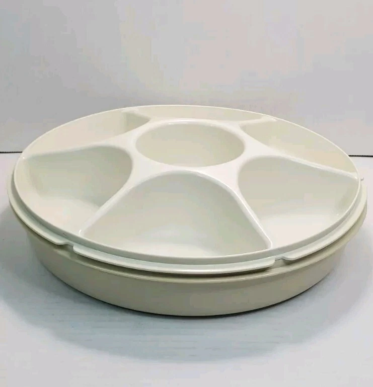 Vintage Tupperware Party Relish Dip Snack Tray 1665-5 With Lid 1666-4. Tray Stacks inside lid for easy storage. Interior of lid has some staining, in good vintage condition.