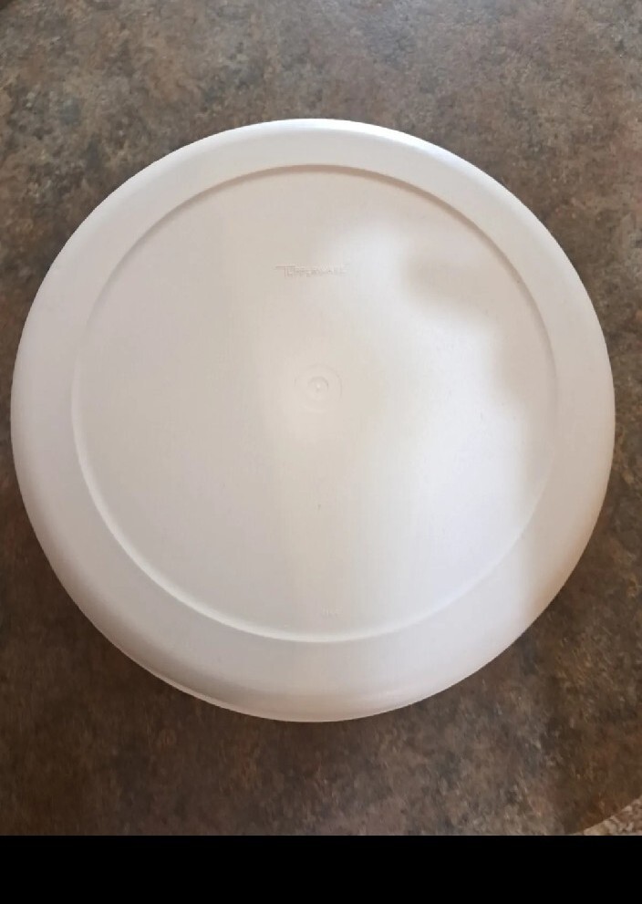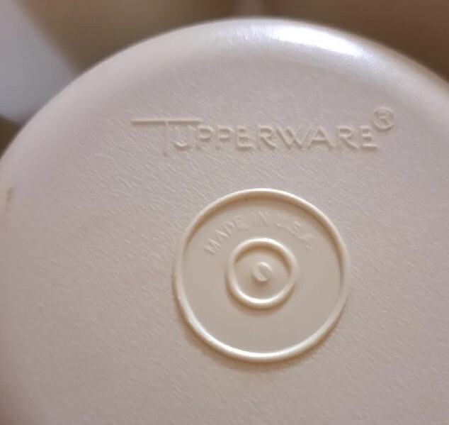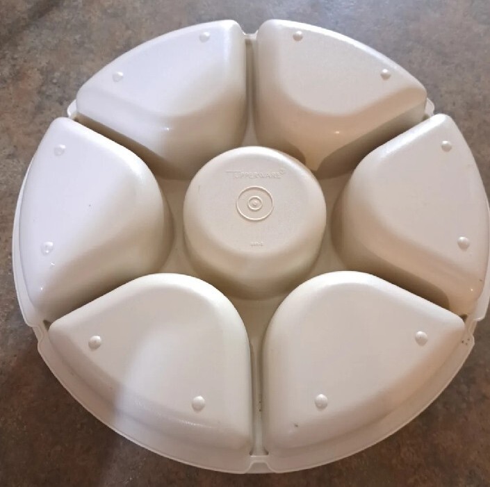 The Vintage Tupperware Serving Chip/Dip Veggie Tray 1665-3 with Lid 1666-3 is a round tray with more than 5 compartments, making it perfect for organizing chips, dips, and veggies. The beige color and friction-held lid add a retro touch to any kitchen or dining room. This original Tupperware product from the 1970s is a great addition for adults looking to add some nostalgia to their kitchen storage and organization collection.