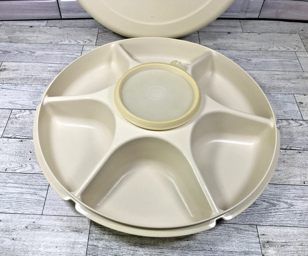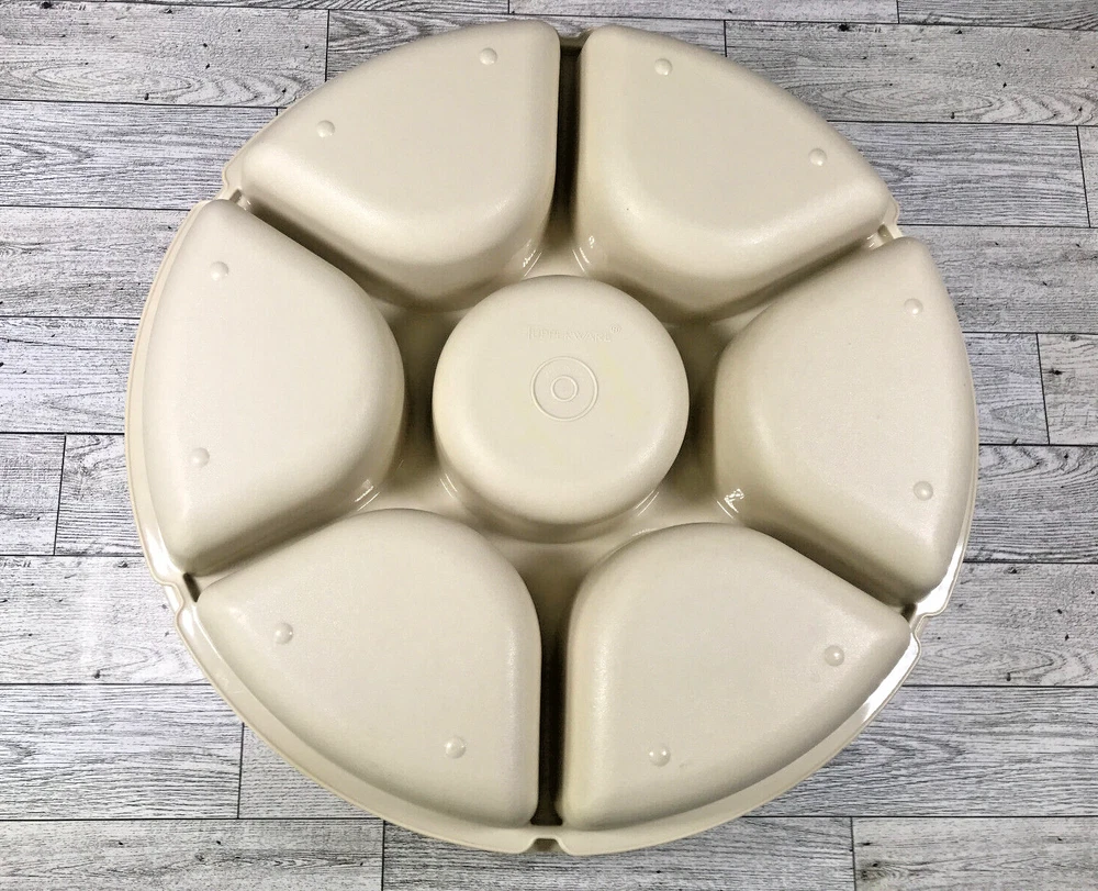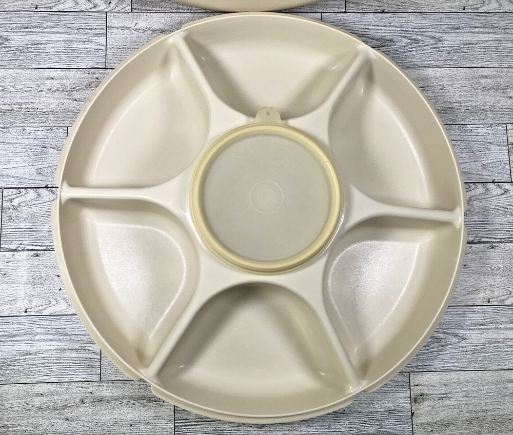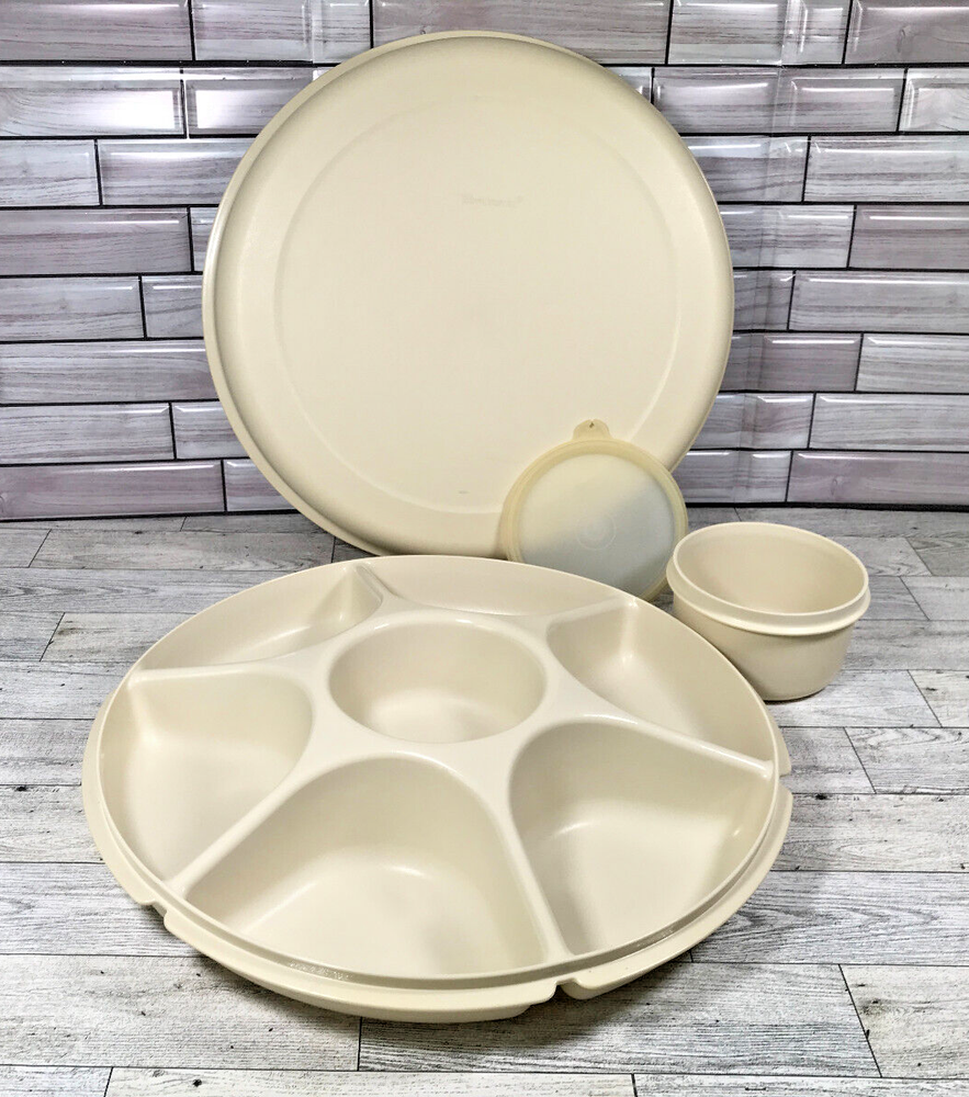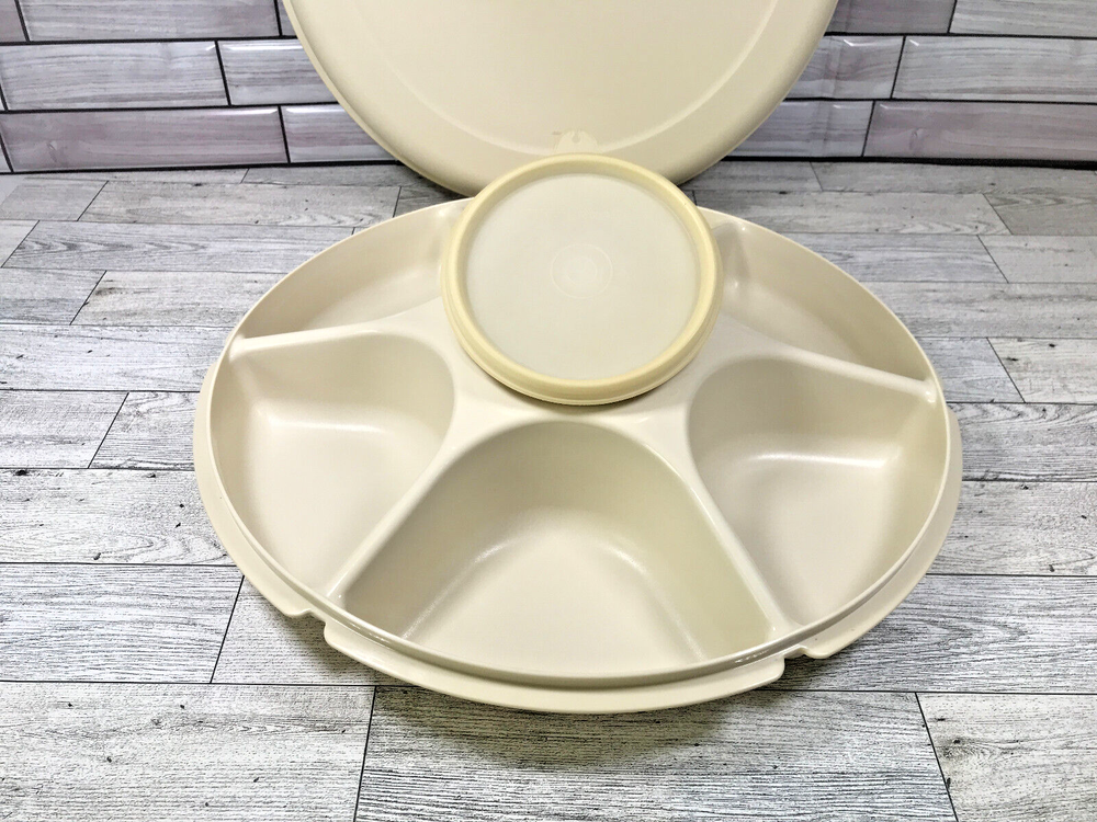 Vintage Tupperware Veggie Fruit Dip Serving Tray + Dip Dressing Container & Lids These Tupperware Veggie / Fruit Serving Tray & Dip / Dressing Container are in very good condition. They do show signs of use and some discoloring. (See Photos) Pictures are worth a 1000 words, please look at them closely! You will receive the exact items pictured! We will do our best to describe the item and details, but if you have any questions please ask, we are here to help! PAYMENTS All payments must be completed through Ebay's check out services. Buy It Now items are set to be payed immediately, if you are buying multiple items please use the Add To Cart feature and message us to calculate combined shipping. Ebay collects sales tax in accordance with applicable state laws. SHIPPING We now ship International. We will only ship to the address you have on file when the order is placed. Our items are set to Calculate Shipping Cost, so your shipping cost is calculated through Ebay services by weight, size, from our location to your location, with no extra handling fees. International orders may require additional shipping cost and is handled through Ebay International shipping. We ship within 1 - 2 days depending on when the order is placed. Our rural county post office is not open weekends. For combined shipping, please request an invoice total prior to checkout. RETURNS We want you to Love your item and your satisfaction is always guaranteed with our 30 day free return policy. Please see Ebay's return services, policies and procedures. In the event that we make an error, or there is a problem with your order, please message us, we are here to help! AI Description Elevate your serving game with this Vintage Tupperware Veggie Fruit & Dip Serving Tray, a delightful addition to any retro-themed event or a timeless touch to your current gatherings. The tray features a solid beige color that exudes a warm, inviting vibe, while the round shape and 13.5-inch size provide ample space for an array of appetizers and dips. Crafted in the United States during the 1990s, this original Tupperware set includes four pieces: a large tray, a lid, a dressing container, and a dip bowl, all designed to keep your snacks and dips fresh and ready to serve. With its seven slots and a single compartment, organizing your spread has never been easier. This set not only serves as a practical serveware but also as a charming collectible for Tupperware enthusiasts.