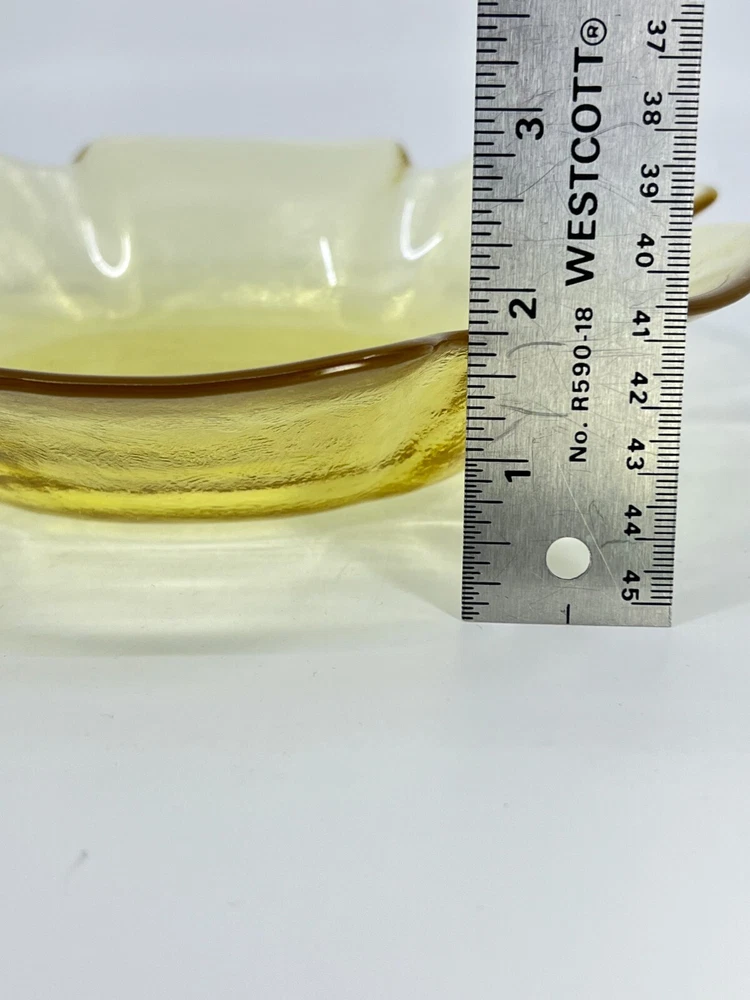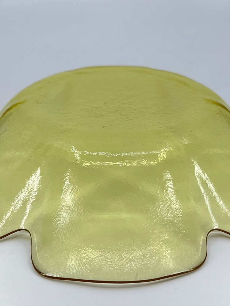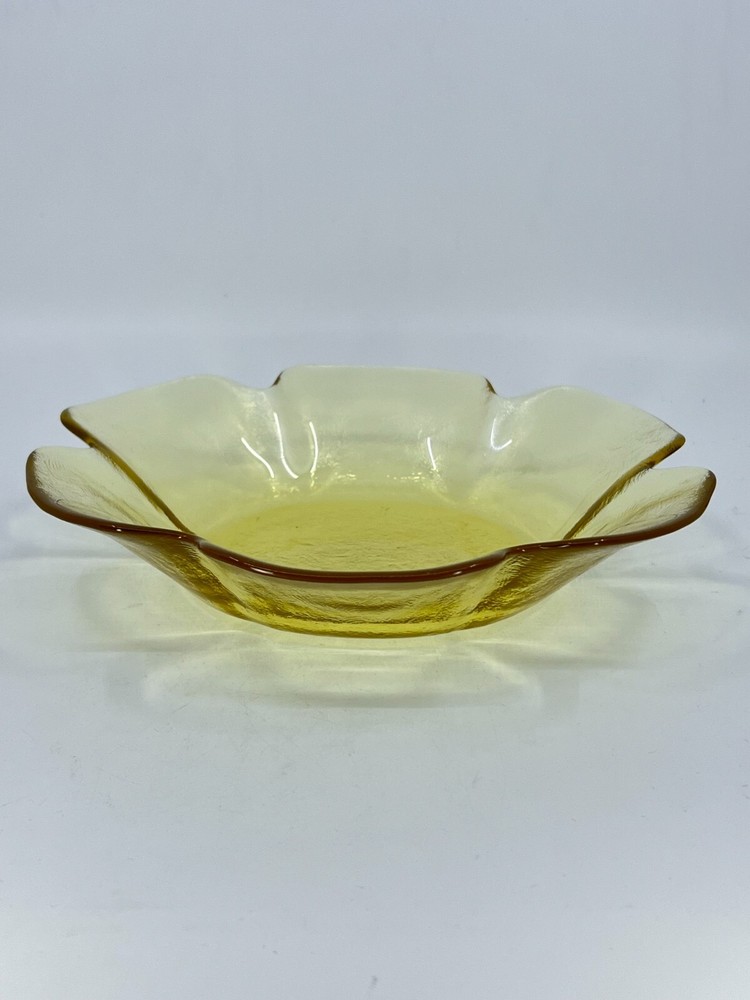 This vintage Viking Glass dish bowl is a timeless addition to any home decor. The lotus-shaped bowl features a shiny yellow finish and measures 8.5 inches in diameter and 2 inches in height. It is perfect as a candy dish or decorative piece, with a flower-shaped design that adds a touch of elegance to any room. Crafted in the United States in the 1970s, this original and licensed reproduction piece is made of studio-crafted art glass and weighs 1.6 pounds. The bowl has one compartment and a diameter of 8.5 inches, with a depth of 1.5 inches. With its vibrant color and flower-themed design, this Viking Glass lotus bowl is a must-have for any collector of vintage glassware.