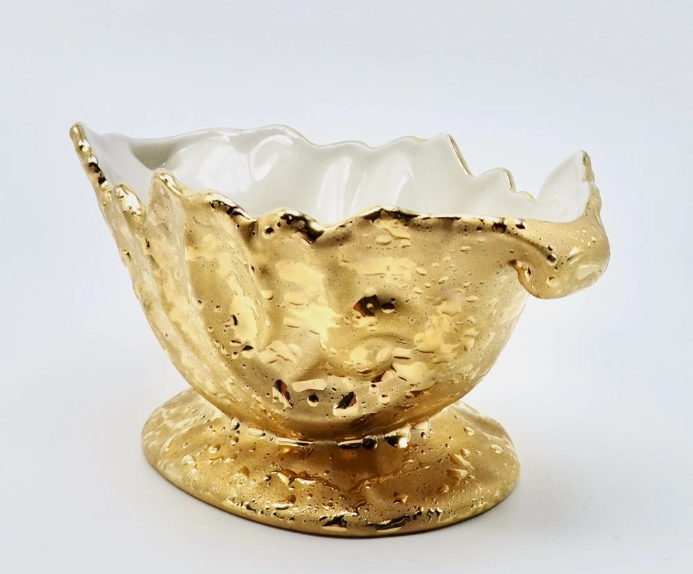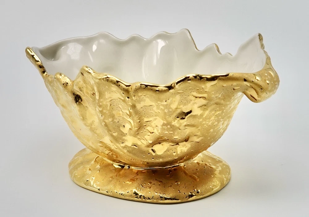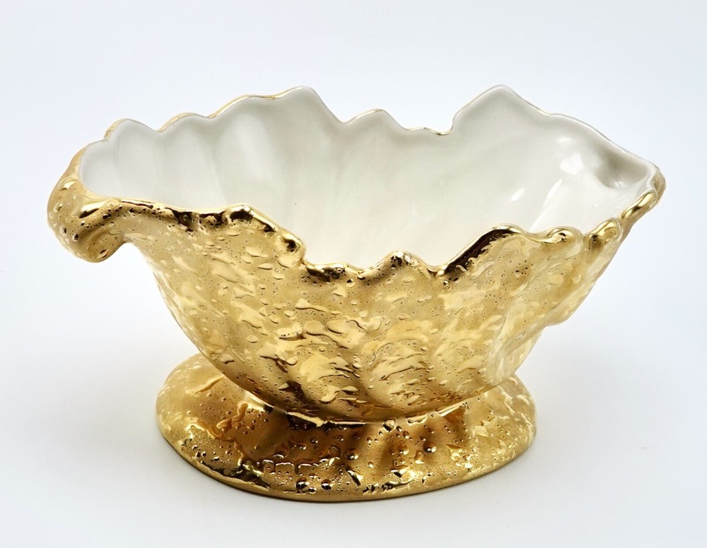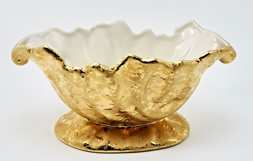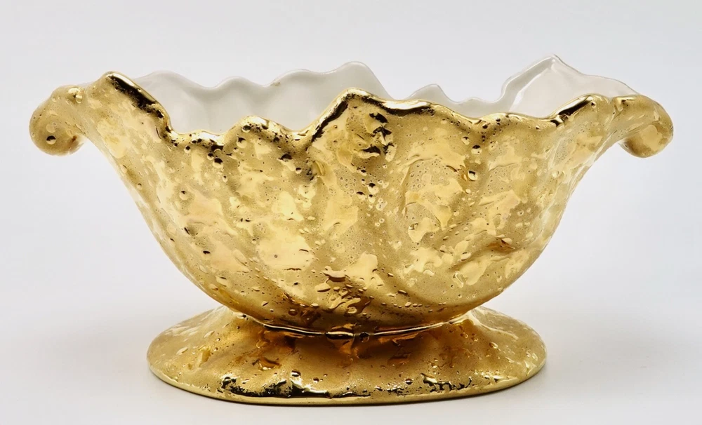 Preloved Weeping Gold 22K Dixon Art Studio Footed Planter Dixon Art Studios China was made at Bel Terr China in East Palestine, Ohio Vintage Porcelain Hand Made In United States Mid-Century Modern Circa 1960s Materials: 22K Gold, Porcelain measures 8" long, 3.5" - 3.75" tall and 4" wide
