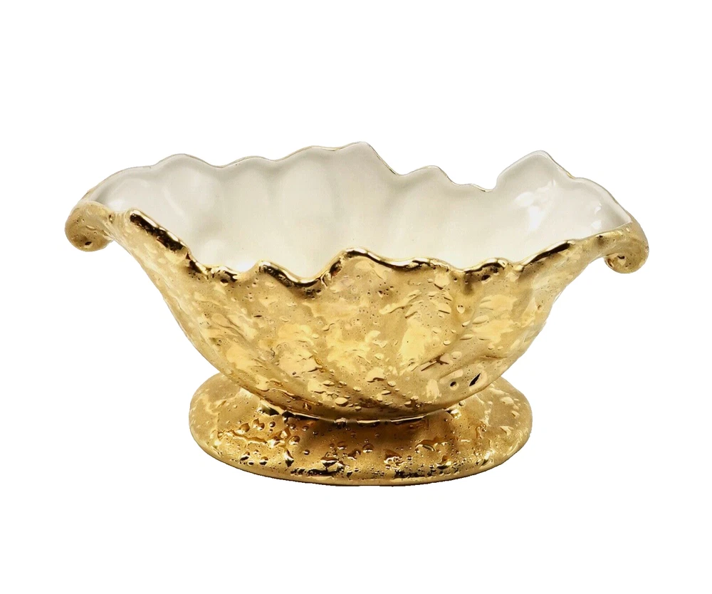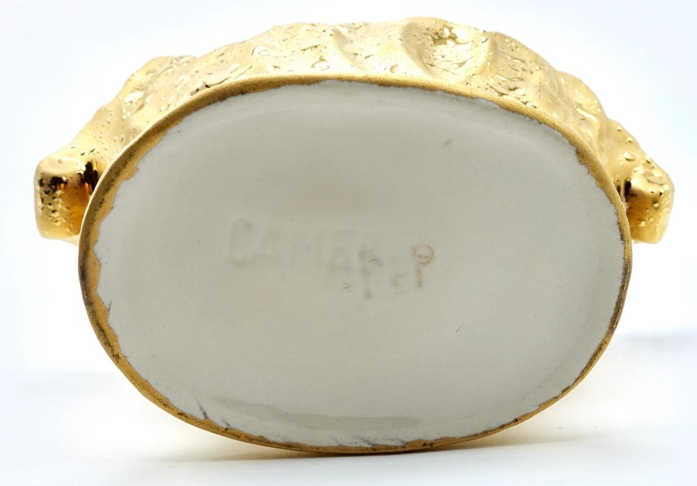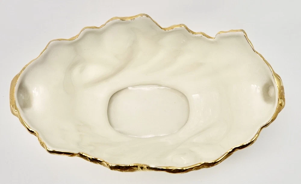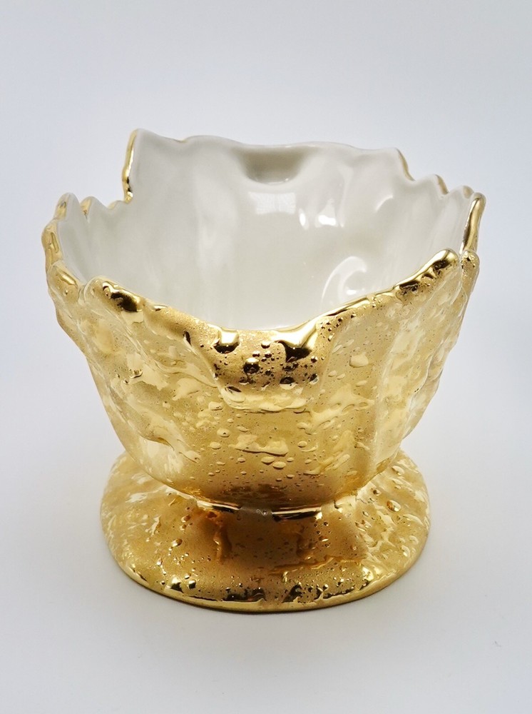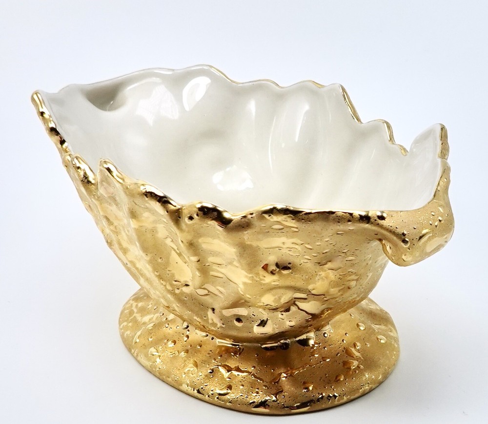 Preloved Weeping Gold 22K Dixon Art Studio Footed Planter Dixon Art Studios China was made at Bel Terr China in East Palestine, Ohio Vintage Porcelain Hand Made In United States Mid-Century Modern Circa 1960s Materials: 22K Gold, Porcelain measures 8" long, 3.5" - 3.75" tall and 4" wide
