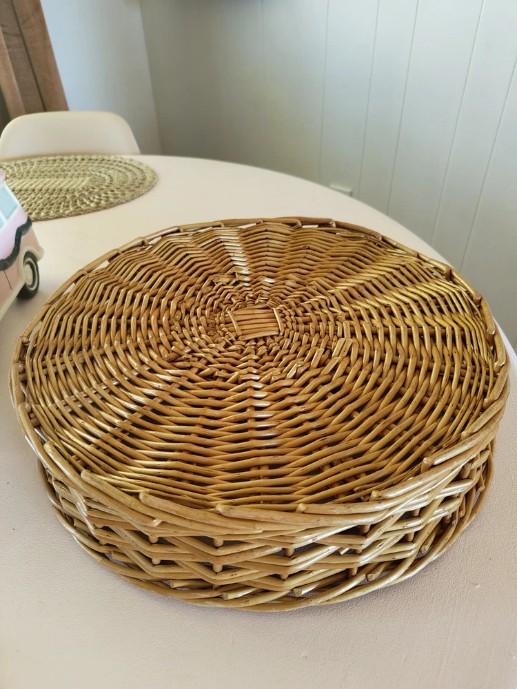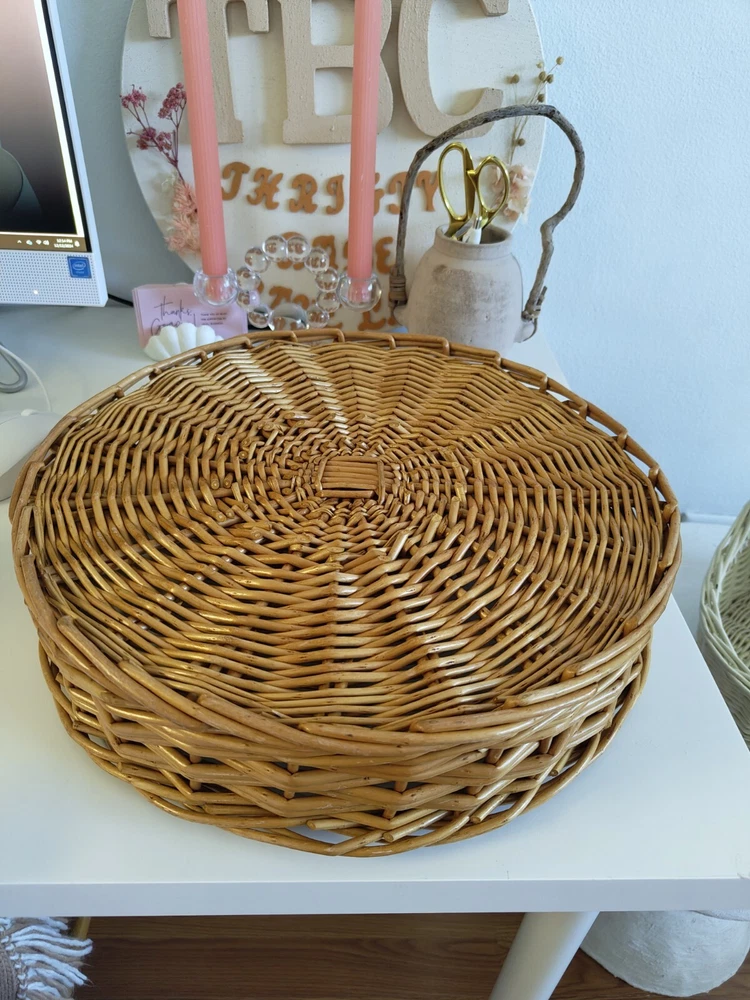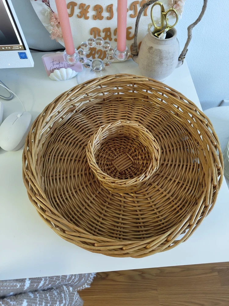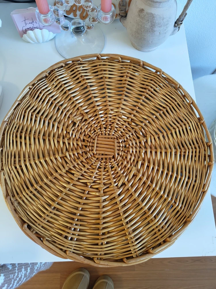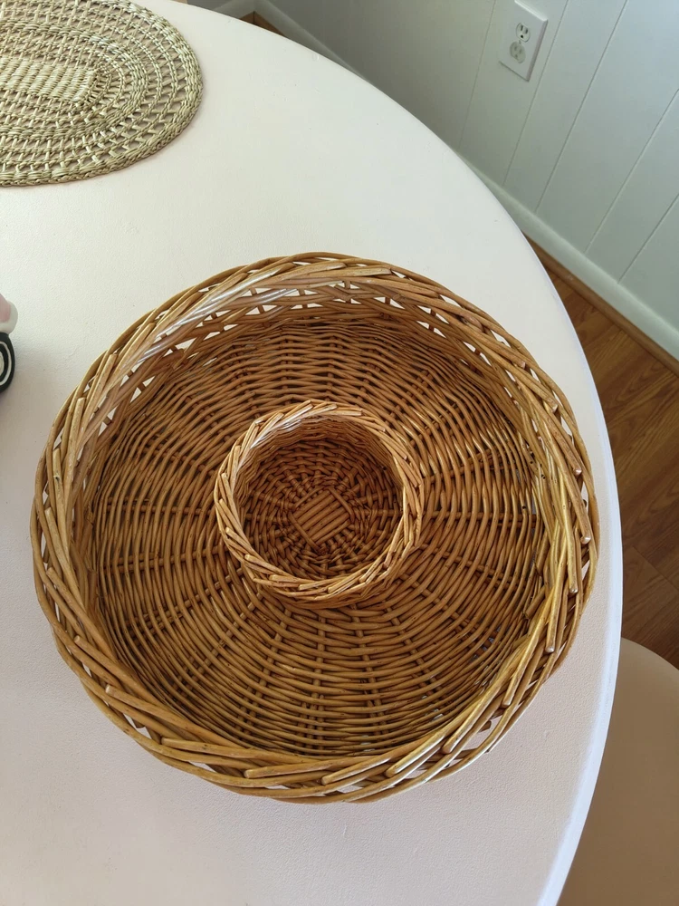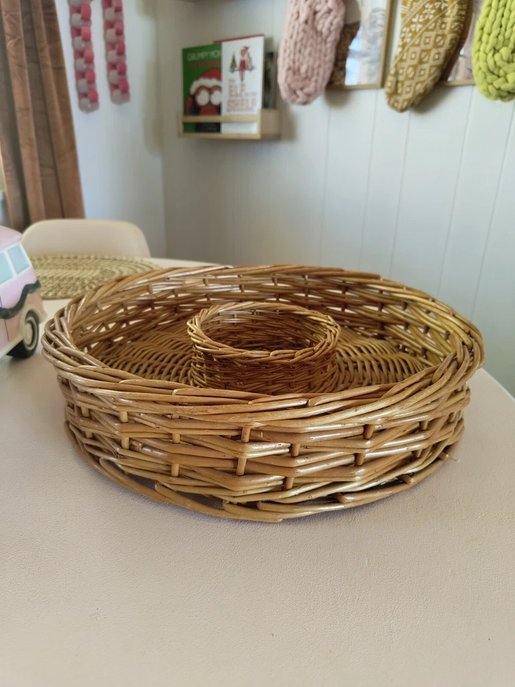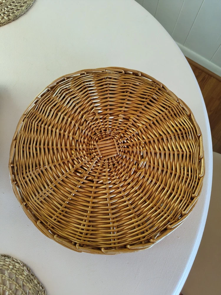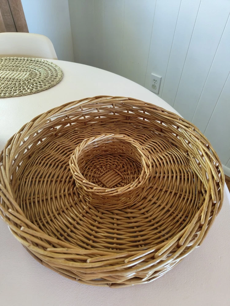 The round rattan chip dip serving basket has a diameter of 15 inches and is perfect for serving your favorite dips or small appetizers. The light yellow wood tone and beige color give it a boho vibe. It is made of high-quality rattan material and has a sturdy build. This serving tray is perfect for all occasions and is sure to impress your guests. Great to excellent vintage/pre owned condition. Has some minor wear and tear but nothing significant. Please check out the images. Items ship quickly and are packaged with great care to ensure safe arrival. Positive feedback is always appreciated and please reach out if you have any issues. I will be happy to assist.