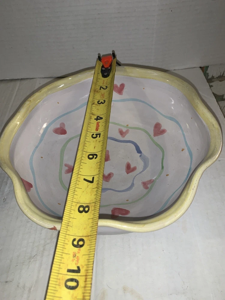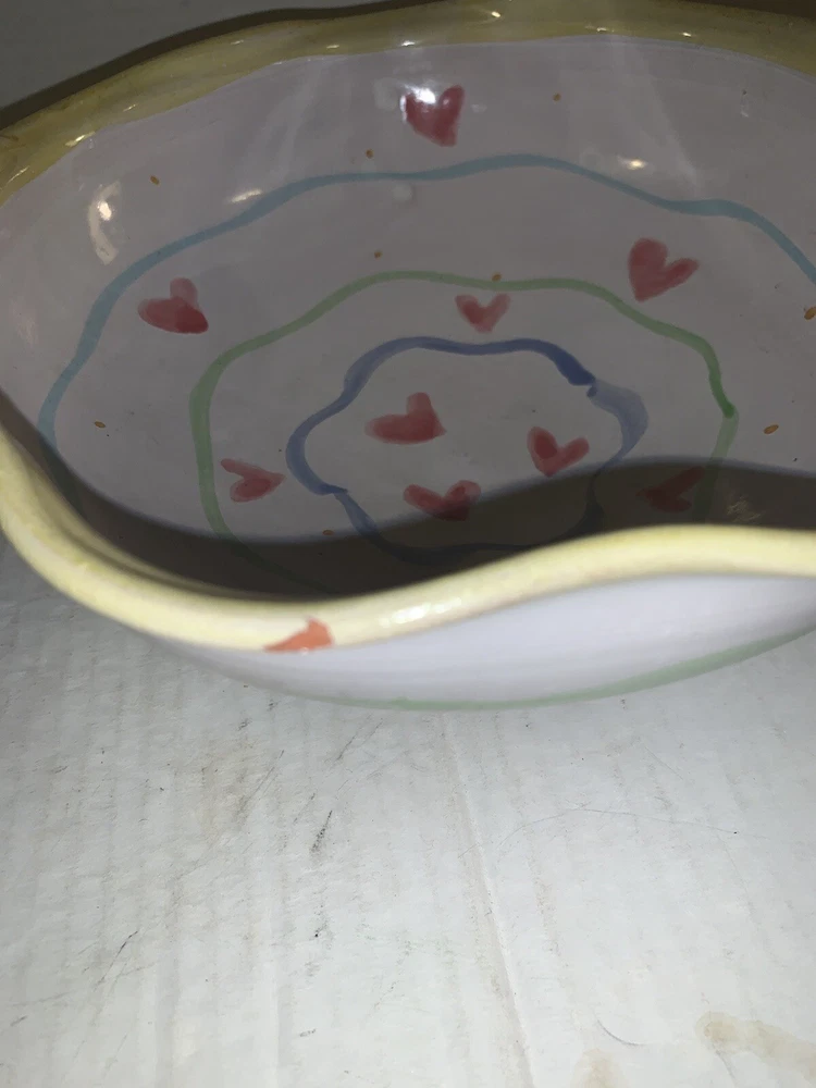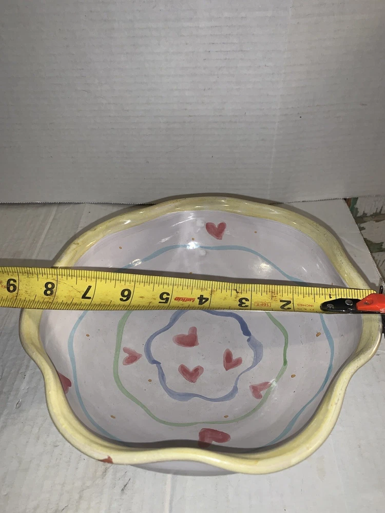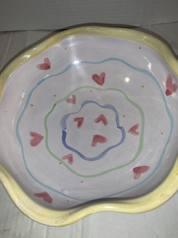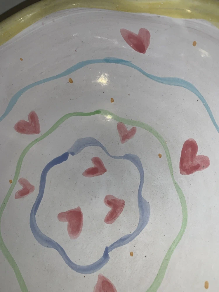 This vintage serving bowl is a unique addition to any collection. The scalloped edges and heart-shaped painted design make it a charming piece for all occasions. Made of high-quality clay, this bowl was hand-painted in the United States during the 1980s, giving it a vintage touch. The bowl's origin is America, and it features a colorful tulip pattern. It is a studio art piece and was produced with pottery techniques. The serving bowl comes from a set that includes only this piece. Its brand is signed, and it is perfect for lovers of vintage and clay pottery. There’s a small imperfection see photos