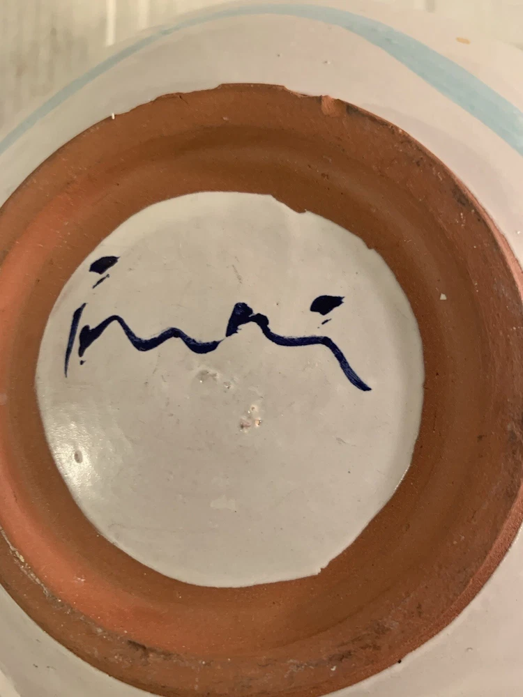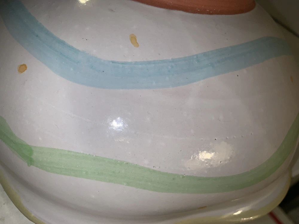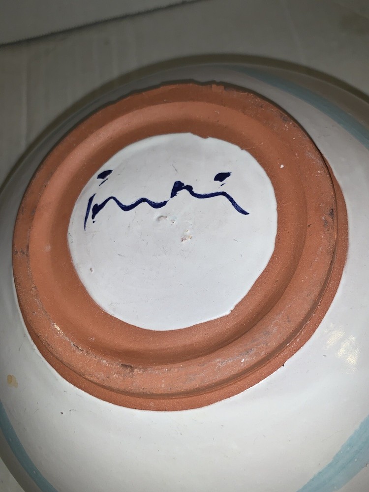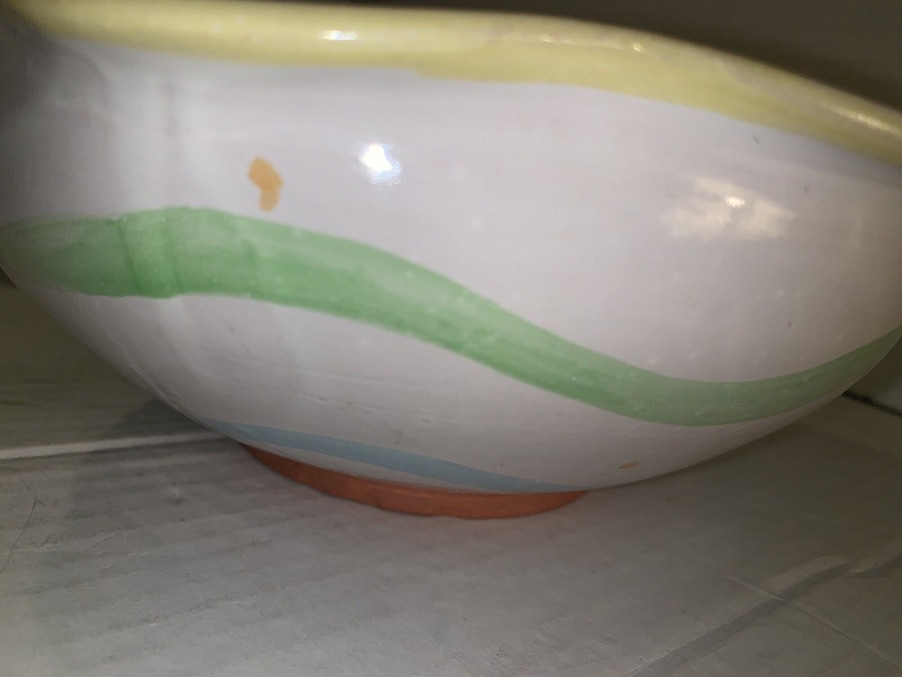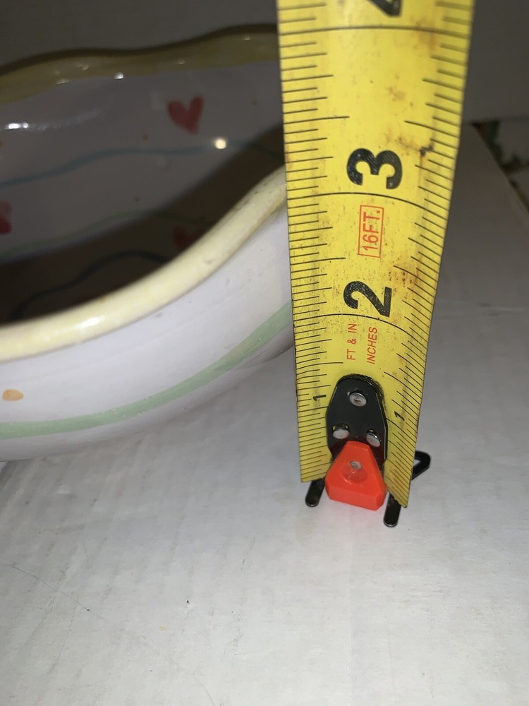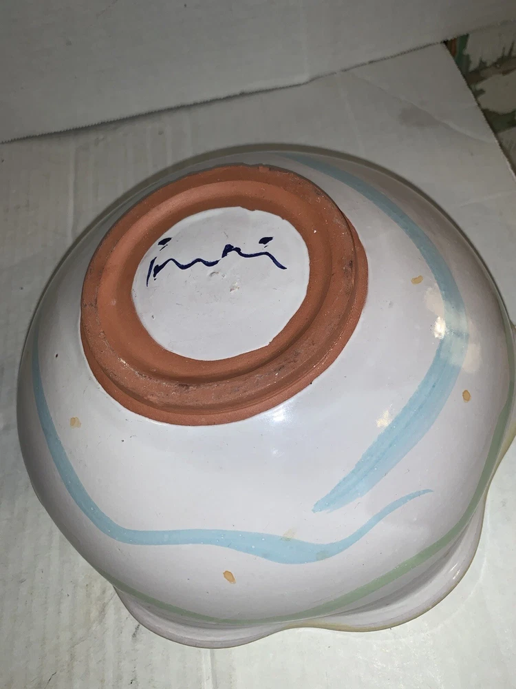 This vintage serving bowl is a unique addition to any collection. The scalloped edges and heart-shaped painted design make it a charming piece for all occasions. Made of high-quality clay, this bowl was hand-painted in the United States during the 1980s, giving it a vintage touch. The bowl's origin is America, and it features a colorful tulip pattern. It is a studio art piece and was produced with pottery techniques. The serving bowl comes from a set that includes only this piece. Its brand is signed, and it is perfect for lovers of vintage and clay pottery. There’s a small imperfection see photos