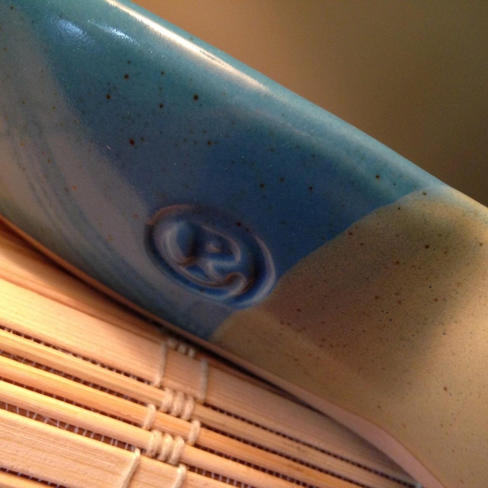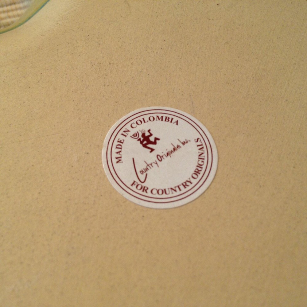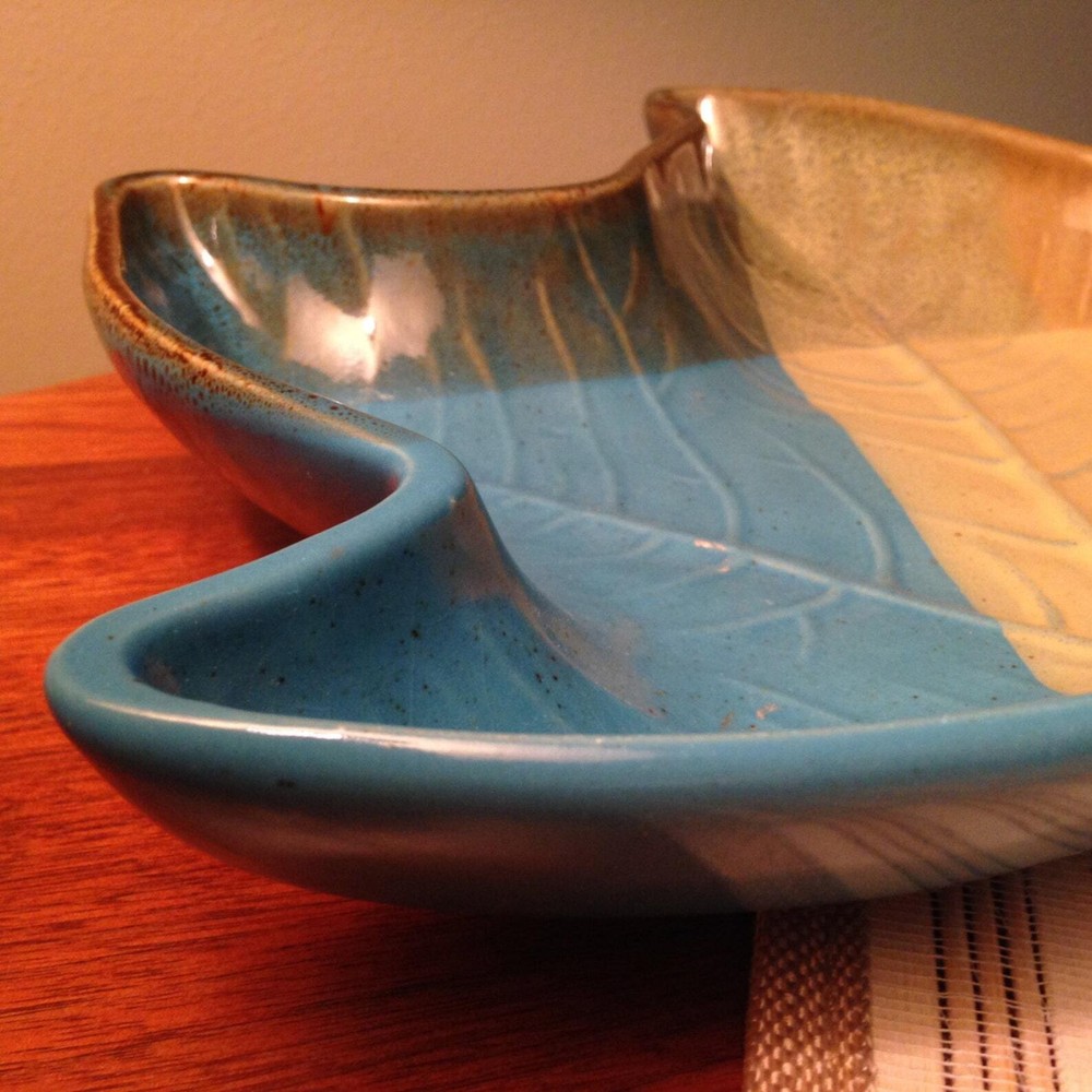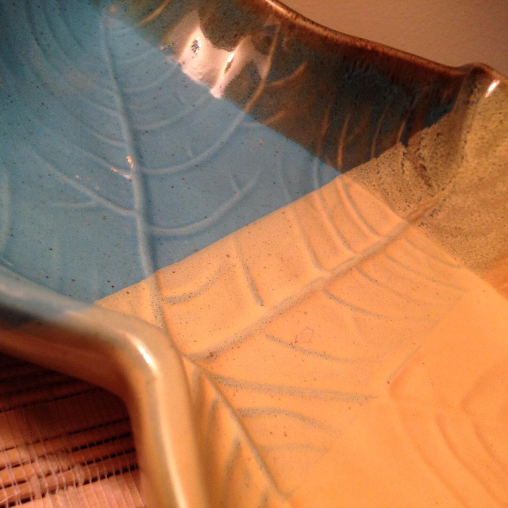This is a colorful stoneware leaf shaped dish in three colors with a raised vein design in great vintage condition. Use for serving or display. Made by Country Originals, Inc. in Columbia. Label on bottom, stamped on the side. Measures 13x10.5 inches and 1.5 inches deep.