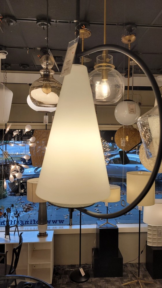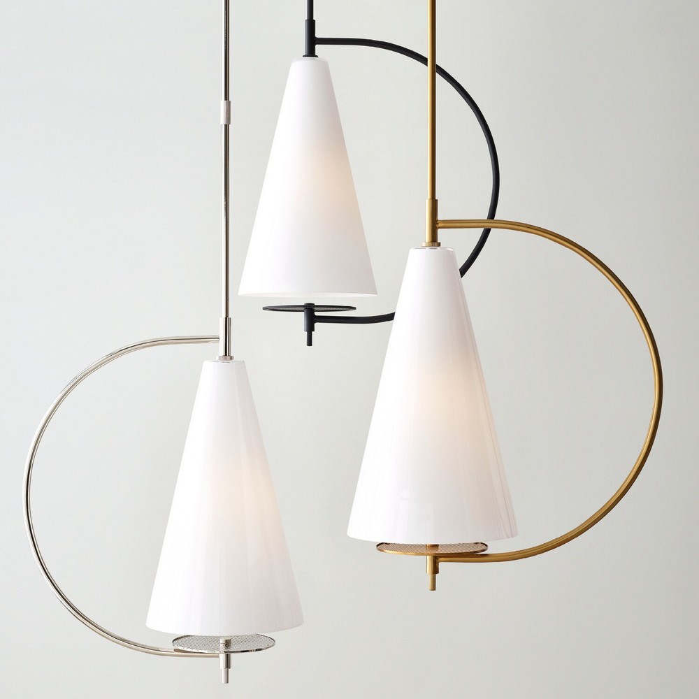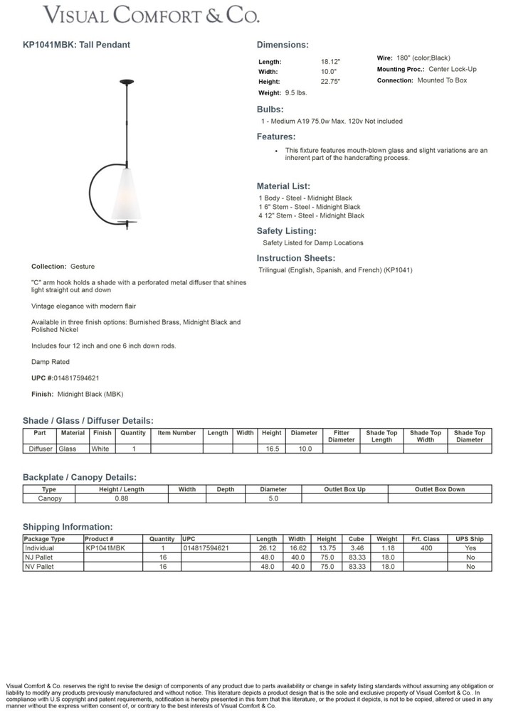 Original Price $549.00 Kelly by Kelly Wearstler Gesture 1 Light 10 inch Midnight Black Pendant Ceiling Light by Visual Comfort Studio Collection SKU: KP1041MBK A dramatic and architectural take on Kelly's signature use of mixed metals and geometric forms, Gesture gives the appearance of asymmetrical balance. These refined and bold pendant lights juxtapose organic feminine curves with sleek masculine precision. The "C" arm hook holds an opal glass shade with a perforated metal diffuser at the base of the lamp. The diffuser shines light straight out and down, ensuring gentle, even distribution of the light. Brand: Visual Comfort Studio Collection Brand Category: Pendant Brand Previously: Generation Lighting Brand Product Description: Tall Pendant Designer: Kelly Wearstler Shipping Method: Ground SKU: KP1041MBK UPC: 014817594621 Electrical and Operational Information Lamping Included: Bulbs Not Included Lamping Type: A19 Lead Wire Length: 180 Primary Number of Bulbs: 1 Socket: Medium Total Number of Bulbs: 1 Voltage: 120 Wattage Max: 75.00 Dimensions and Measurements Backplate/Canopy Extension: 0.88 Backplate/Canopy Width: 5 Height: 22.75 Length: 18.13 Maximum Adjustable Height: 84.5 Weight: 9.50 Width: 10 Country of Origin: China Title 24: Yes UL Ratings: cETL Damp