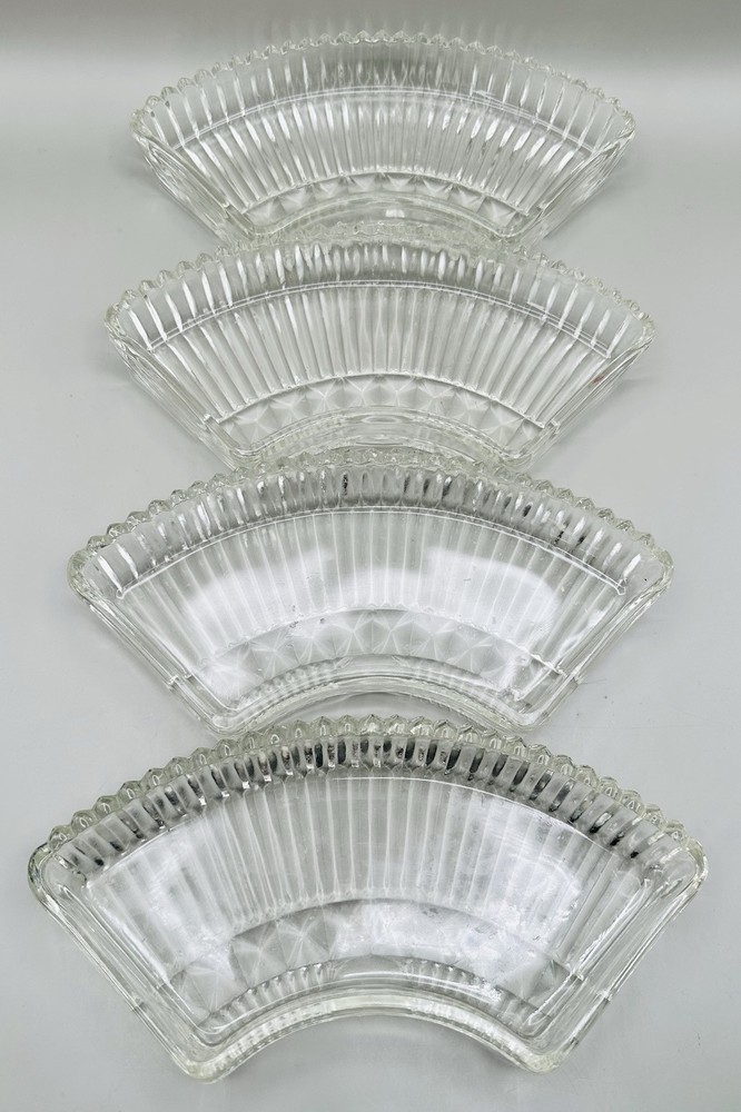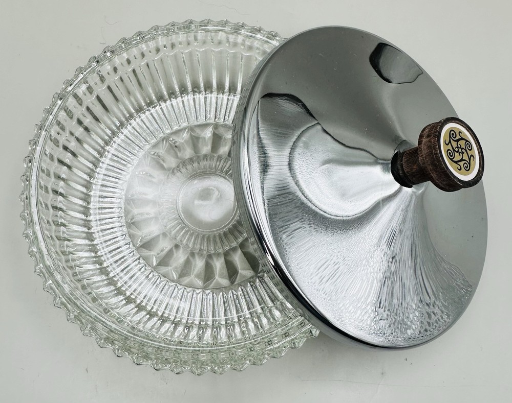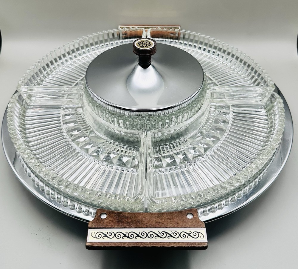 1950’s Kromex 14” 7pc Lazy Susan Set. This lazy susan has 4 ribbed quarter-circle rounded dishes surrounding a circular dip bowl with a chrome-topped lid. Base rotates smoothly for easy access to contents such as condiments, appetizers or veggies. Measures approximately 14” in diameter and approximately 4" tall. Set is in excellent condition; glass has a lustrous sheen, with a stunning finish on chrome base and lid.