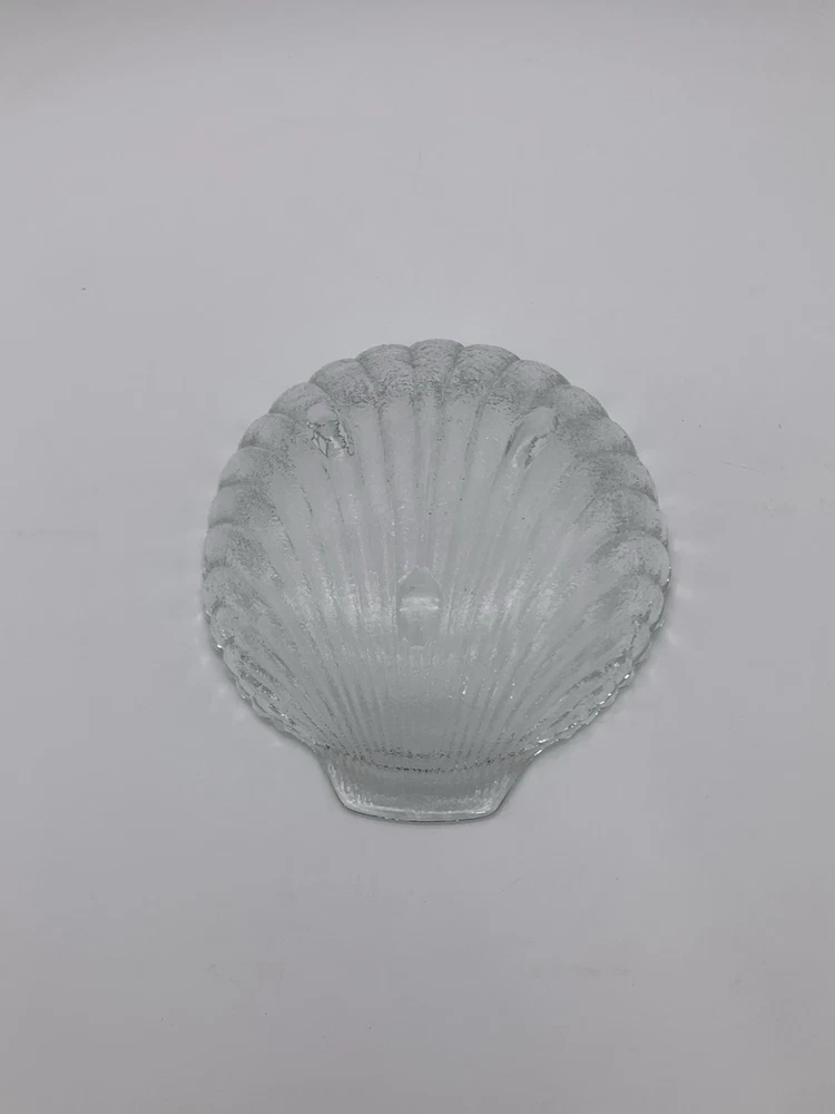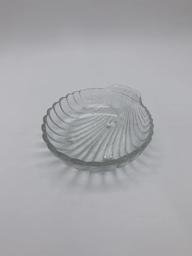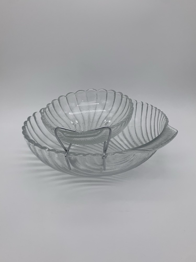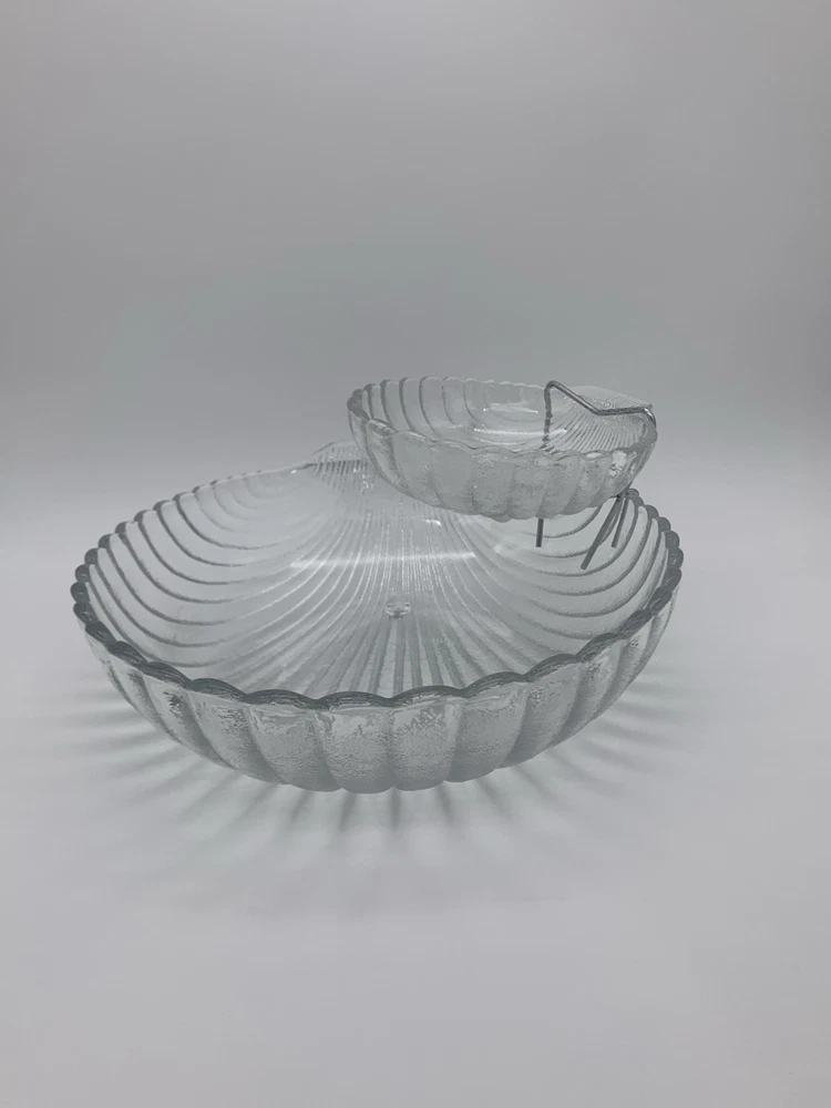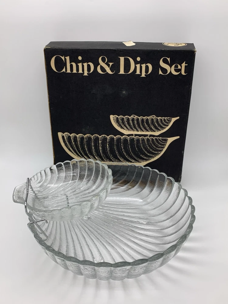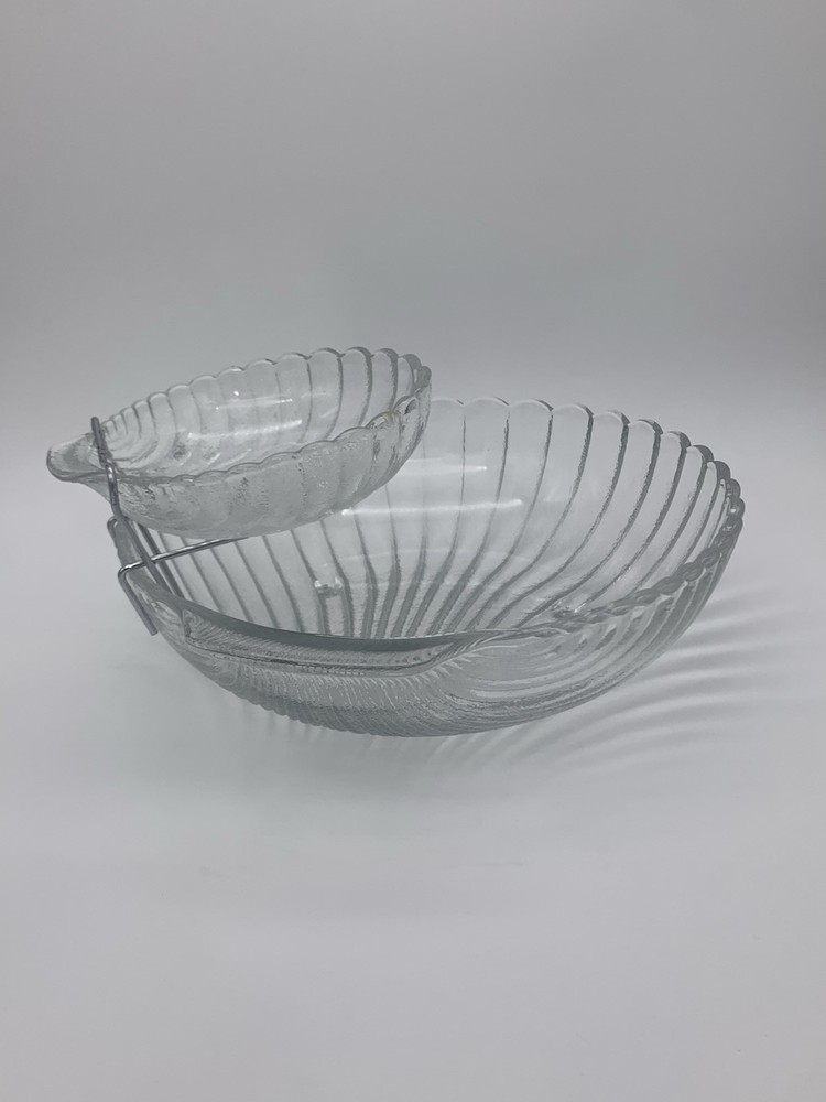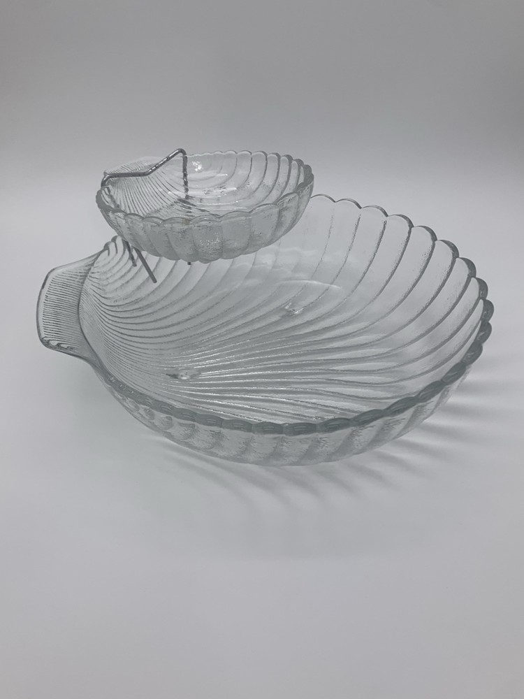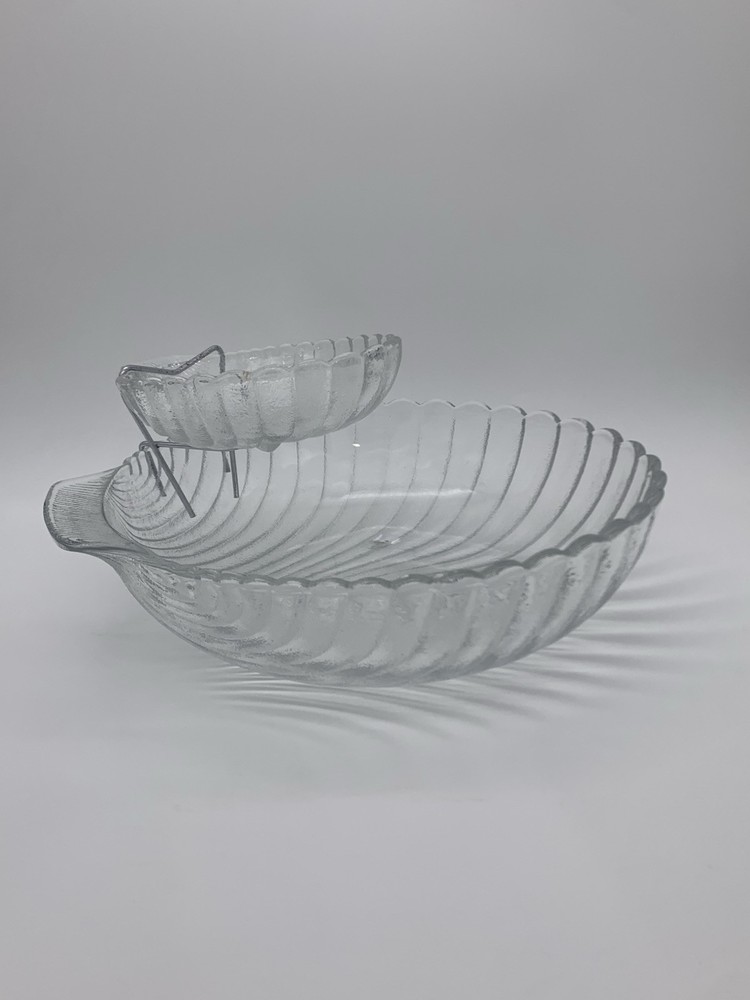 This is a vintage 1983 Leonard Chip & Dip Serving Set in a large clear shell shape with a scalloped edge. Each includes a single compartment for serving, with a diameter of 11" for the larger dish and 6" for the smaller dish. The set is made of glass, features handles, and is designed with a triple footed bottom. This elegant serving set is perfect for various occasions and various complementary snacks like potato chips, tortilla chips or vegetables with dip such as salsa, guacamole or creamy dips and is easy to fill and refrigerate. Excellent Vintage Condition!