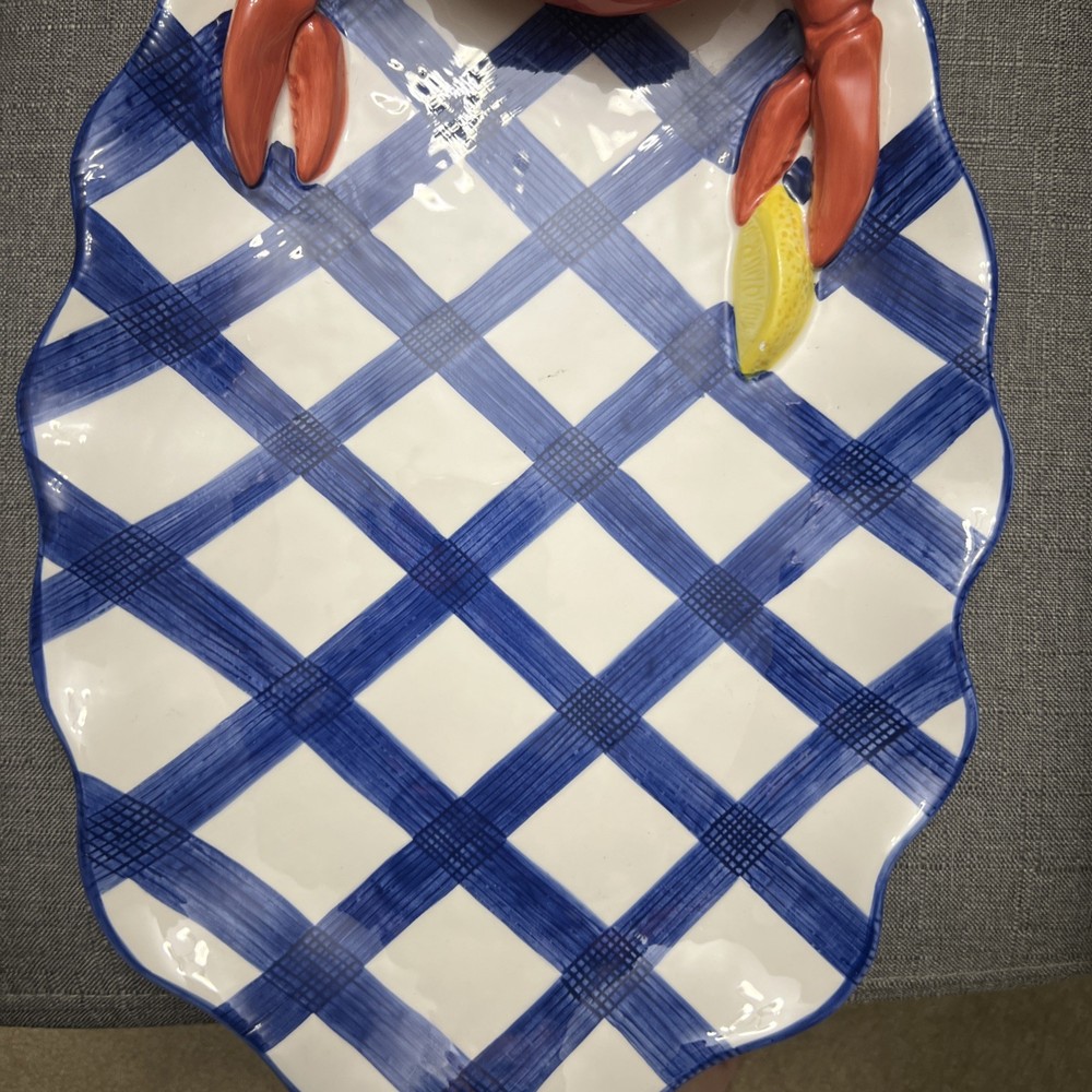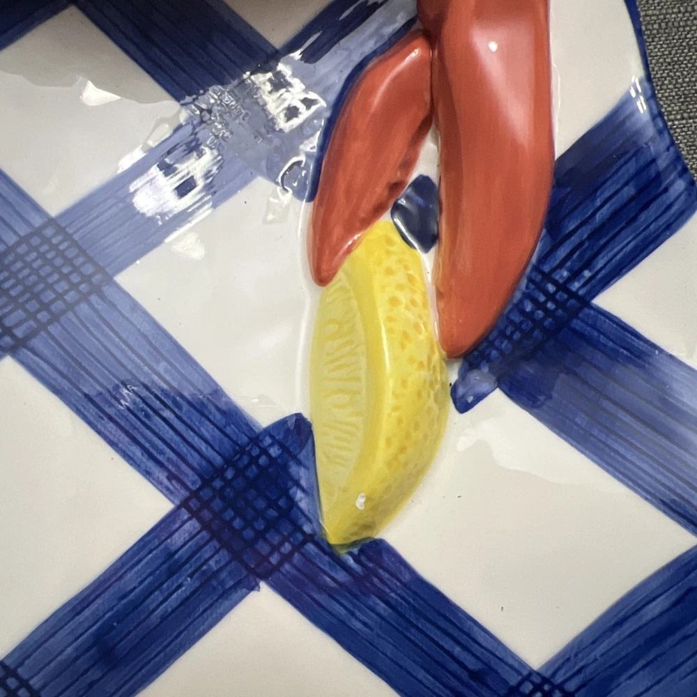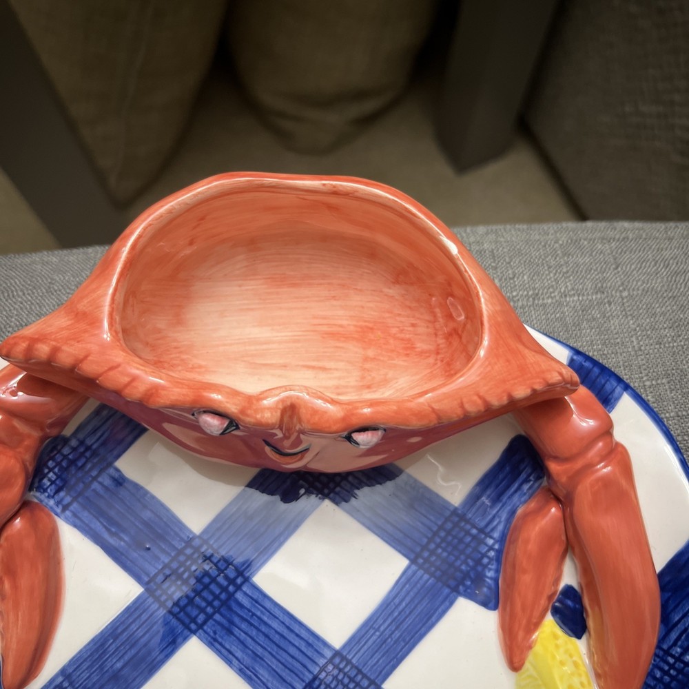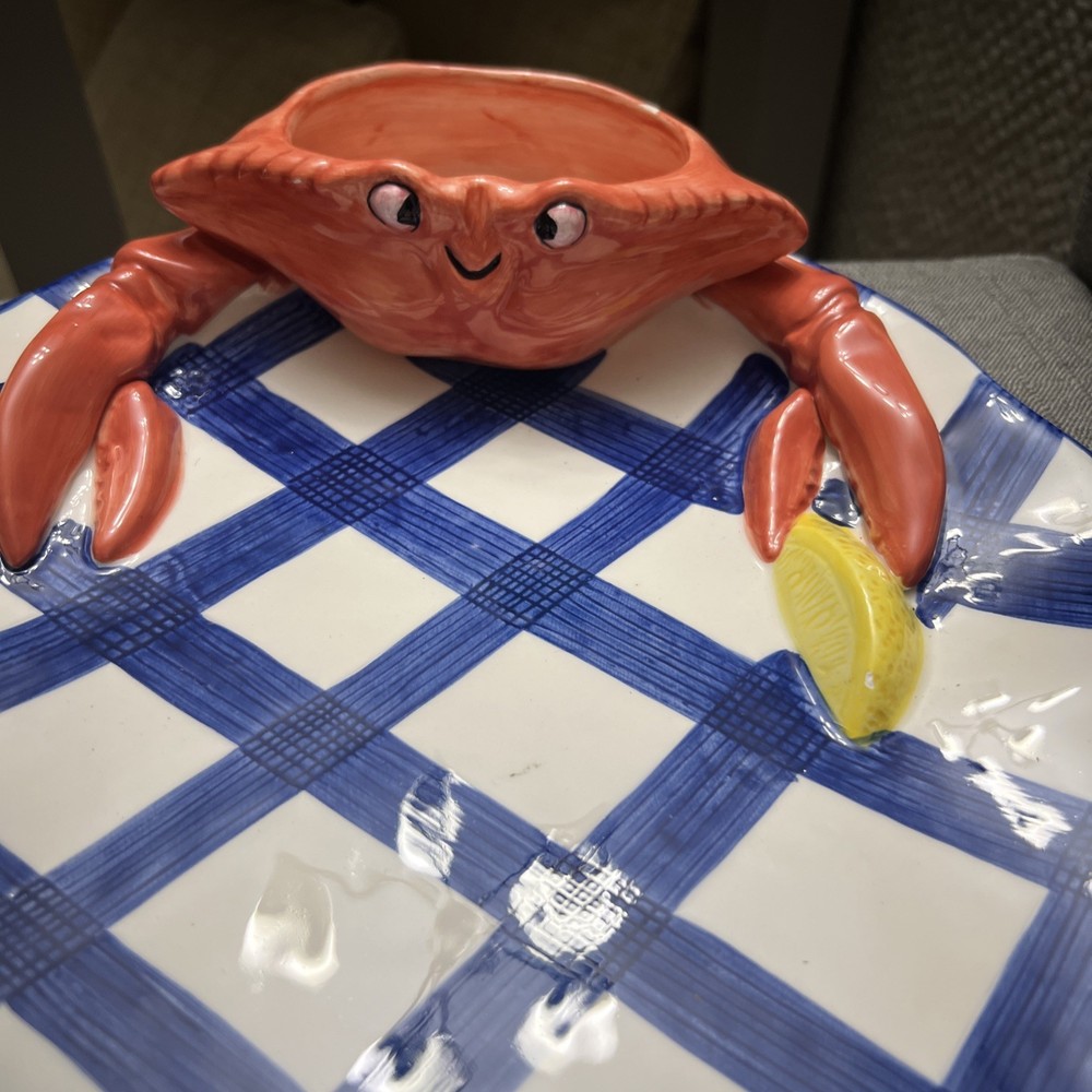 This vintage 1990's Lotus ceramic 3D seafood dip novelty platter is a unique and colorful addition to any home. The oval shape, large size, and glossy finish make it perfect for all occasions, while the multicolor seafood pattern adds a whimsical touch. Made of ceramic and weighing 2 lbs, this platter is not only functional but also stylish, fitting in with a country themed decor. The 17" length and 12" width make it ideal for serving a variety of snacks and dips at picnics or parties.