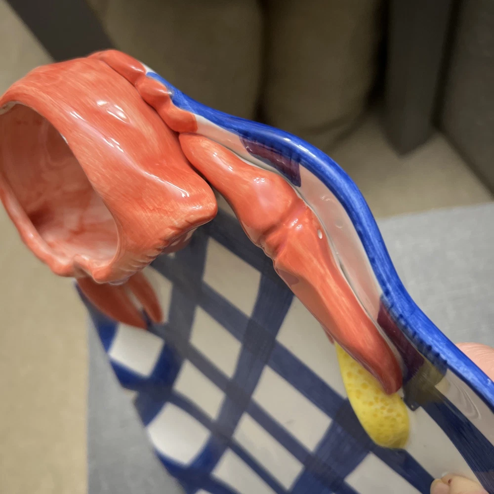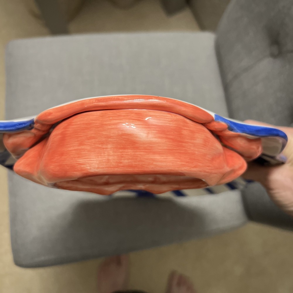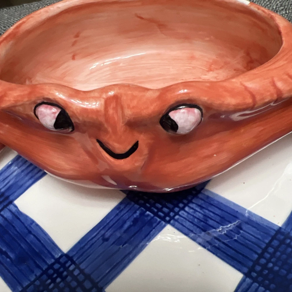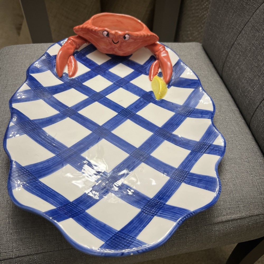 This vintage 1990's Lotus ceramic 3D seafood dip novelty platter is a unique and colorful addition to any home. The oval shape, large size, and glossy finish make it perfect for all occasions, while the multicolor seafood pattern adds a whimsical touch. Made of ceramic and weighing 2 lbs, this platter is not only functional but also stylish, fitting in with a country themed decor. The 17" length and 12" width make it ideal for serving a variety of snacks and dips at picnics or parties.