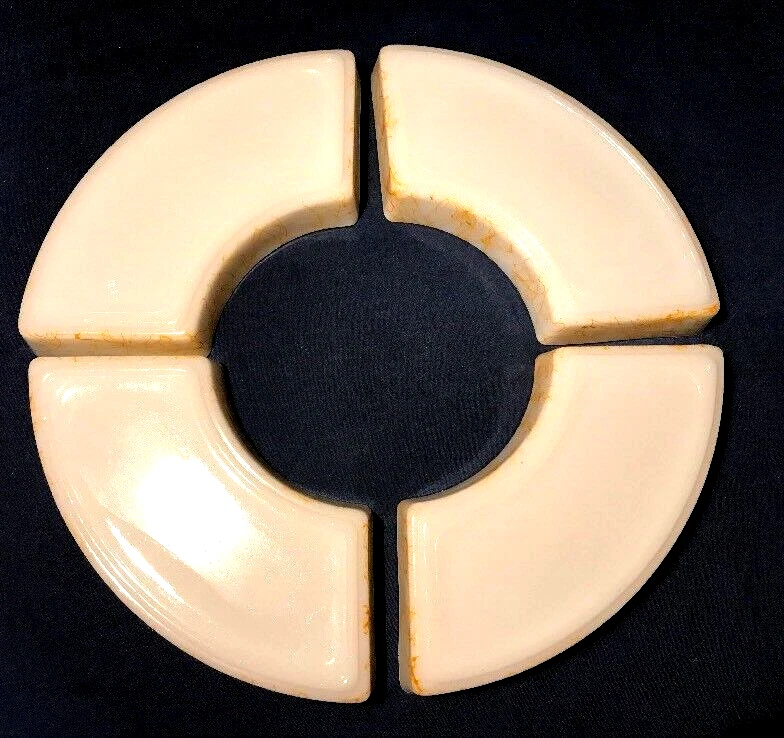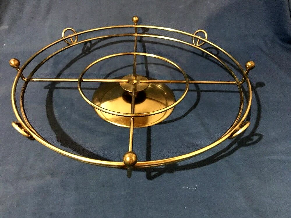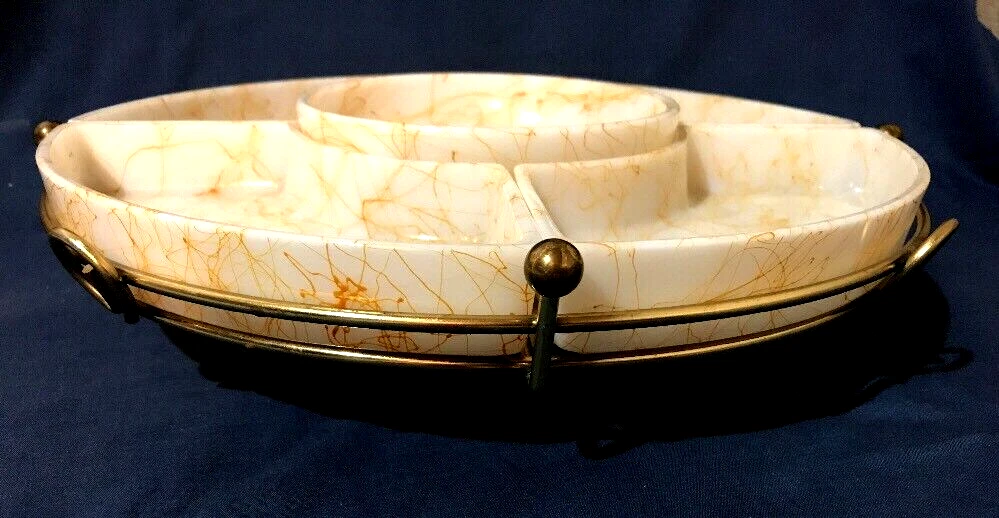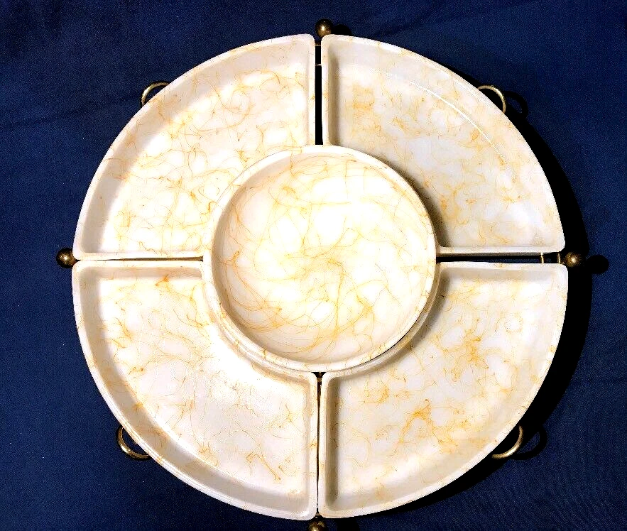 Beautiful spaghetti drizzle pattern in orange on white. This 6 pc set has no markings to identify the manufacturer. Includes 4 tray dishes that surround a center bowl all setting in a brass rack. Measurements: Center Bowl: 6" dia x 1-3/4" tall 4 Tray Dishes: 9" long x 3-1/2" wide x 1-3/4" tall Rack: 14' Dia x 3" tall Thanks for considering my item. I never use stock photos. The item you see in the picture(s) is the actual item you will be bidding on. Always sold as is, but I ensure customer satisfaction. You come first. I allow my feedback to speak for me. Payment: PayPal, within 3 days of purchase. Shipping: USPS Priority Mail. I ship within one day of receiving payment, often the same day. I can accommodate special requests at buyer’s expense & combined shipping is welcomed. I do not ship on Saturday. Return Policy: If you are not happy with your purchase please give me the opportunity to make it right. Buyer has 30 days to return the item after sale. Buyer pays return shipping